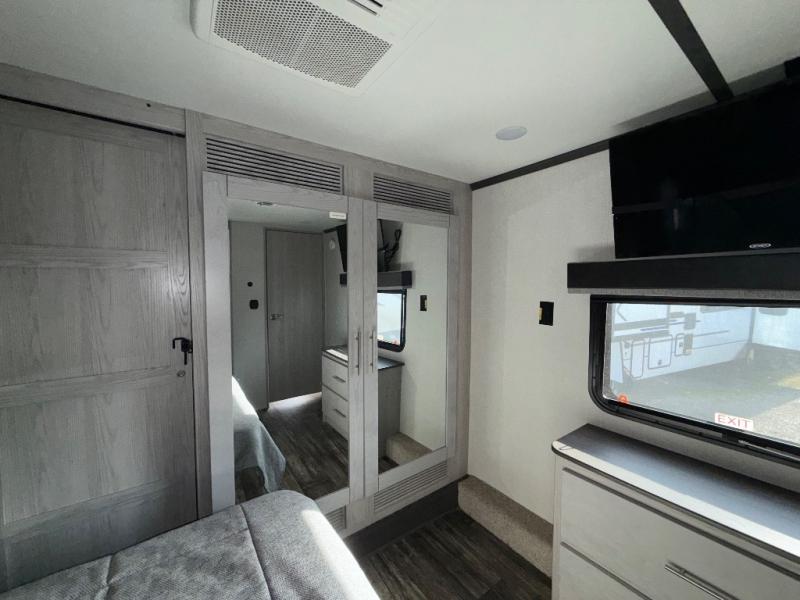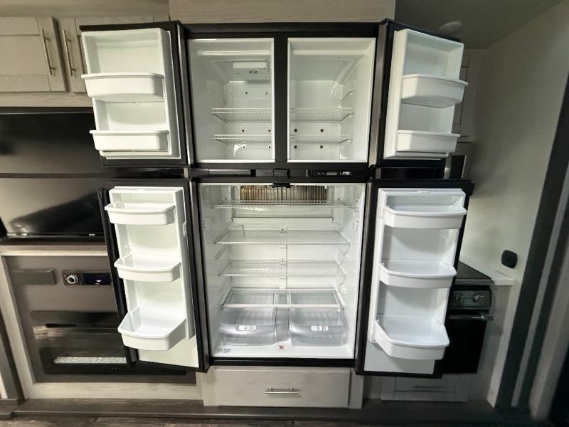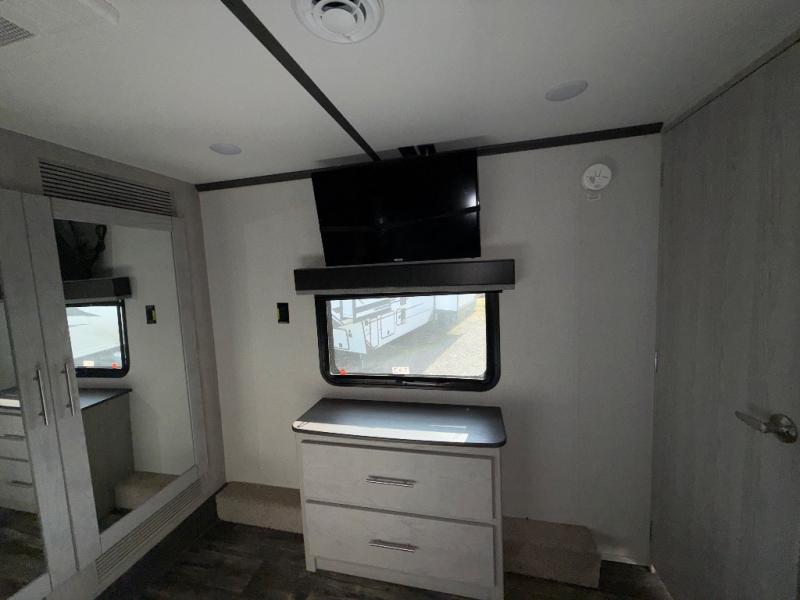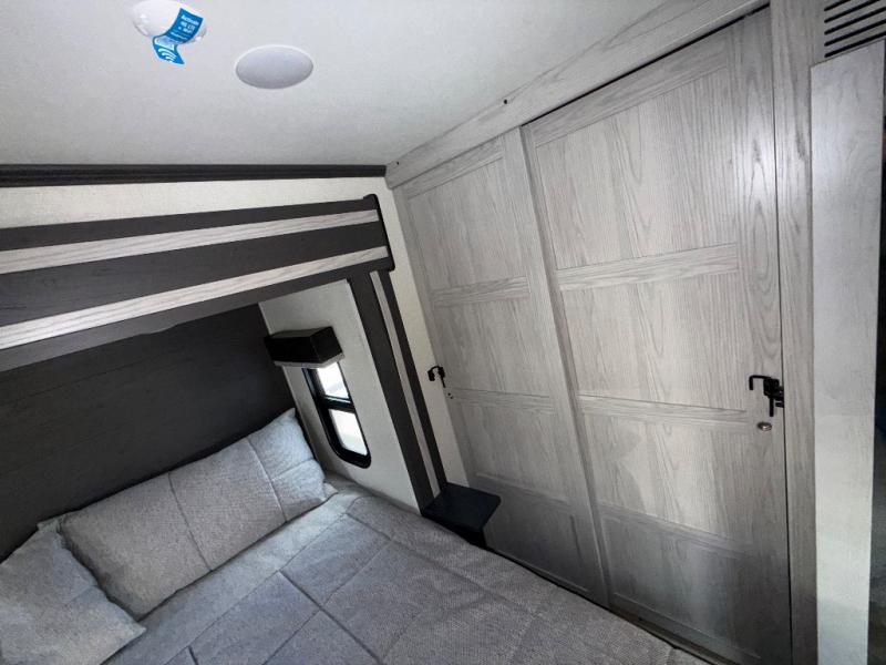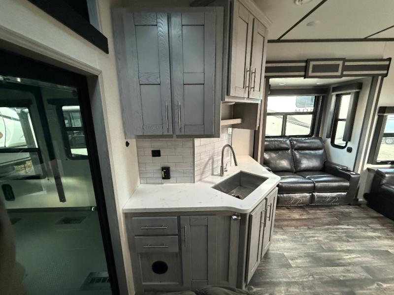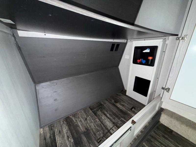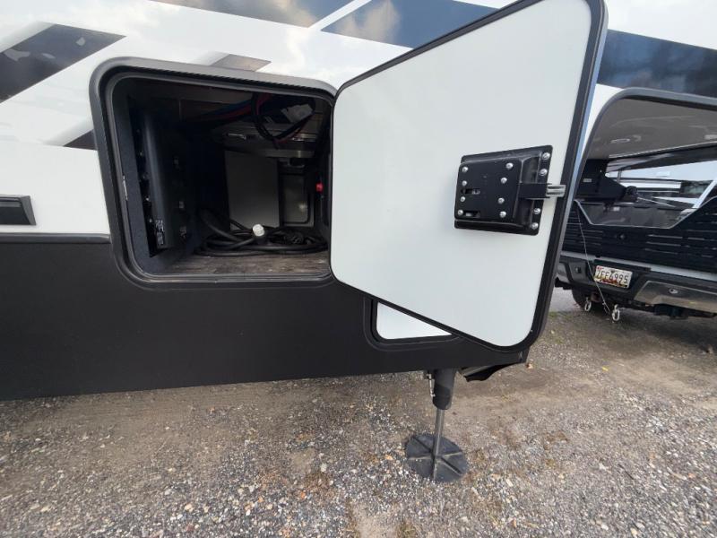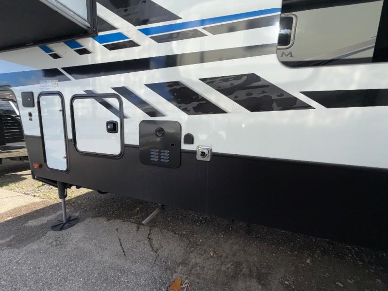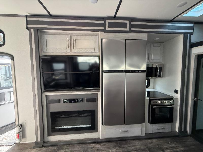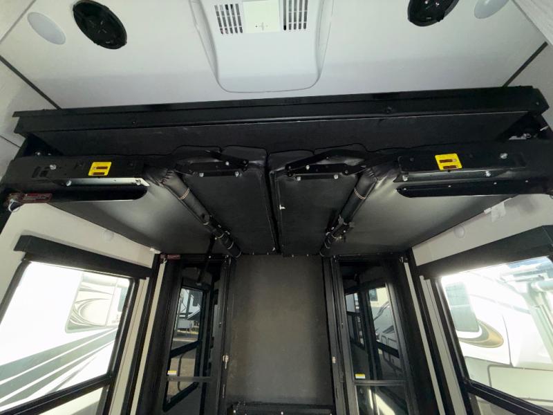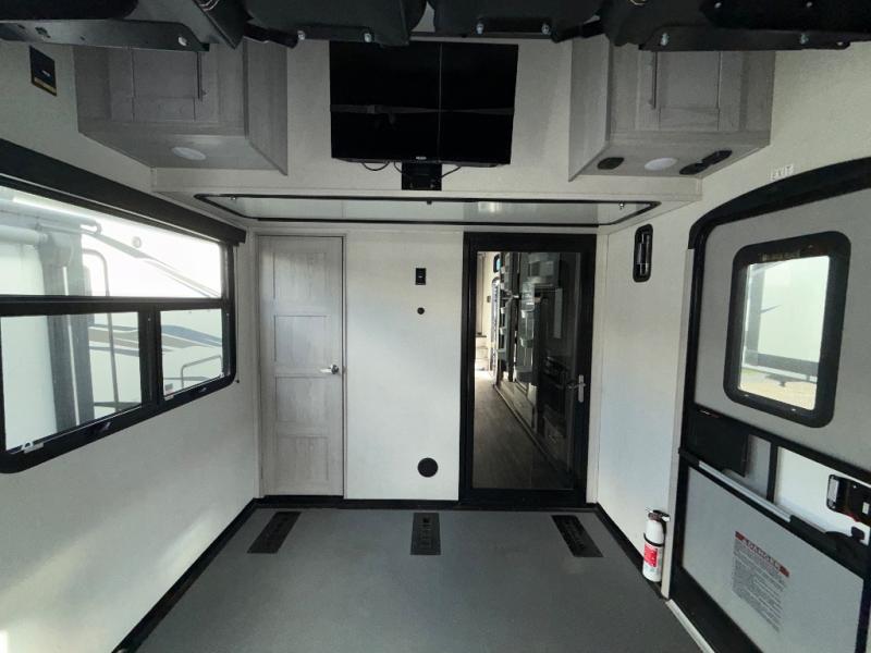 This toy hauler is packed with handy features! Starting with the 11' garage area that has dual opposing sofas with a queen bed above them, an LED TV, a loft with a bunk mat, a half bathroom, and one of the dual entrance doors to the unit. The kitchen slide not only opens up the living space, but also has a three burner range with a convection microwave above, a stainless steel refrigerator, and an entertainment center with an LED TV and fireplace all of which is across from the theater seating slide and a hide-a-bed sofa. There is even an outdoor entertainment center with an LED TV, a pull-out cooktop, and a refrigerator to keep your beverages cold while you watch the big game. When you're ready to wind down your nights, clean up in the dual entry bathroom with the residential shower with a seat then head directly into the front private bedroom to lay your head on the residential queen bed slide with USB ports on either side, plus there is a front master closet that is prepped to add an optional washer and dryer!