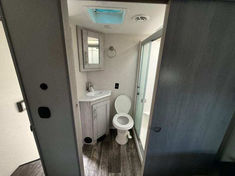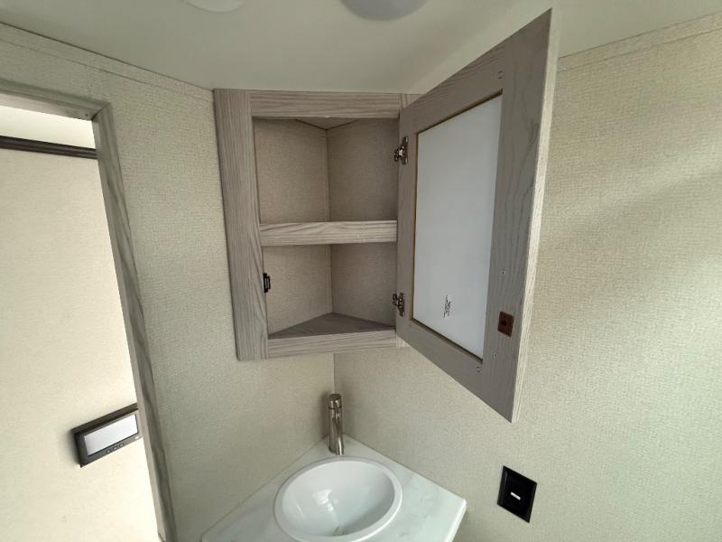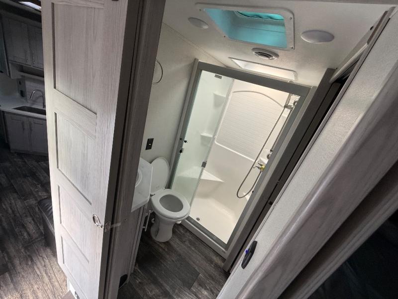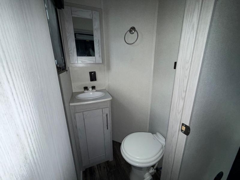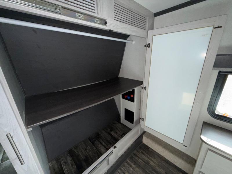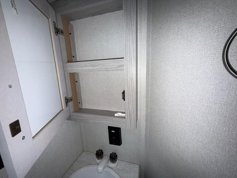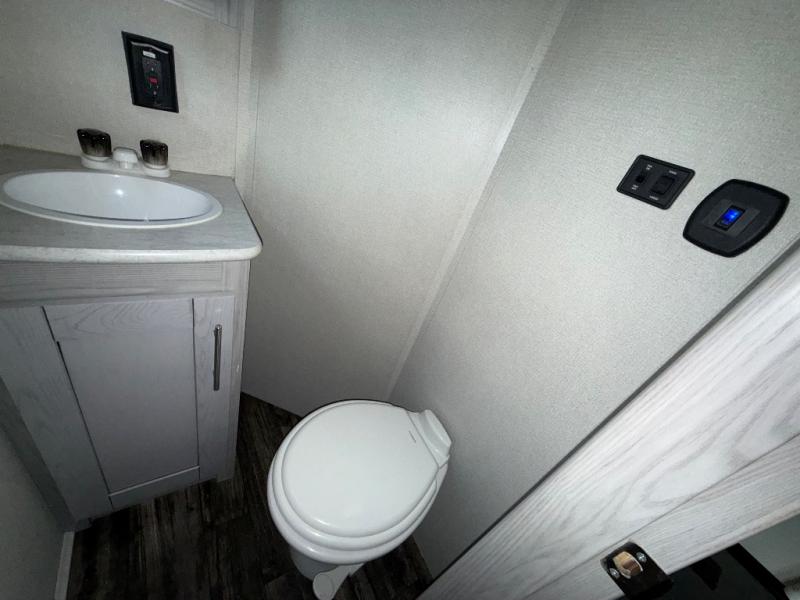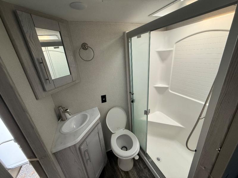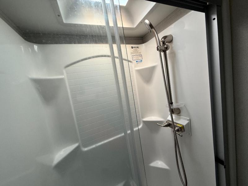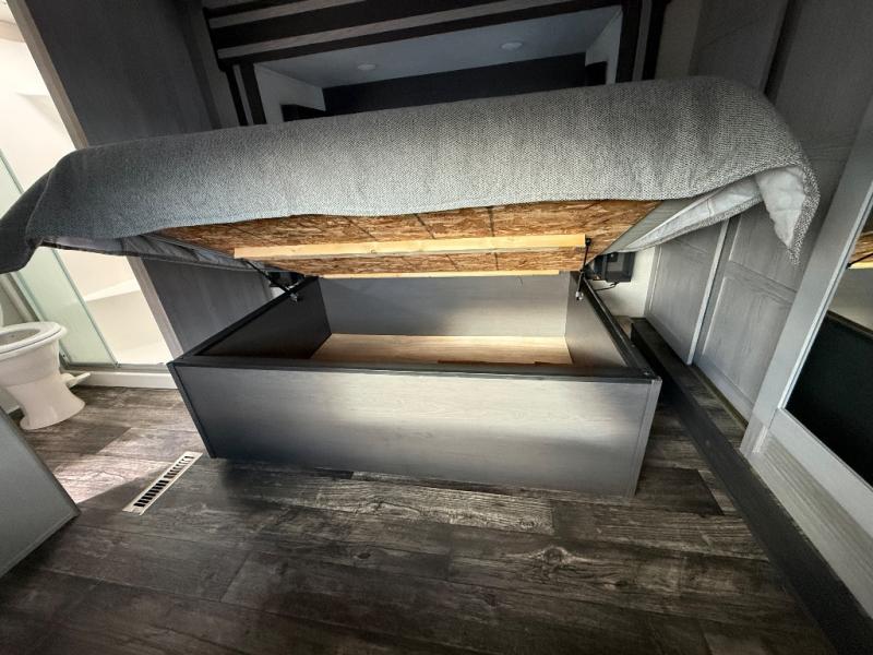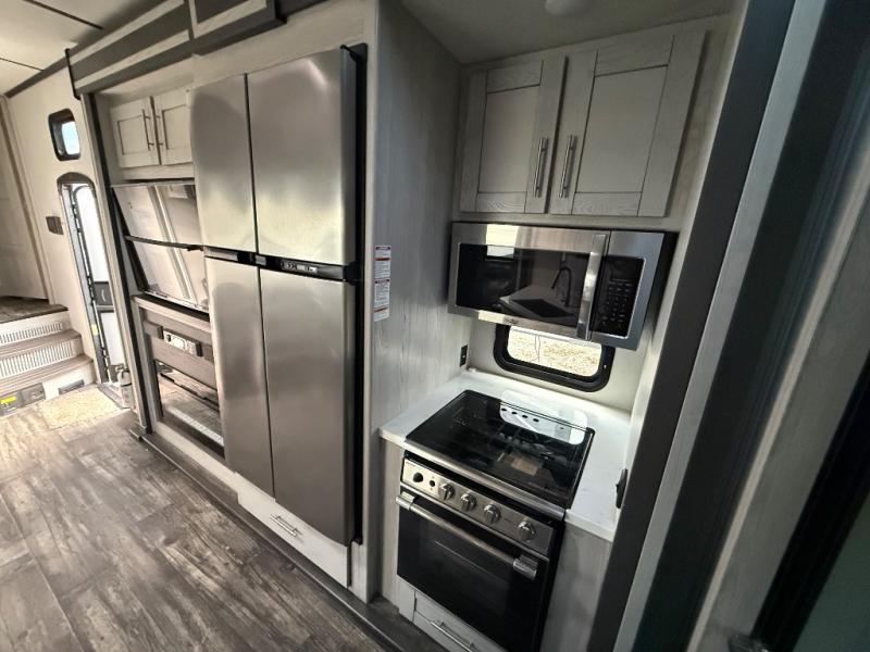 This toy hauler is packed with handy features! Starting with the 11' garage area that has dual opposing sofas with a queen bed above them, an LED TV, a loft with a bunk mat, a half bathroom, and one of the dual entrance doors to the unit. The kitchen slide not only opens up the living space, but also has a three burner range with a convection microwave above, a stainless steel refrigerator, and an entertainment center with an LED TV and fireplace all of which is across from the theater seating slide and a hide-a-bed sofa. There is even an outdoor entertainment center with an LED TV, a pull-out cooktop, and a refrigerator to keep your beverages cold while you watch the big game. When you're ready to wind down your nights, clean up in the dual entry bathroom with the residential shower with a seat then head directly into the front private bedroom to lay your head on the residential queen bed slide with USB ports on either side, plus there is a front master closet that is prepped to add an optional washer and dryer!