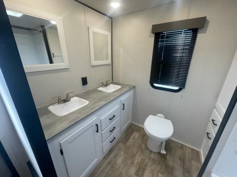 You can hide out for days at a time with this Hideout travel trailer! There is a slide out for extra living space, and the storage below the sofa doubles as seating around the table. Now you'll have three extra seats for dinner time, and they won't even crowd your living space when not in use. The rear bathroom is large and accommodating with its dual-sink vanity, 38" walk-in shower, linen closet, and toilet, and the front private bedroom has a queen-size bed with a laundry chute right next to it for keeping your dirty laundry hidden.