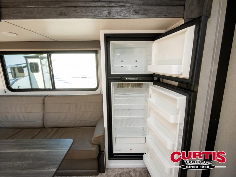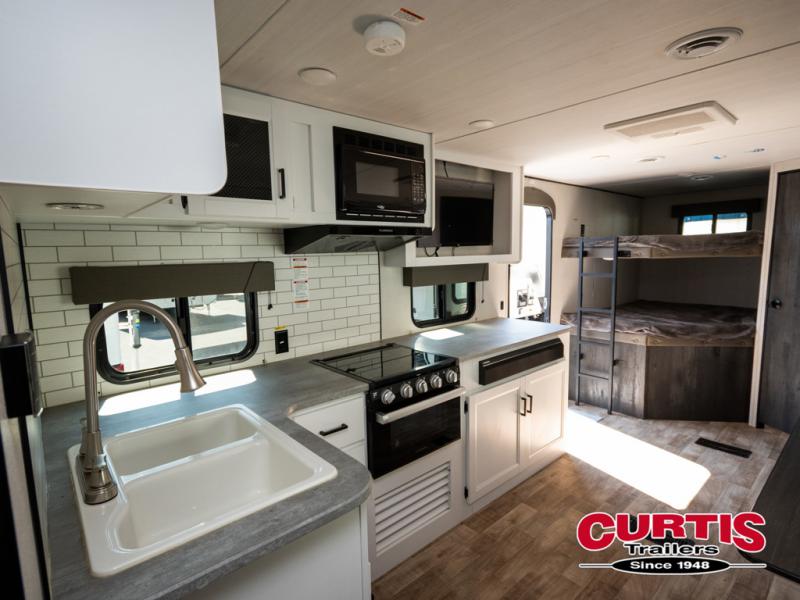 You can take this Hideout travel trailer to all sorts of campsites! It will serve as an excellent home base when you want to spend the weekend adventuring. There is a comfortable queen bed up front in the private bedroom, and the 52" x 74" bunk beds are great for sleeping kids. The bunks are also located right next to the bathroom for their convenience. A 72" sofa with storage and table serves as a jack of all trades because it lets you lounge, sleep, dine, or play. The storage below the sofa also serves as seating space around the table, and you'll find storage access below the bunks too. The large slide out makes room on the interior for you to walk freely from the front to the back.