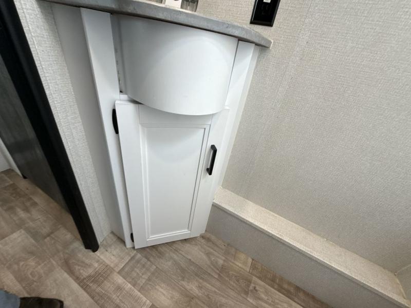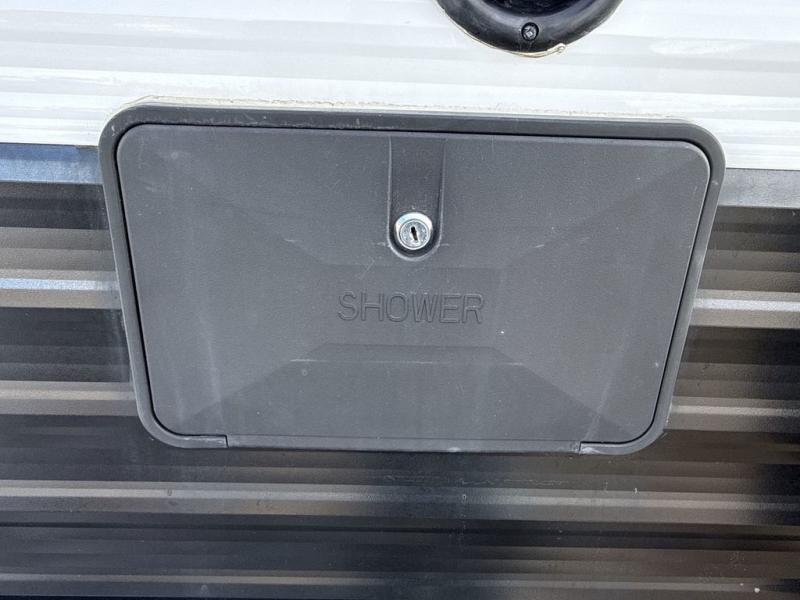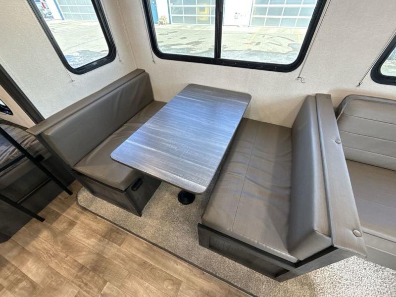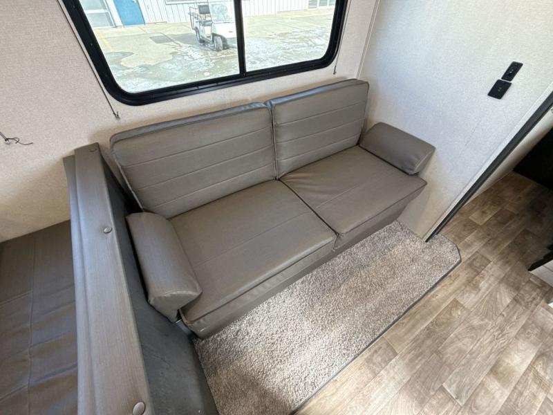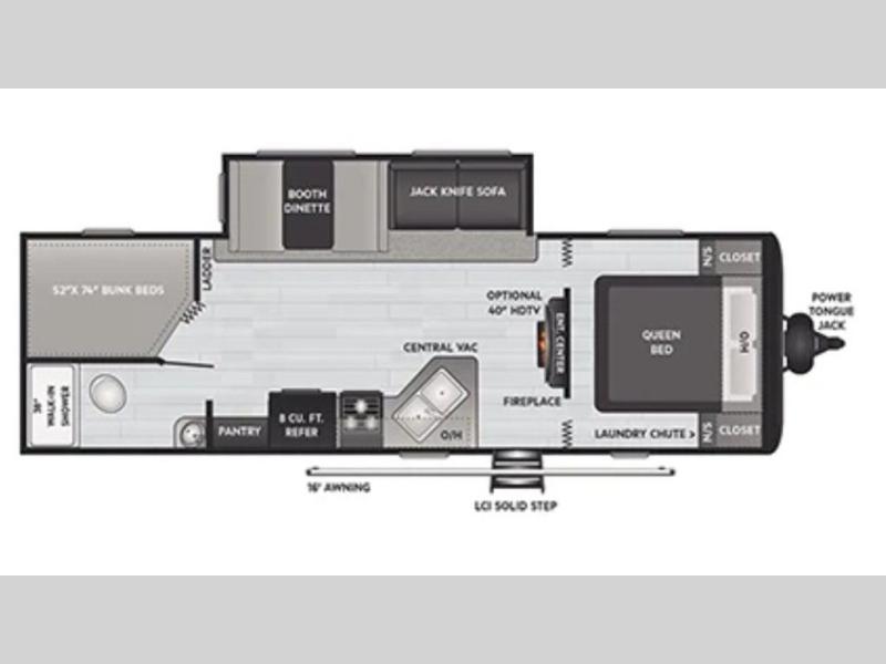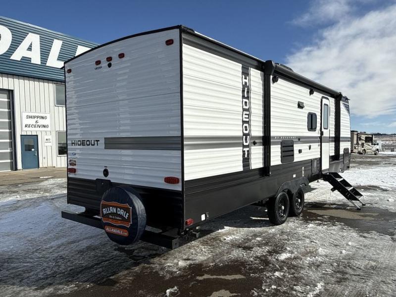 Welcome to your new Hideout travel trailer! It has a great layout ready for a full family or group of friends. The front private bedroom gives you a queen bed that you can rest on each night, and the laundry chute will help you keep your dirty clothes hidden. The large slide in the main living area holds the booth dinette and jackknife sofa, and you'll be able to use these pieces of furniture as beds too. The 52" x 74" bunk beds have a privacy curtain that you can draw when the kids are sleeping, and the 38" walk-in shower is ready to keep all of you clean. You can also add an optional 40" HDTV to the entertainment center so that you can have a movie night whenever you want.