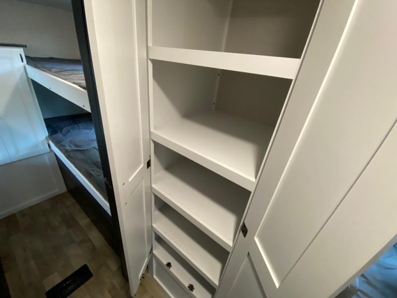 With this Hideout travel trailer, you will have tons of exterior storage! There is a wrap-around storage around the back, and the front has a pass-through storage compartment for even more gear. When you're inside, you'll also notice that you have quite a lot of space to keep items in the bunkhouse closet, kitchen pantry, 8-cubic foot refrigerator, and bedroom closets. The large slide creates more living space, and the central vacuum helps you clean up spills when they happen. This trailer also allows you to add an optional 40" HDTV if you wish.
