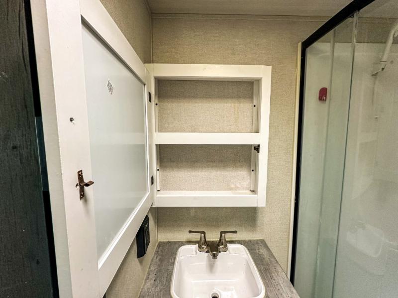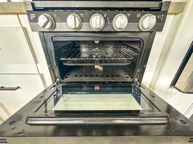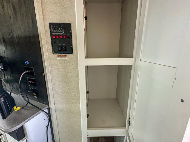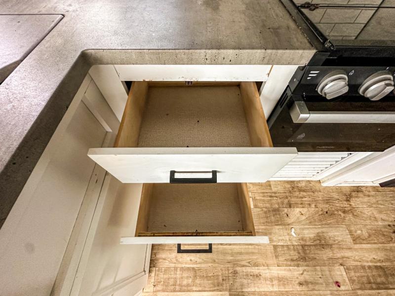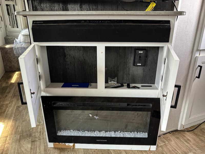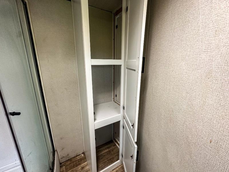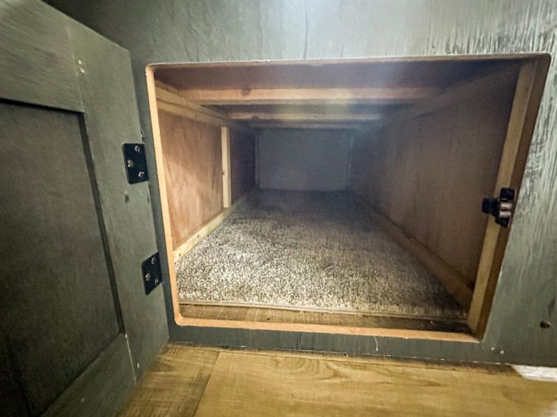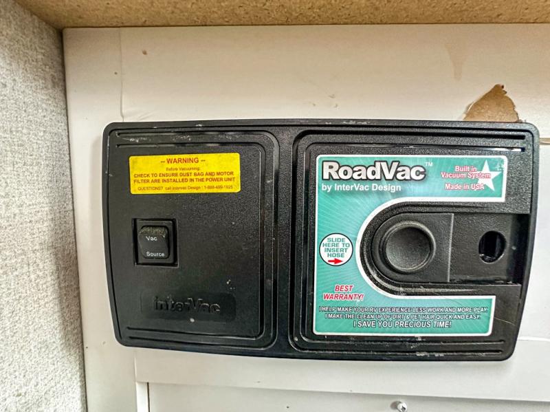 This Hideout travel trailer has an excellent layout, and it offers you a high comfort level with its private bedroom at the front and its private bunkhouse in the back. The bunkhouse contains a queen sofa bed below two flip-up bunks, and there is even a wardrobe and entertainment center in the bunkhouse too. You can swap out the U-shaped dinette for the optional free-standing table with chairs if you wish, and you also have the ability to add an optional tri-fold sleeper sofa next to the dinette on the large slide. The entertainment center in the main living area has a fireplace, and there is a central vacuum in the kitchen to help you clean up the floor after making a mess preparing dinner.