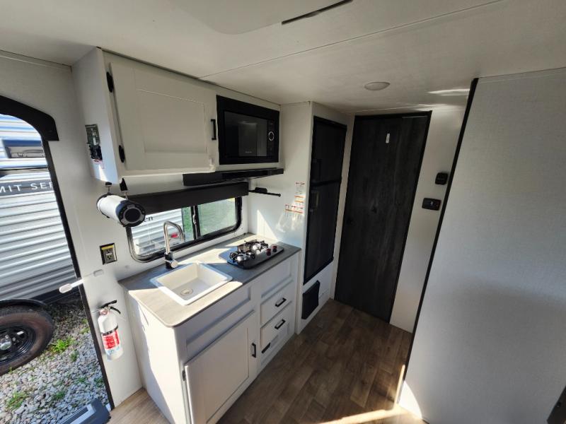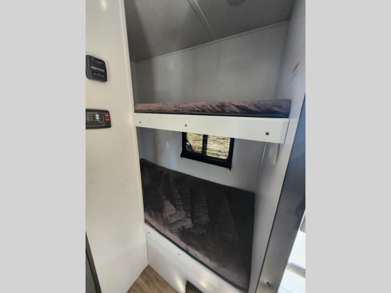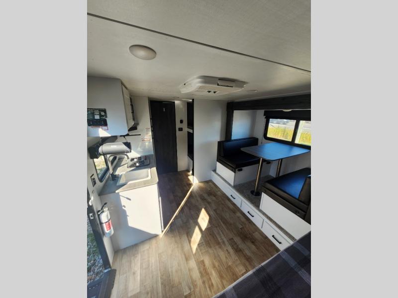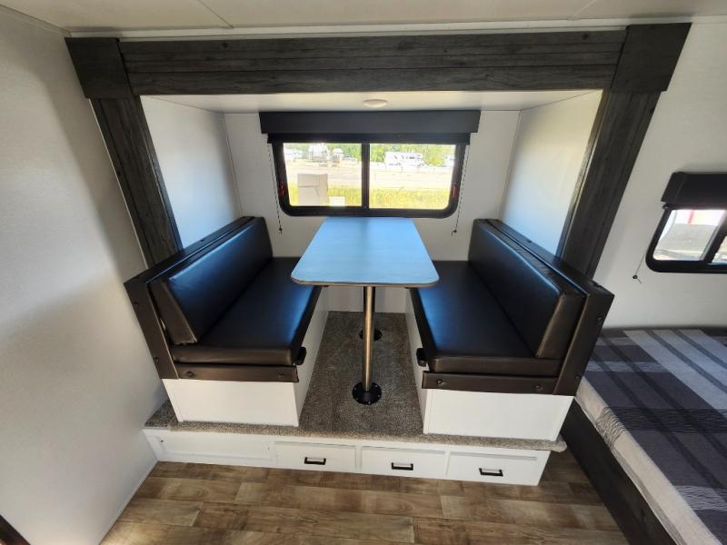 With a roof mount air conditioner, and a furnace, you can camp anytime of year that works for you! Inside, you can dine and relax on the slide out booth dinette which offers storage drawers below, after making a warm meal using the two burner gas range or the microwave. And the 6 cu. ft. refrigerator gives you space for cold food and drinks. Everyone can take turns getting cleaned up in the full bathroom before falling asleep on the bunks, the queen-size bed or the booth dinette. And the 10' power awning offers an outdoor living area protected from the elements once you add your camping chairs taken from the pass-through compartment.