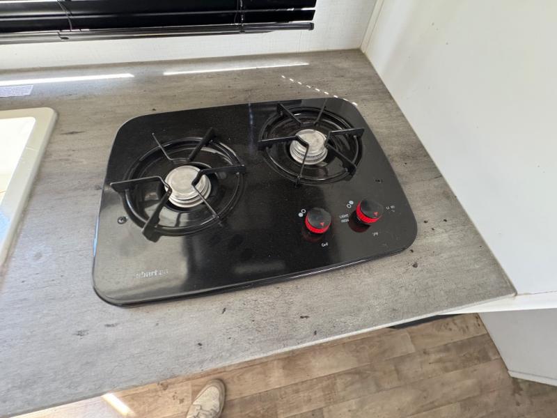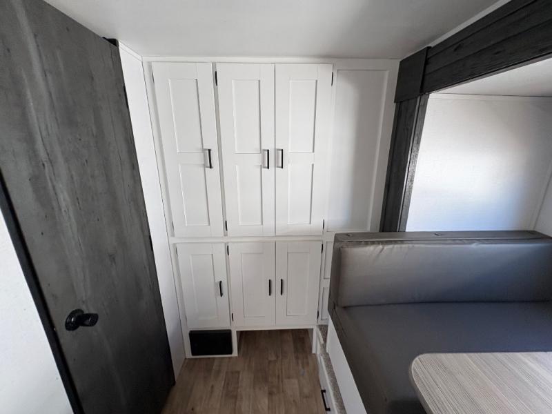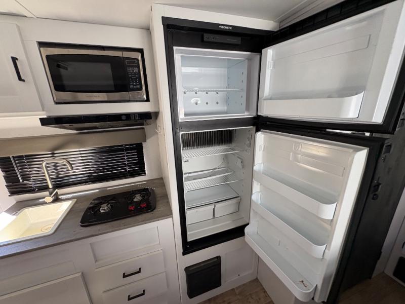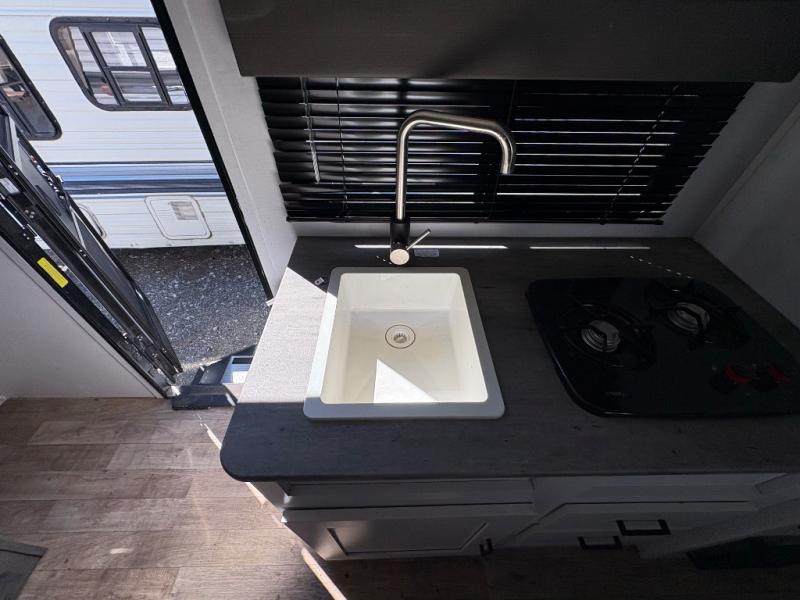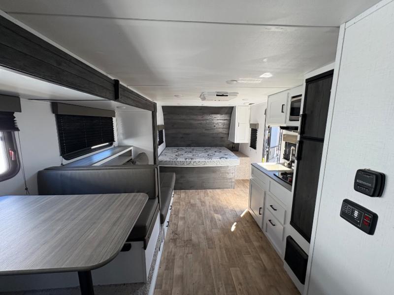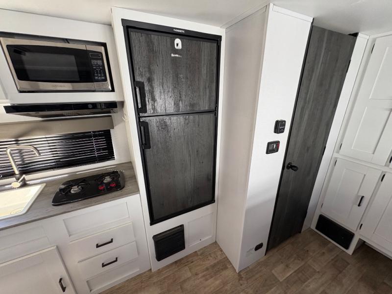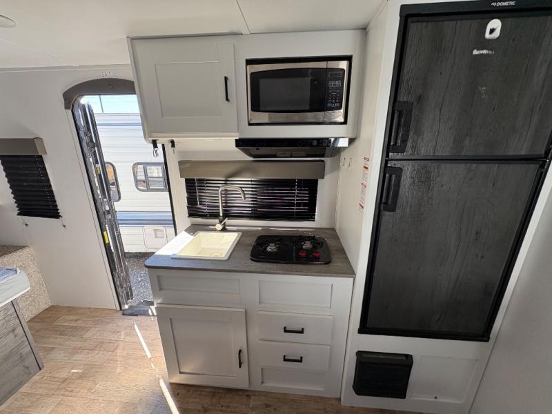 Looking for a spacious interior in your next RV to relax and unwind, yet isn't so big you can't park it in your driveway? This trailer offers just that with a large slide out which includes a booth dinette and a jackknife sofa with a countertop behind to place your cellphones and drinks on. You will also find storage drawers below, and there is a large pantry/wardrobe along the rear wall for all your goodies and such. The corner full bathroom provides a walk-in shower for easy entry when getting cleaned up after a hike. The cook will love the galley kitchen with a two burner gas range and microwave, plus a 6 cu. ft. refrigerator. And the queen-size bed will allow you to sleep like you are at home.