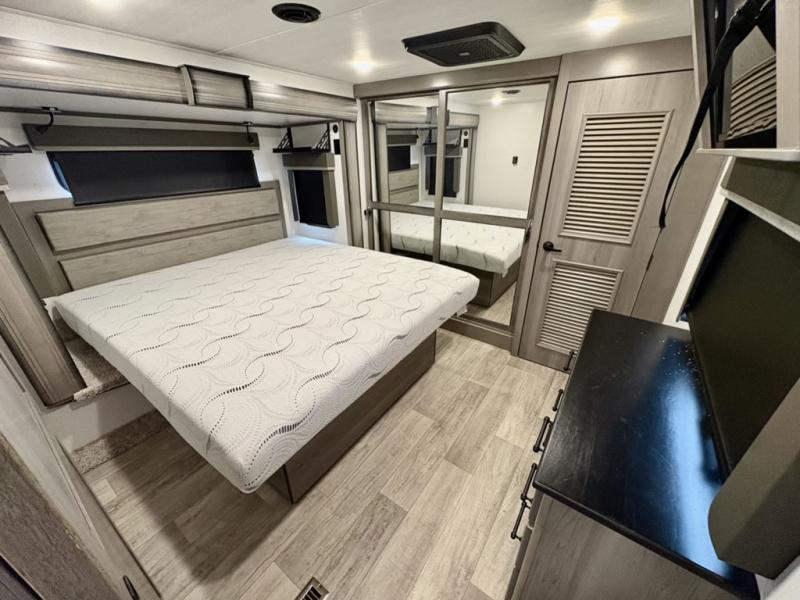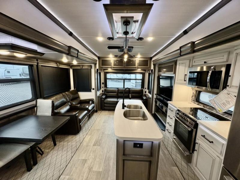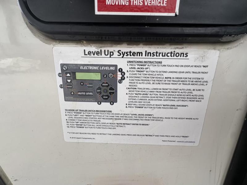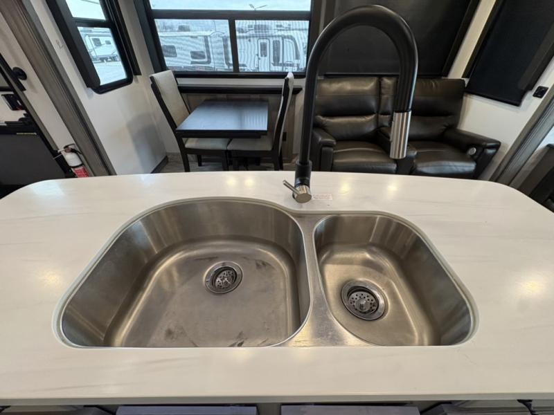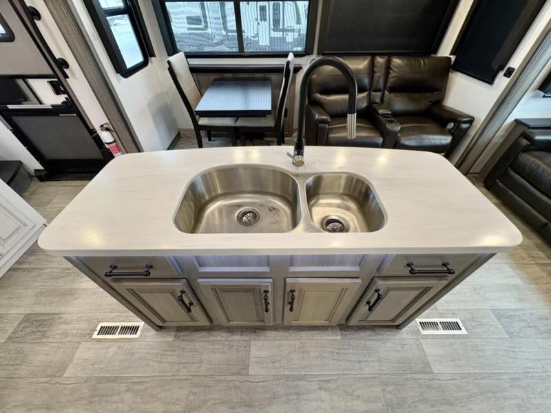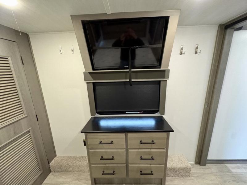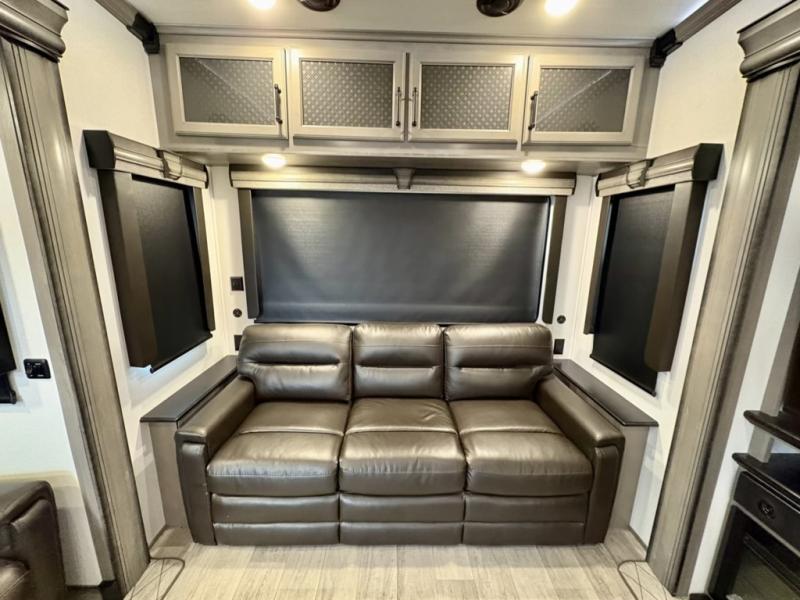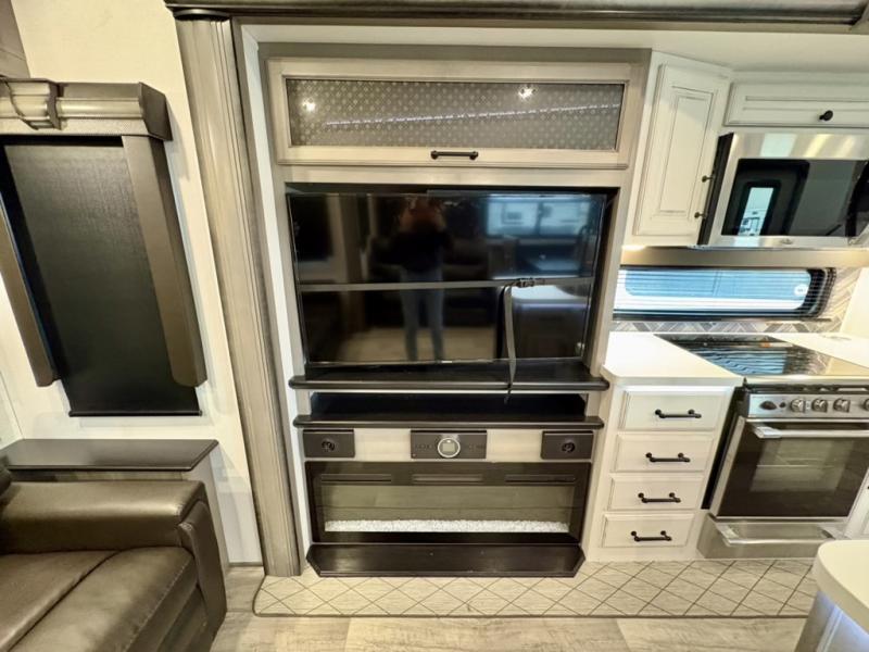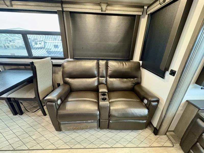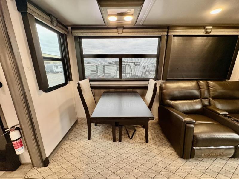 You will have everything you need for a comfortable camping trip and then some with this fifth wheel! The kitchen island will make your meal prepping easier, the pull-down spice rack makes it easier to season your meals, and the designated coffee station will be a big hit for the coffee lovers. Your delicious meals can be enjoyed at the free standing legless dinette with leaf, chair buddy strut, two luxury chairs, and two folding chairs, plus 110V outlets to charge your electronics. Relax on either the rear hide-a-bed sofa or the power Thomas Payne theater seating across from the entertainment center with a 50" LCD HDTV and 5,000 BTU decorative fireplace heater. The front private bedroom has a king bed slide with storage underneath for extra blankets and a front closet that has a clothing hamper to keep your dirty clothes out of the way before washing them in the stackable washer and dryer if you chose to add that option.