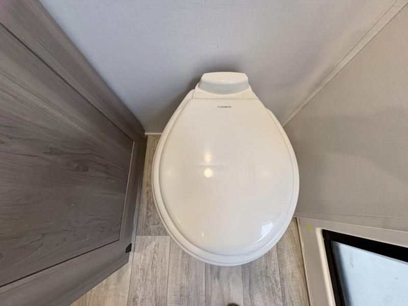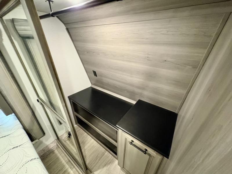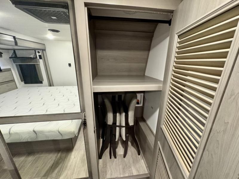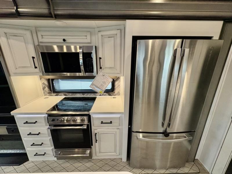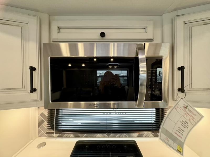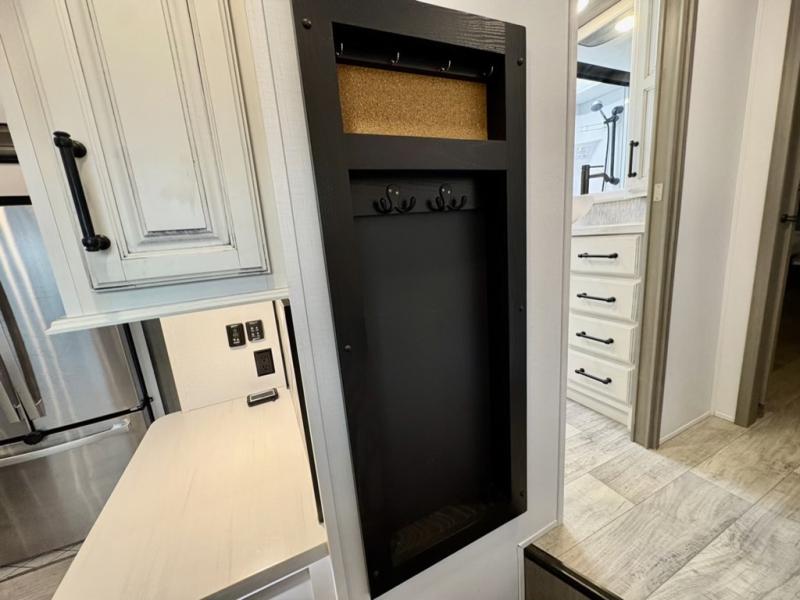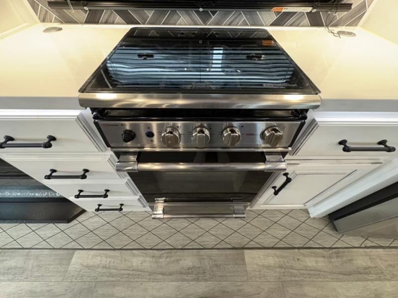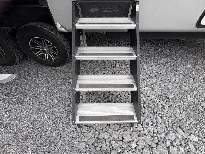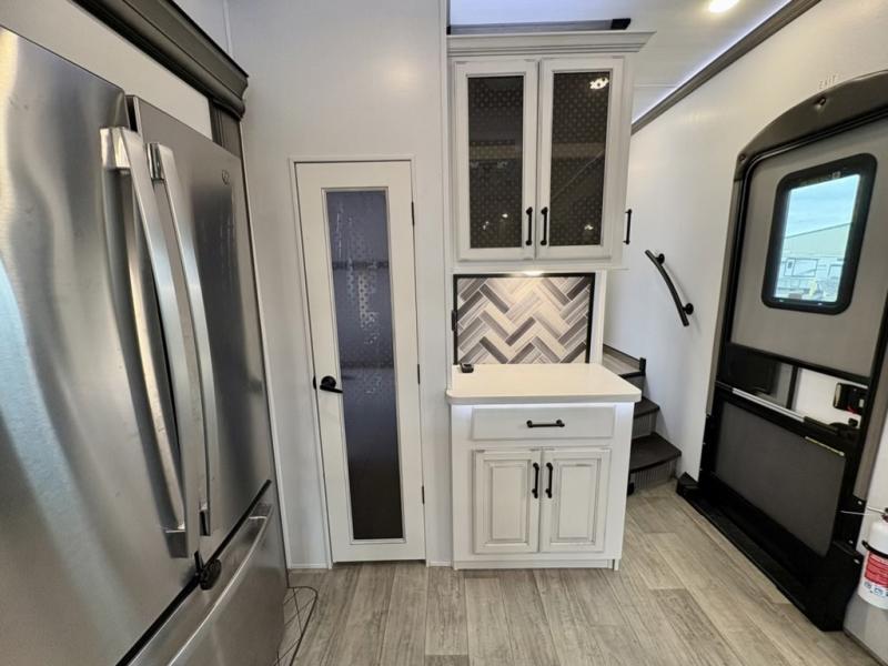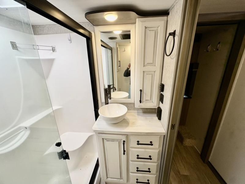 You will have everything you need for a comfortable camping trip and then some with this fifth wheel! The kitchen island will make your meal prepping easier, the pull-down spice rack makes it easier to season your meals, and the designated coffee station will be a big hit for the coffee lovers. Your delicious meals can be enjoyed at the free standing legless dinette with leaf, chair buddy strut, two luxury chairs, and two folding chairs, plus 110V outlets to charge your electronics. Relax on either the rear hide-a-bed sofa or the power Thomas Payne theater seating across from the entertainment center with a 50" LCD HDTV and 5,000 BTU decorative fireplace heater. The front private bedroom has a king bed slide with storage underneath for extra blankets and a front closet that has a clothing hamper to keep your dirty clothes out of the way before washing them in the stackable washer and dryer if you chose to add that option.