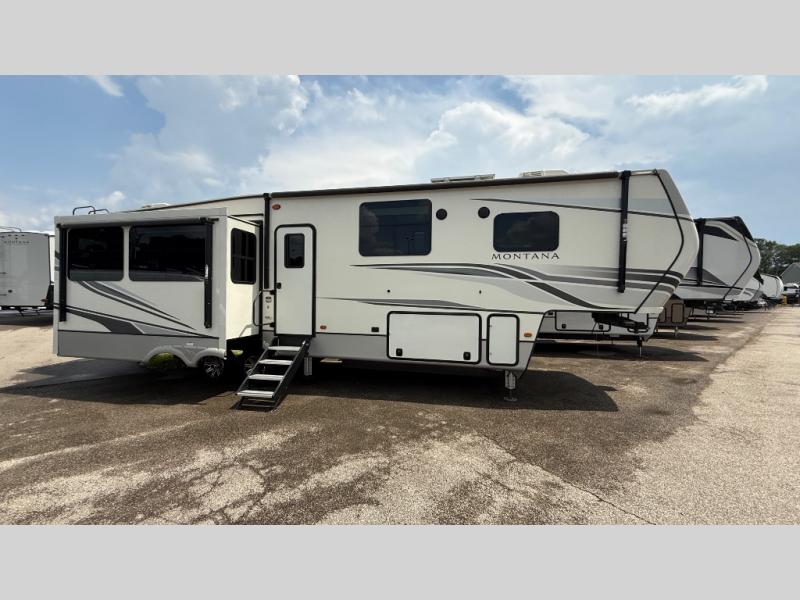 Take charge of how you camp in one of these luxurious Keystone RV Montana fifth wheels! The high quality SolarFlex 200 delivers an affordable solar energy system that eliminates the guesswork and can be built on to meet your exact needs. Keystone's exclusive 12" I-beam chassis with z-frame technology has been reengineered to be stronger, lighter and built for "the long haul". A few other construction features you will appreciate include a Road Armor suspension, 2" thick CNC routed, dual-layered lauan high gloss fiberglass sidewalls, a MaxTurn front cap with KeyShield automotive-grade paint, and a fully walkable roof with an Alpha seamless TPO membrane system. Their strikingly stylish interiors are designed with beautiful maple hardwood cabinetry, a pull-down spice rack, and an indoor/outdoor central vacuum, plus a Blade Pure airflow system for clean, quite, and cool air!