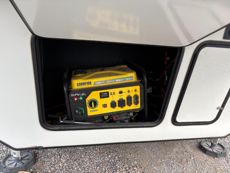 Life will be easier at the campground in this fifth wheel with a bath and a half! The full rear bathroom has a 48" x 30" fiberglass shower with a seat and skylight above, a linen closet to keep your towels close, a dual sink vanity for two to get ready at once, and a barn door to close off the master suite. The bedroom also has a king bed slide with storage underneath across from a dresser with a 32" Smart TV and wardrobe, as well as a large closet that is prepped to add an optional washer and dryer. The chef can prepare their best meals with the kitchen island, the glass top range with convection microwave and range hood with a pull-down spice rack, plus there is a pantry/buffet and a free standing legless dinette to enjoy your meals at. The front living area will have you feeling right at home with the front entertainment center that has a telescoping 50" Smart TV, a 5,000 BTU decorative fireplace heater, and storage on either side. There is also opposing hide-a-bed sofa slides for extra sleeping spaces and power Thomas Payne theater seating for even more comfort!
