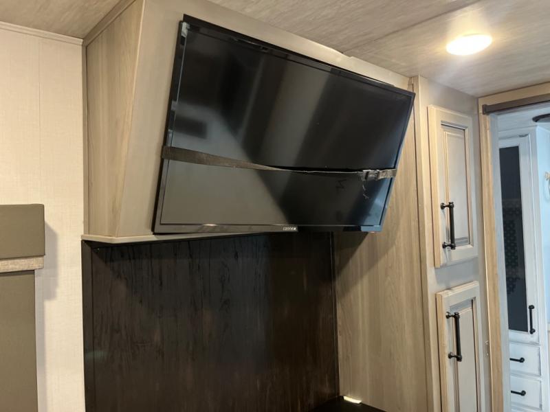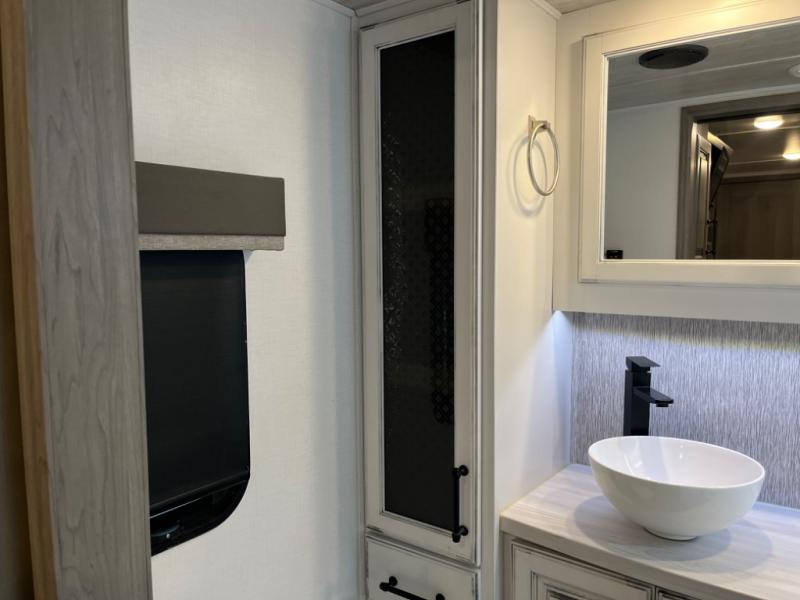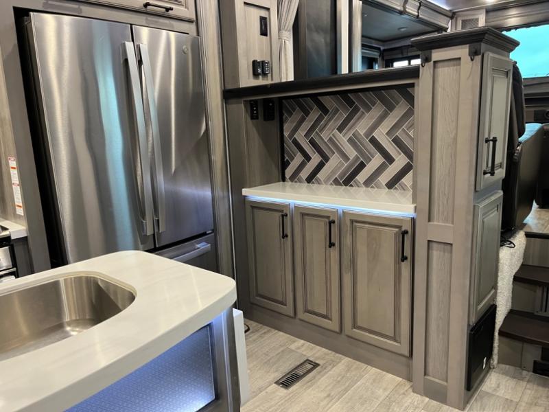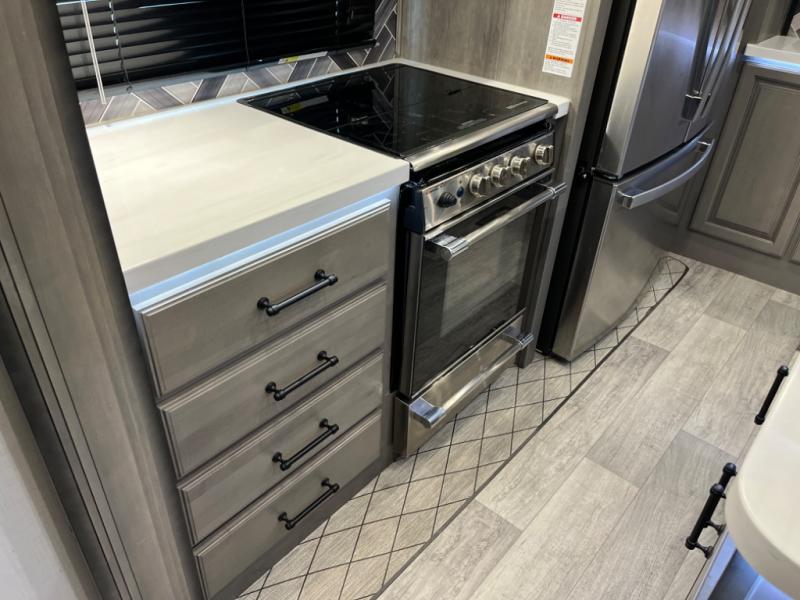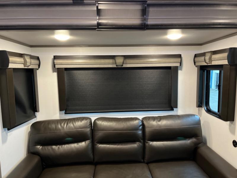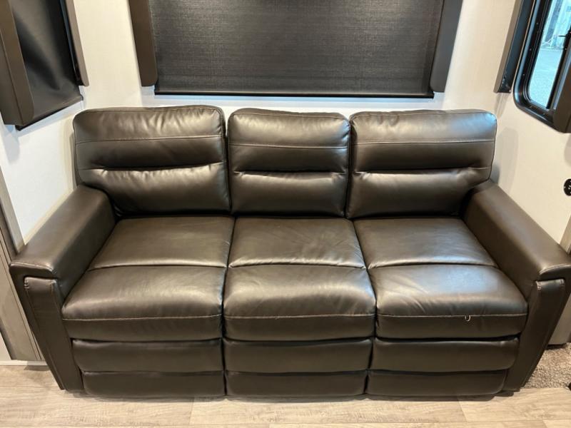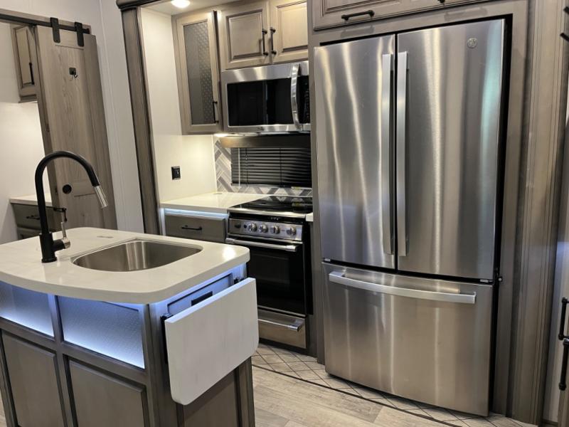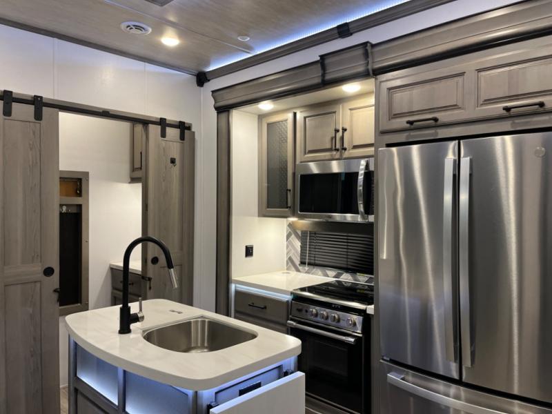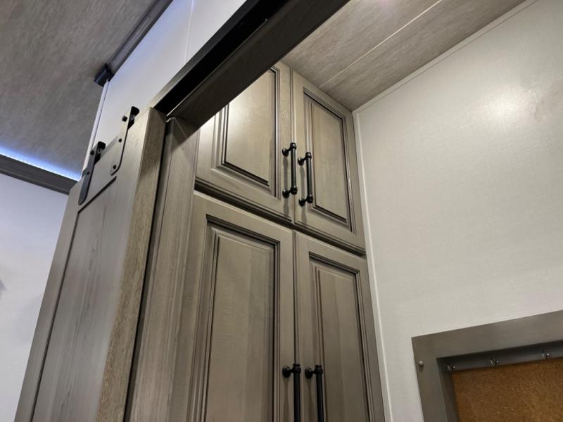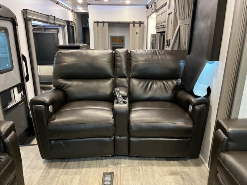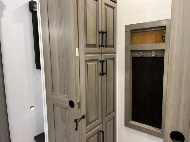 This fifth wheel is similar to model 3761FL except that it has a butler pantry in place of the half bathroom in the kitchen! The full rear bathroom has a 48" x 30" fiberglass shower with a seat and skylight above, a linen closet to keep your towels close, a dual sink vanity for two to get ready at once, and a barn door to close off the master suite. The bedroom also has a king bed slide with storage underneath across from a dresser with a 32" HDTV and wardrobe, as well as a large closet that is prepped to add an optional washer and dryer. The chef can prepare their best meals with the kitchen island, the glass top range with convection microwave and range hood with a pull-down spice rack, plus there is a pantry/buffet and a free standing legless dinette to enjoy your meals at. The front living area will have you feeling right at home with the front entertainment center that has a telescoping 50" LCD HDTV, a 5,000 BRU decorative fireplace heater, and storage on either side. There is also opposing hide-a-bed sofa slides for extra sleeping spaces and power Thomas Payne theater seating for even more comfort!