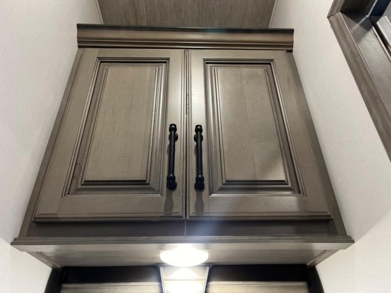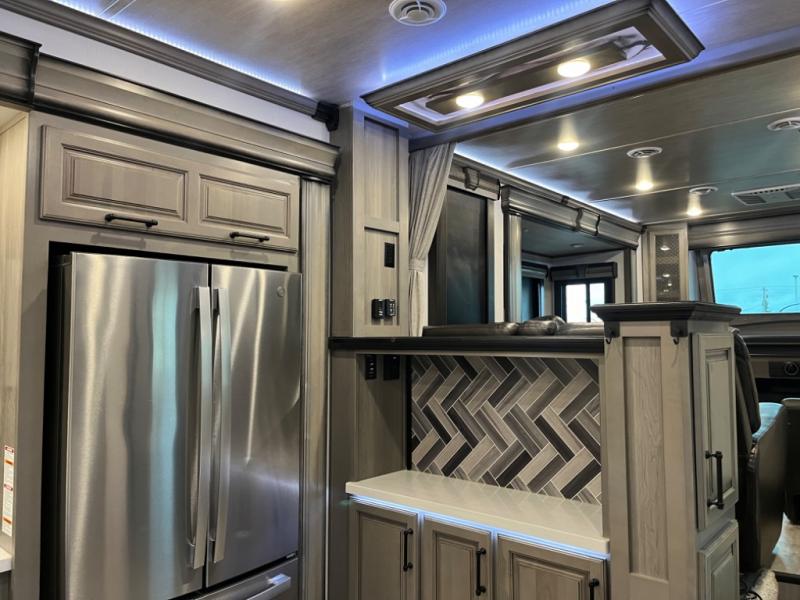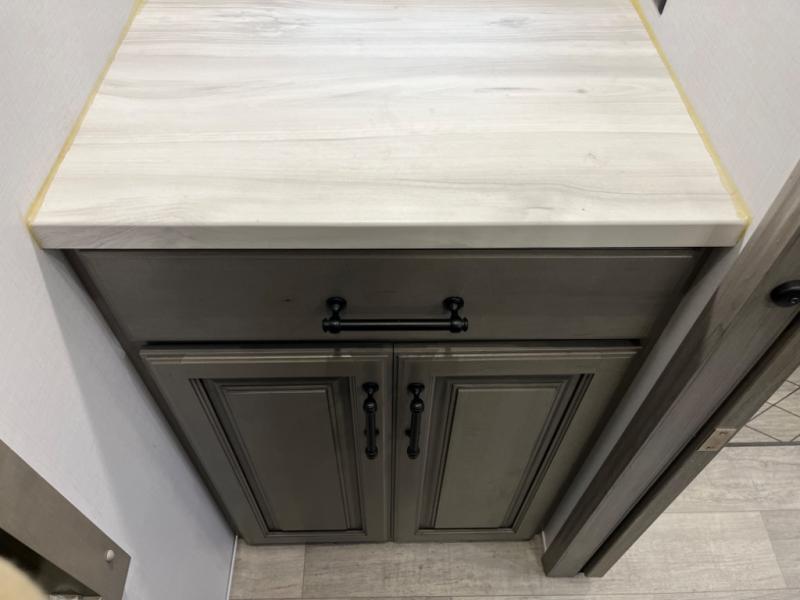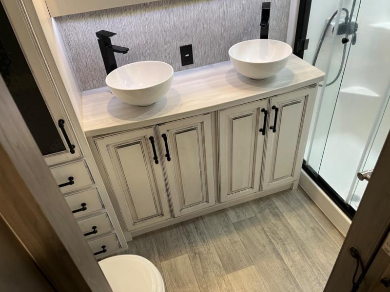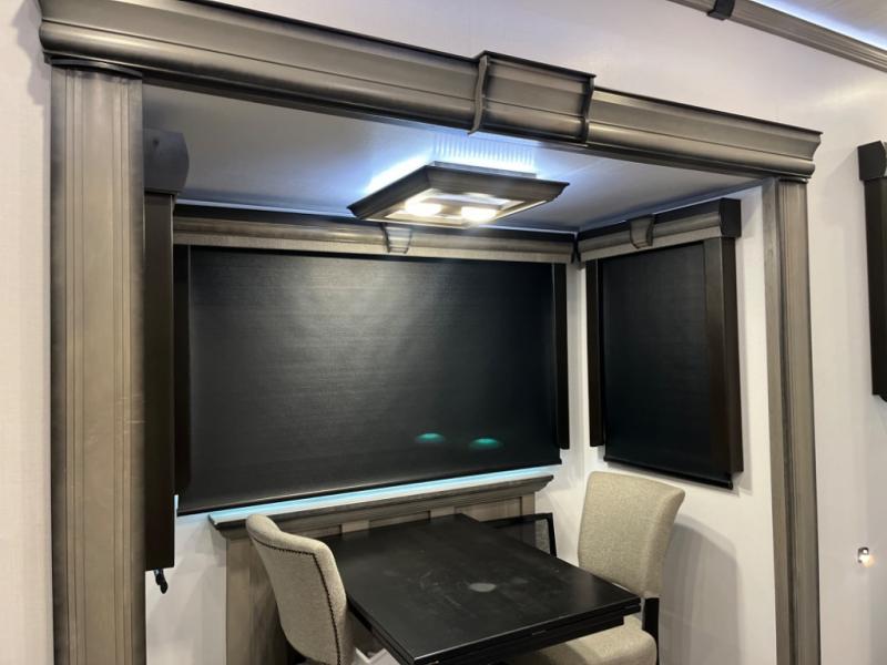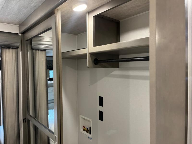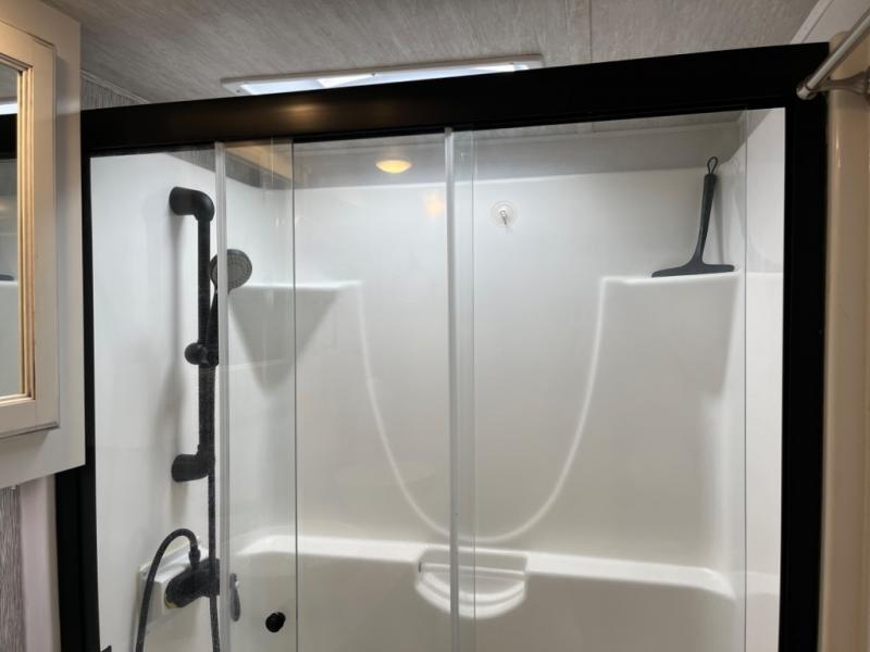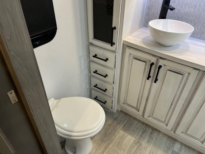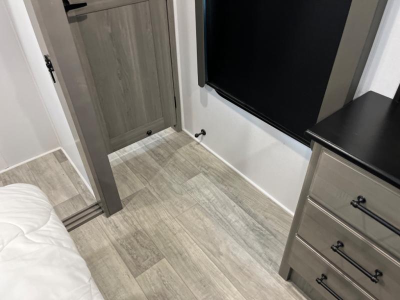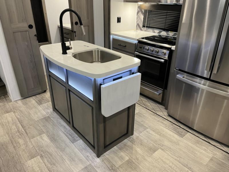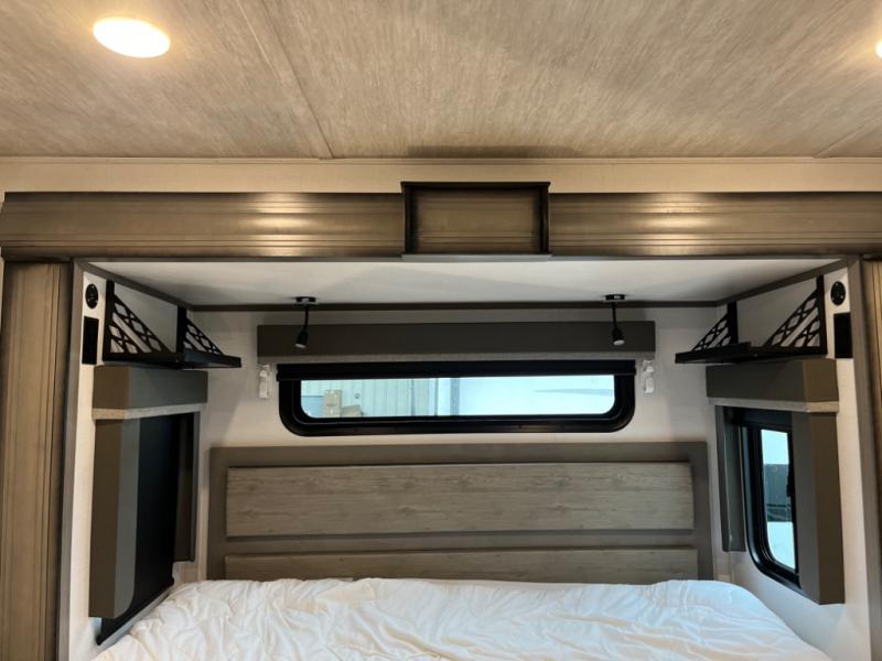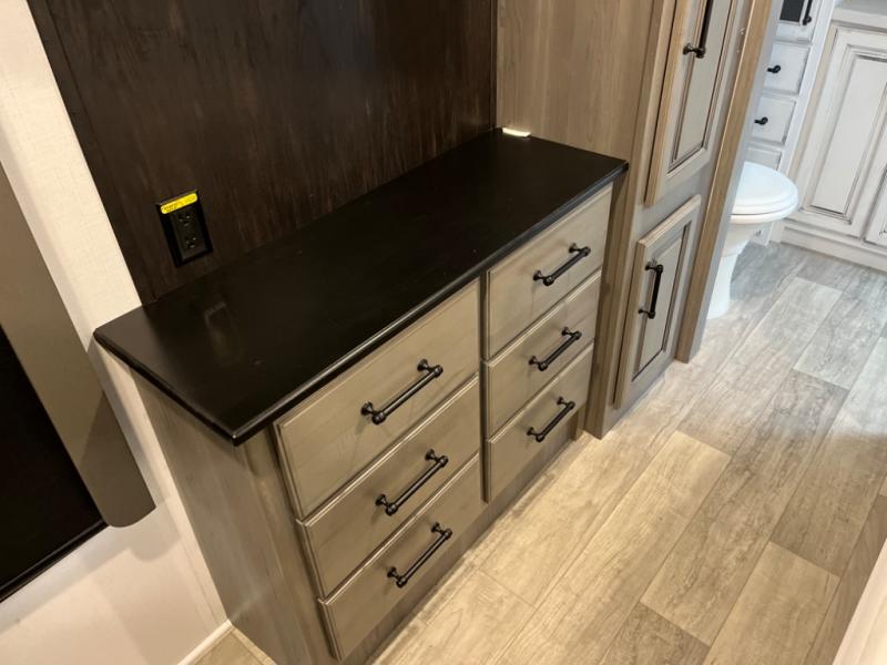 This fifth wheel is similar to model 3761FL except that it has a butler pantry in place of the half bathroom in the kitchen! The full rear bathroom has a 48" x 30" fiberglass shower with a seat and skylight above, a linen closet to keep your towels close, a dual sink vanity for two to get ready at once, and a barn door to close off the master suite. The bedroom also has a king bed slide with storage underneath across from a dresser with a 32" HDTV and wardrobe, as well as a large closet that is prepped to add an optional washer and dryer. The chef can prepare their best meals with the kitchen island, the glass top range with convection microwave and range hood with a pull-down spice rack, plus there is a pantry/buffet and a free standing legless dinette to enjoy your meals at. The front living area will have you feeling right at home with the front entertainment center that has a telescoping 50" LCD HDTV, a 5,000 BRU decorative fireplace heater, and storage on either side. There is also opposing hide-a-bed sofa slides for extra sleeping spaces and power Thomas Payne theater seating for even more comfort!