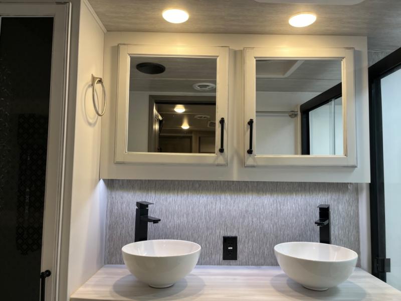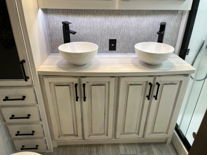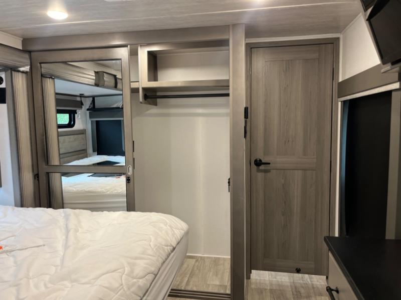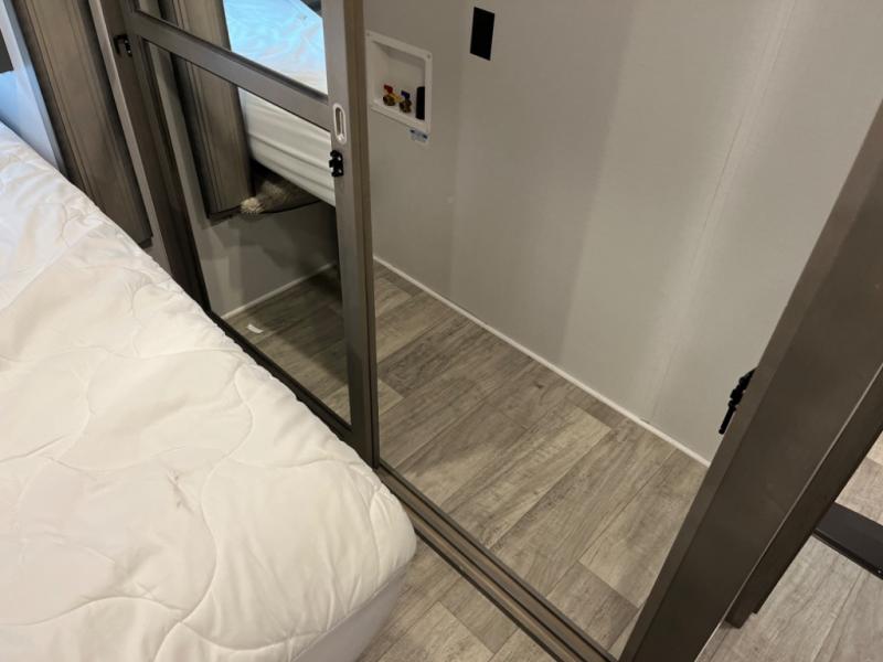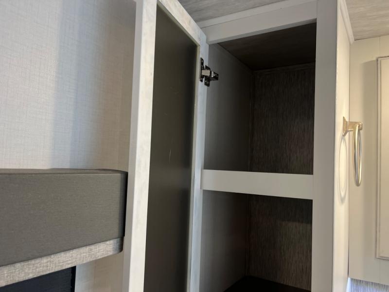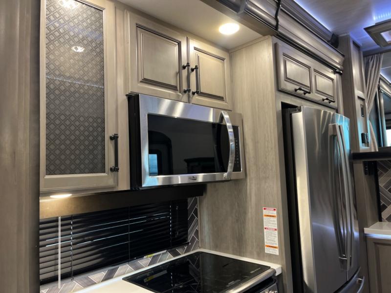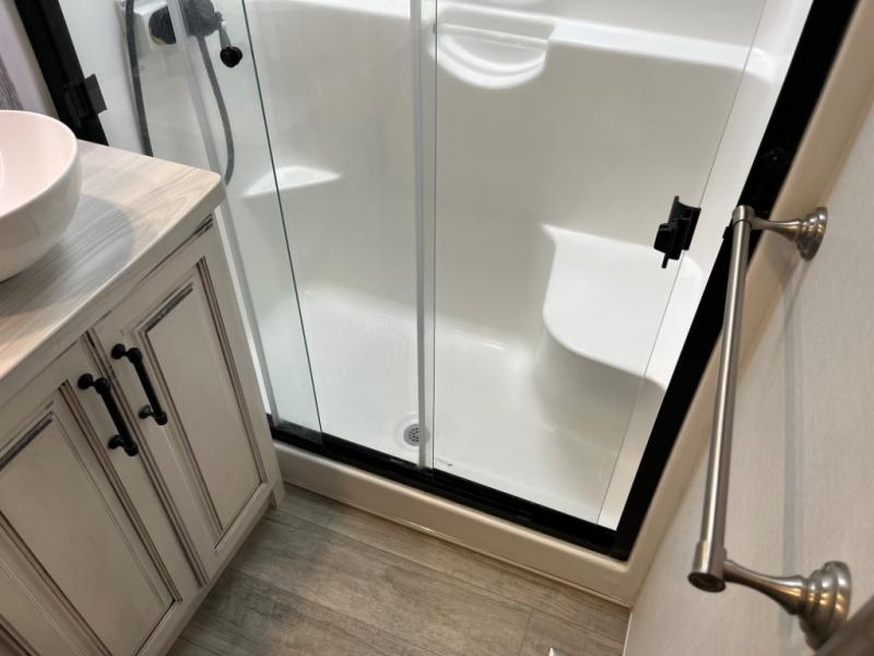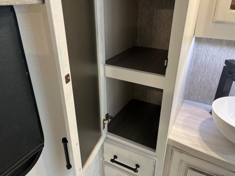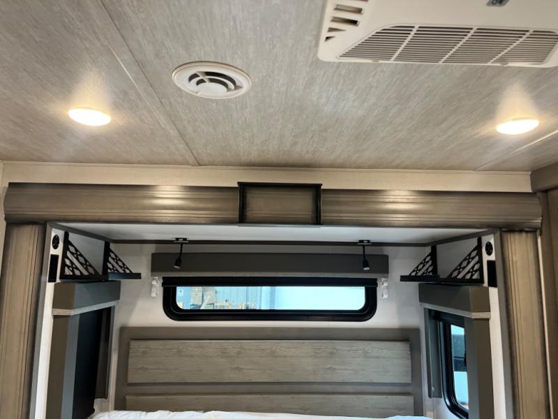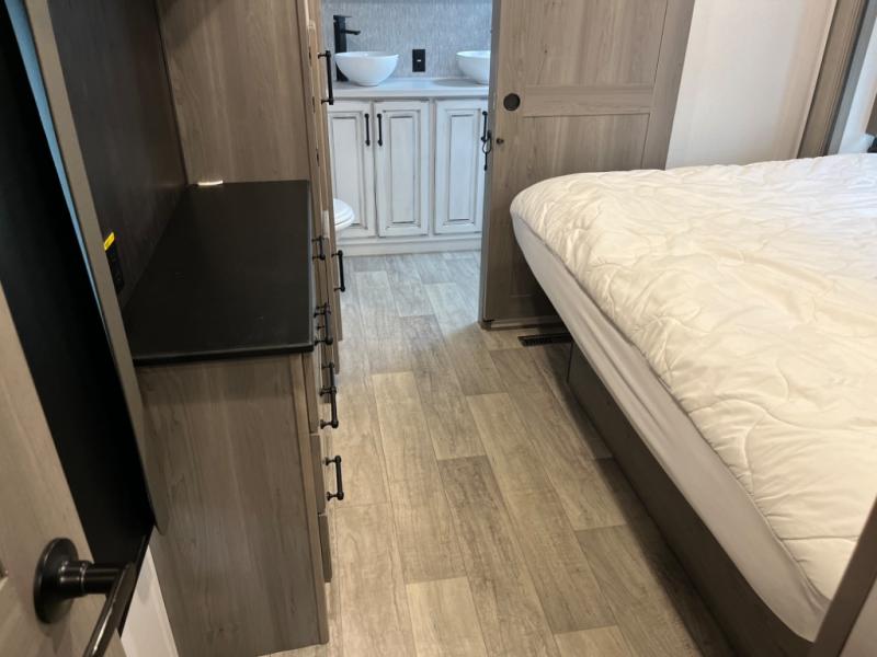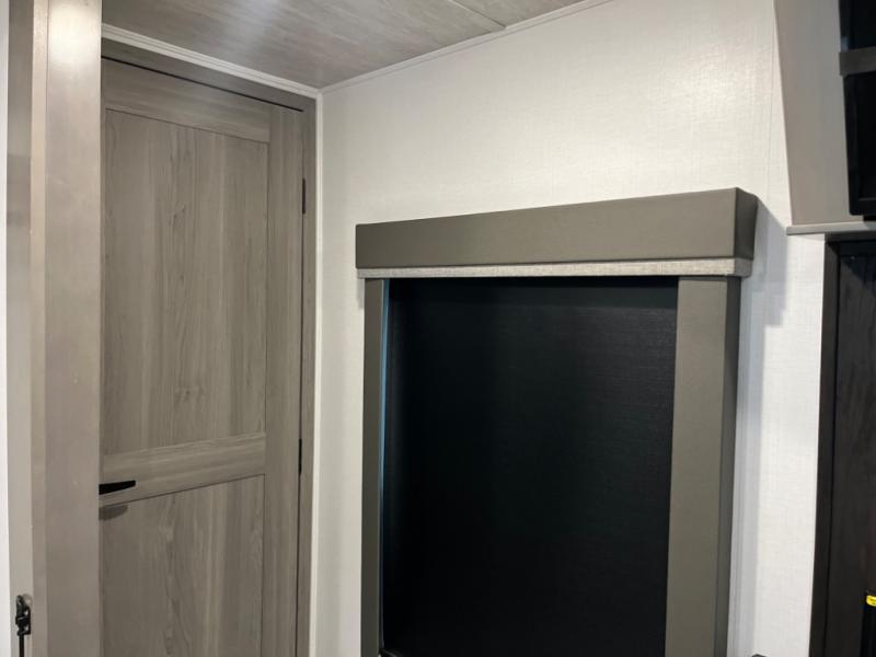 This fifth wheel is similar to model 3761FL except that it has a butler pantry in place of the half bathroom in the kitchen! The full rear bathroom has a 48" x 30" fiberglass shower with a seat and skylight above, a linen closet to keep your towels close, a dual sink vanity for two to get ready at once, and a barn door to close off the master suite. The bedroom also has a king bed slide with storage underneath across from a dresser with a 32" HDTV and wardrobe, as well as a large closet that is prepped to add an optional washer and dryer. The chef can prepare their best meals with the kitchen island, the glass top range with convection microwave and range hood with a pull-down spice rack, plus there is a pantry/buffet and a free standing legless dinette to enjoy your meals at. The front living area will have you feeling right at home with the front entertainment center that has a telescoping 50" LCD HDTV, a 5,000 BRU decorative fireplace heater, and storage on either side. There is also opposing hide-a-bed sofa slides for extra sleeping spaces and power Thomas Payne theater seating for even more comfort!