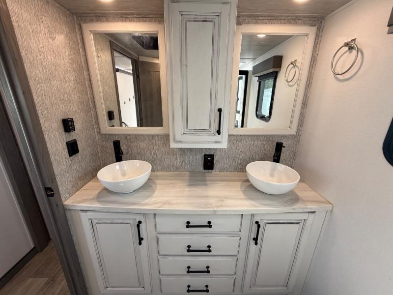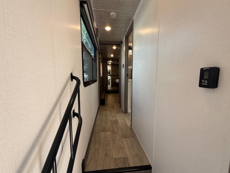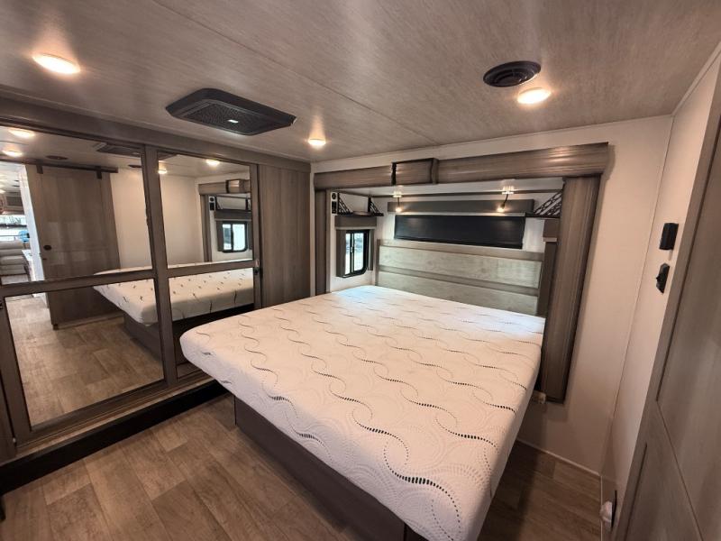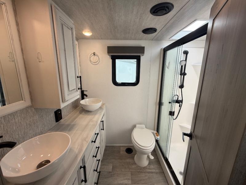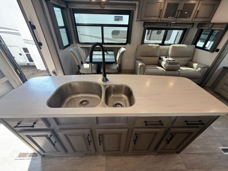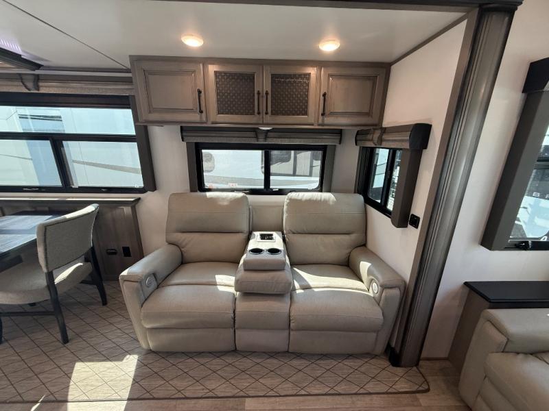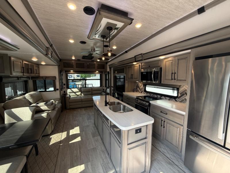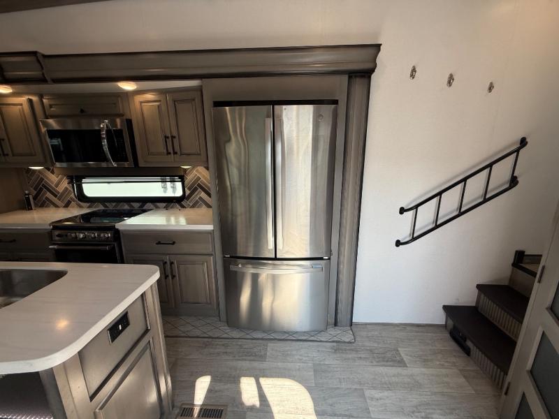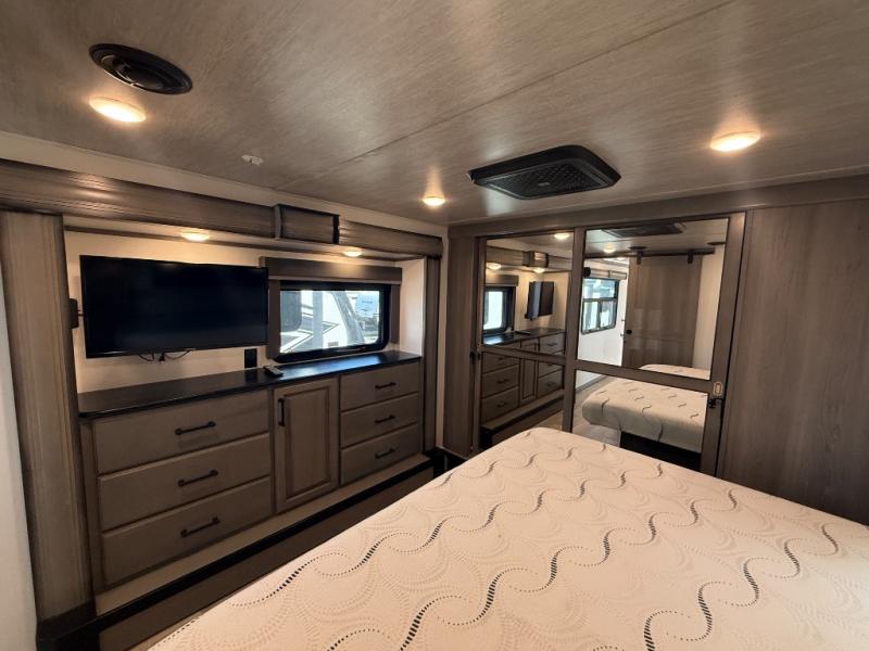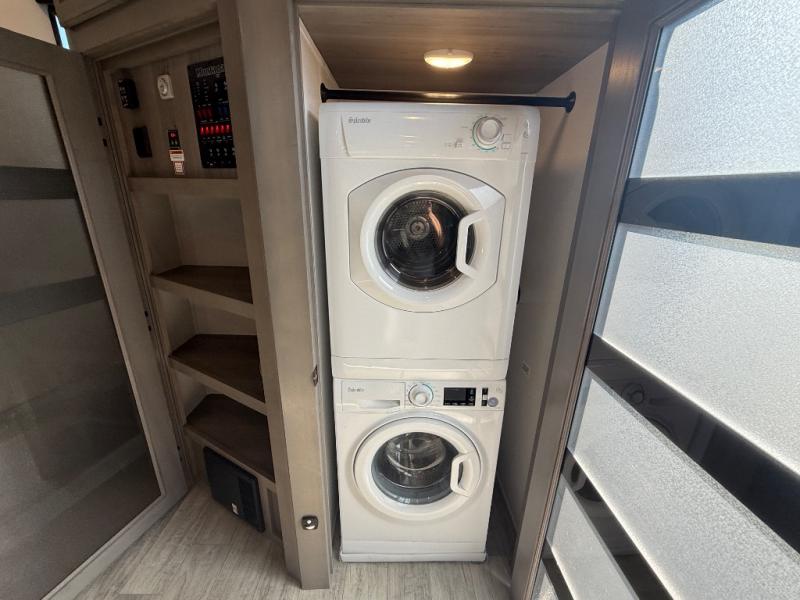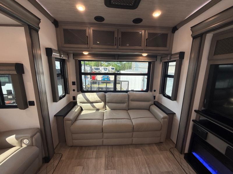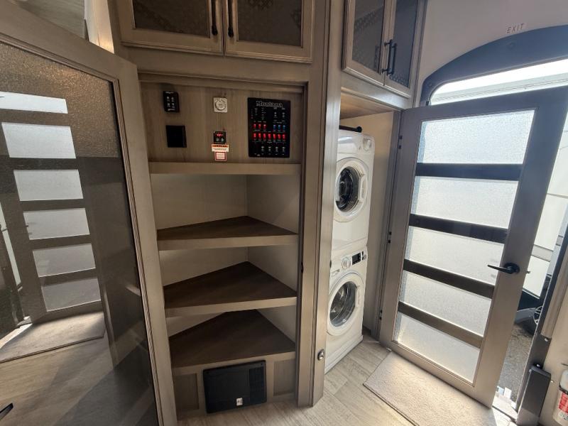Enjoy a home away from home with this fifth wheel! The front private bedroom has a king bed slide with storage underneath and CPAP shelves across from a 32" HDTV with drawers below it, a large front closet, and a barn door to close it all off. Freshen up each morning in the full bathroom with the 48" x 30" fiberglass shower with a seat and skylight above for more natural lighting as you get ready at the dual sink vanity. The kitchen has everything you need to prepare your best meals including extra countertop space on the kitchen island and even a closet that is prepped to add the optional washer and dryer so you can quickly grab a clean dish towel. Enjoy your meals at the free standing legless dinette and then relax on the rear hide-a-bed sofa or the power Thomas Payne theater seating across from the entertainment center with a 5,000 BTU decorative fireplace heater and 50" LCD HDTV to watch your favorite movies!