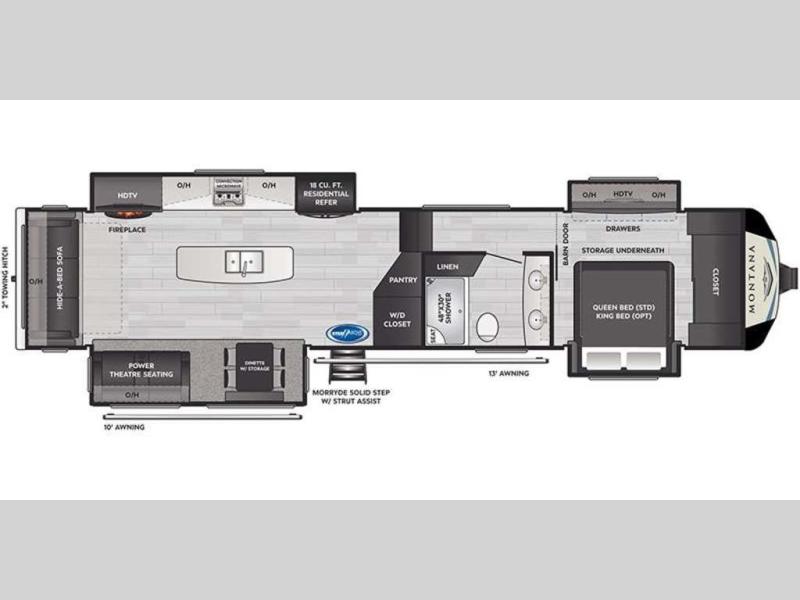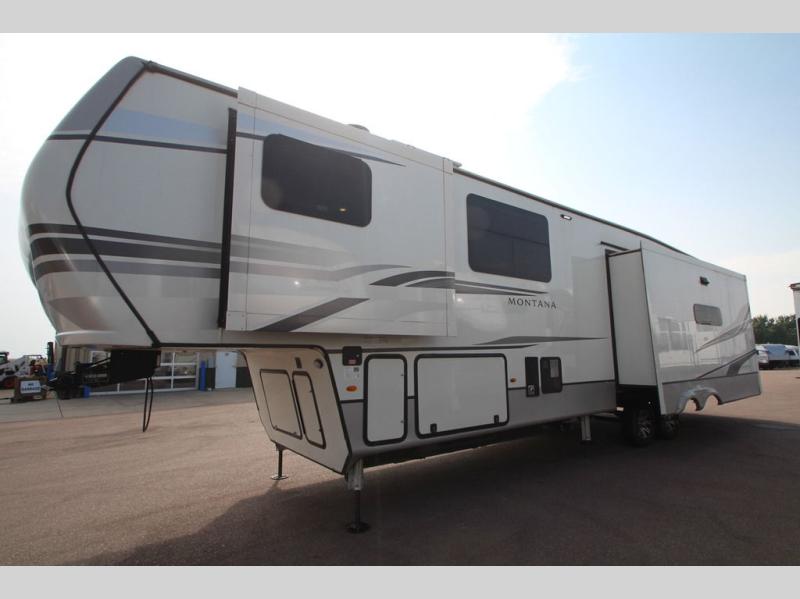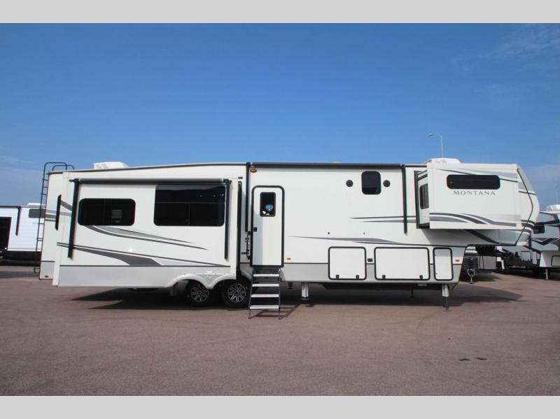 Take charge of how you camp in one of these luxurious Keystone RV Montana fifth wheels! The high quality SolarFlex 200 delivers an affordable solar energy system that eliminates the guesswork and can be built on to meet your exact needs. Keystone's exclusive 12" I-beam chassis with z-frame technology has been reengineered to be stronger, lighter and built for "the long haul". A few other construction features you will appreciate include a Road Armor suspension, 2" thick CNC routed, dual-layered lauan high gloss fiberglass sidewalls, a MaxTurn front cap with KeyShield automotive-grade paint, and a fully walkable roof with an Alpha seamless TPO membrane system. Their strikingly stylish interiors are designed with beautiful maple hardwood cabinetry, a pull-down spice rack, and an indoor/outdoor central vacuum, plus a Blade Pure airflow system for clean, quite, and cool air!