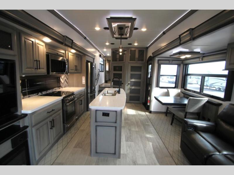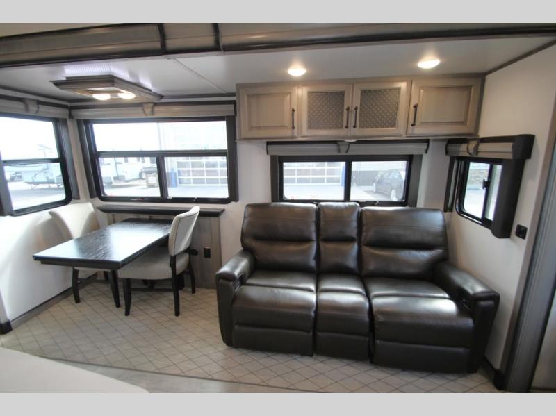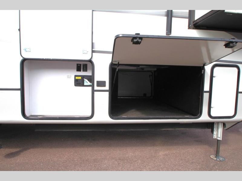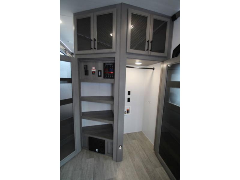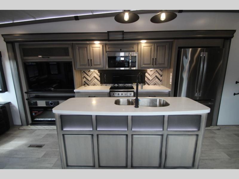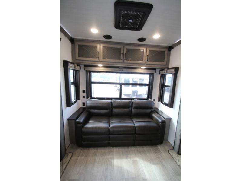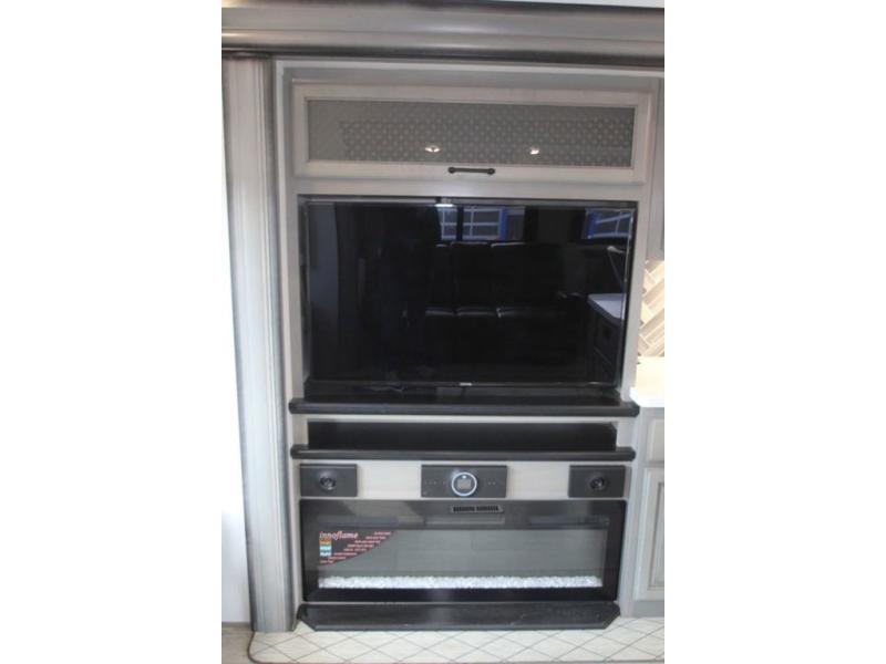 Enjoy a home away from home with this fifth wheel! The front private bedroom has a king bed slide with storage underneath and CPAP shelves across from a 32" HDTV with drawers below it, a large front closet, and a barn door to close it all off. Freshen up each morning in the full bathroom with the 48" x 30" fiberglass shower with a seat and skylight above for more natural lighting as you get ready at the dual sink vanity. The kitchen has everything you need to prepare your best meals including extra countertop space on the kitchen island and even a closet that is prepped to add the optional washer and dryer so you can quickly grab a clean dish towel. Enjoy your meals at the free standing legless dinette and then relax on the rear hide-a-bed sofa or the power Thomas Payne theater seating across from the entertainment center with a 5,000 BTU decorative fireplace heater and 50" LCD HDTV to watch your favorite movies!