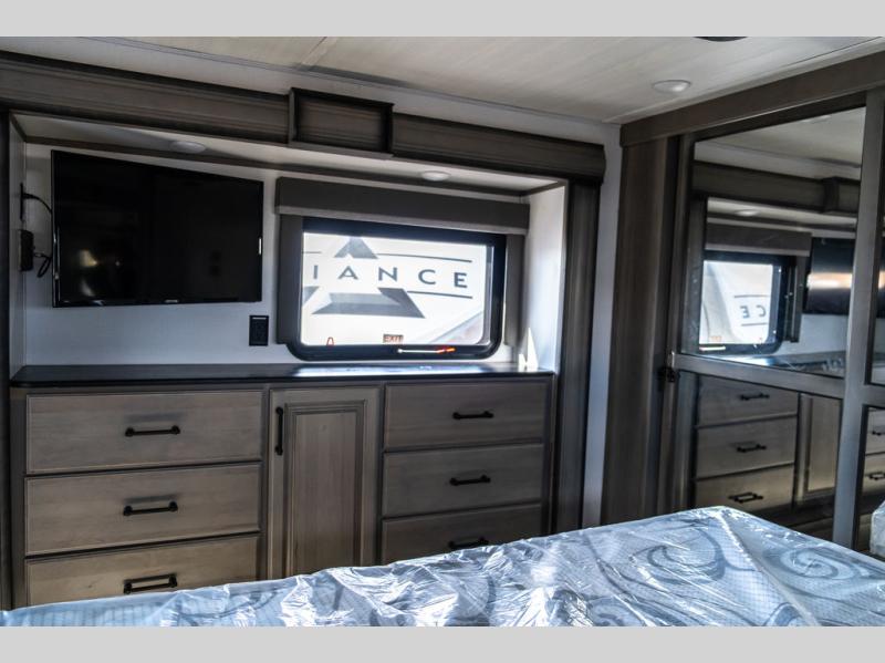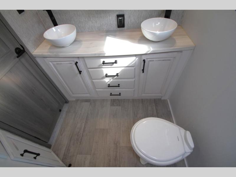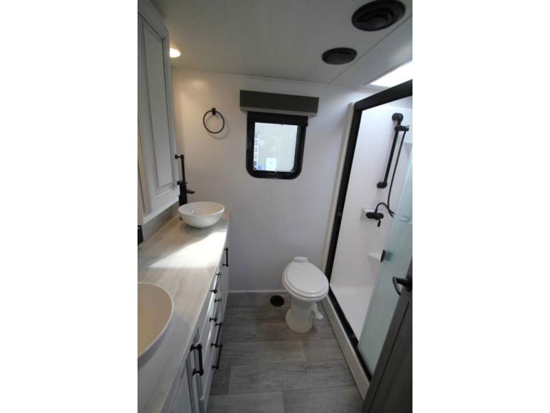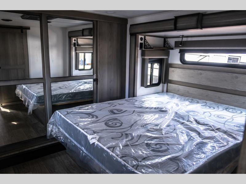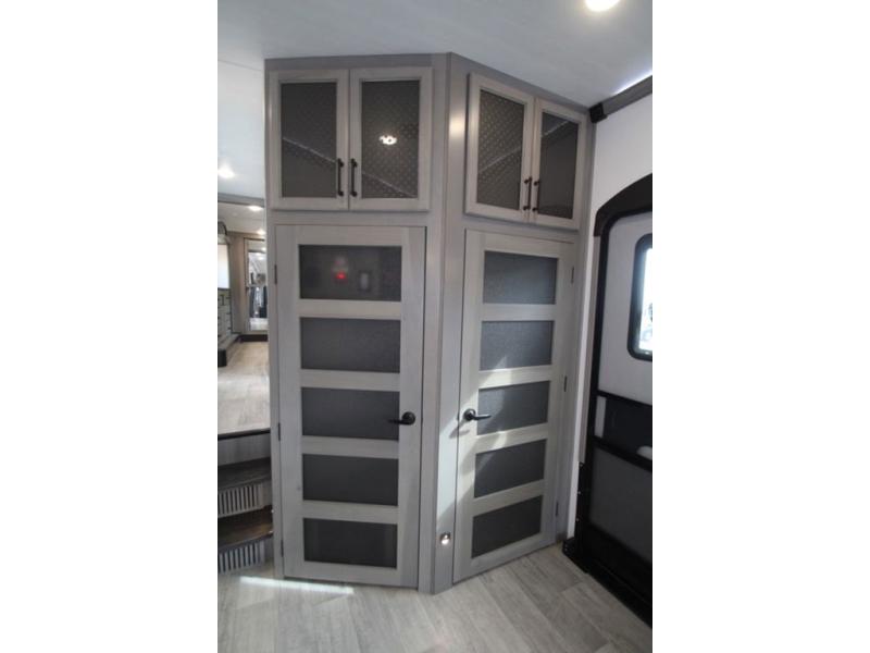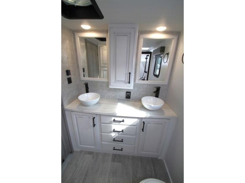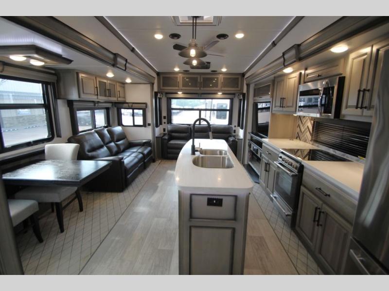 Enjoy a home away from home with this fifth wheel! The front private bedroom has a king bed slide with storage underneath and CPAP shelves across from a 32" HDTV with drawers below it, a large front closet, and a barn door to close it all off. Freshen up each morning in the full bathroom with the 48" x 30" fiberglass shower with a seat and skylight above for more natural lighting as you get ready at the dual sink vanity. The kitchen has everything you need to prepare your best meals including extra countertop space on the kitchen island and even a closet that is prepped to add the optional washer and dryer so you can quickly grab a clean dish towel. Enjoy your meals at the free standing legless dinette and then relax on the rear hide-a-bed sofa or the power Thomas Payne theater seating across from the entertainment center with a 5,000 BTU decorative fireplace heater and 50" LCD HDTV to watch your favorite movies!