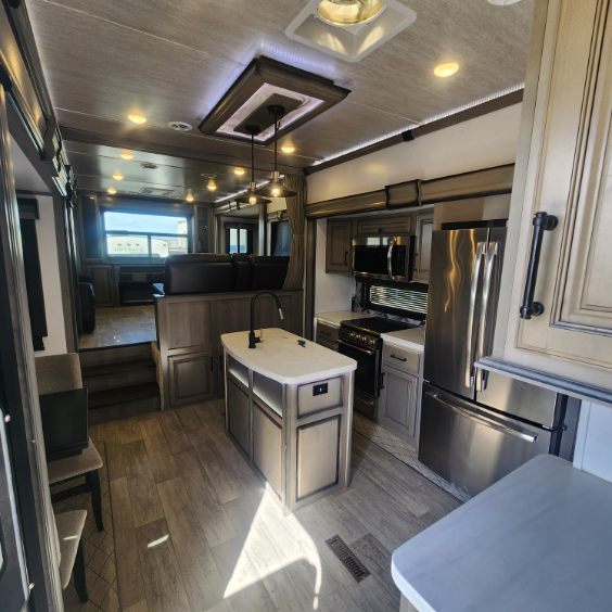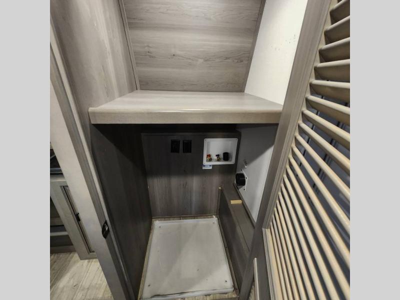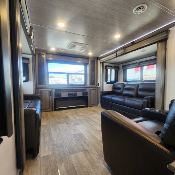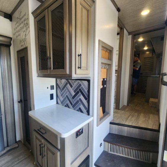 The coffee lover will enjoy camping in this fifth wheel with the coffee station in the kitchen! The kitchen also has an island, a large pantry, a glass top range with convection microwave and range hood that has a pull-down spice rack, a 18 cu. ft. residential refrigerator, and floor cabinets for your storage needs. Eat your meals and play card games at the free standing legless dinette with 110V outlets to charge your electronics. The separated living area has opposing hide-a-bed sofas and power Thomas Payne theater seating across from a rear entertainment center with a telescoping 50" LCD HDTV and a 5,000 BTU decorative fireplace heater with storage on either side. When you're ready to wind down your nights, head to the front private bedroom to enjoy a good night's rest on the king bed slide with storage underneath and there is a front closet with a clothing hamper and an area to add the optional stackable washer and dryer to have clean clothes for your longer trips!