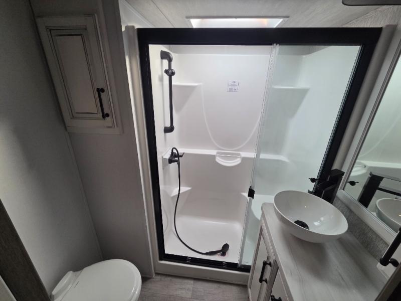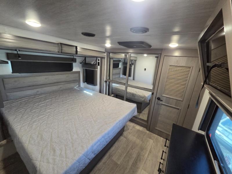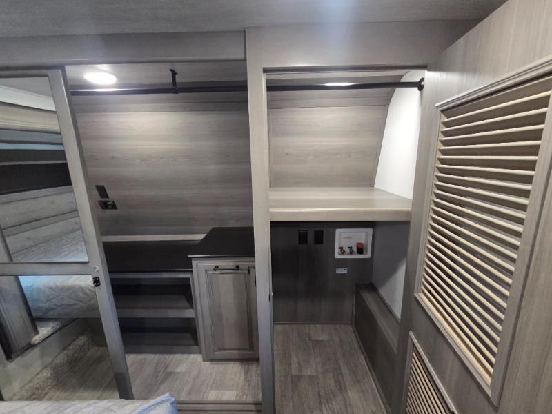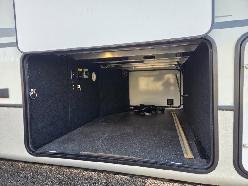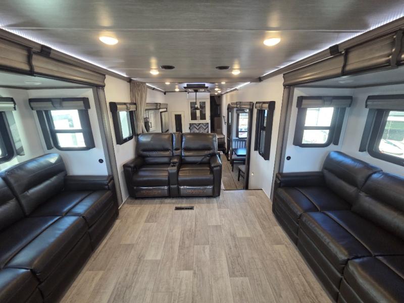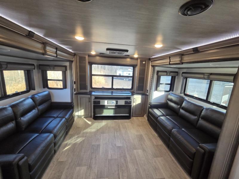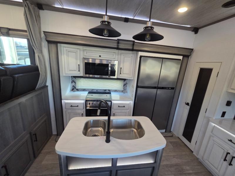 The coffee lover will enjoy camping in this fifth wheel with the coffee station in the kitchen! The kitchen also has an island, a large pantry, a glass top range with convection microwave and range hood that has a pull-down spice rack, a 18 cu. ft. residential refrigerator, and floor cabinets for your storage needs. Eat your meals and play card games at the free standing legless dinette with 110V outlets to charge your electronics. The separated living area has opposing hide-a-bed sofas and power Thomas Payne theater seating across from a rear entertainment center with a telescoping 50" LCD HDTV and a 5,000 BTU decorative fireplace heater with storage on either side. When you're ready to wind down your nights, head to the front private bedroom to enjoy a good night's rest on the king bed slide with storage underneath and there is a front closet with a clothing hamper and an area to add the optional stackable washer and dryer to have clean clothes for your longer trips!
