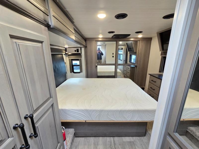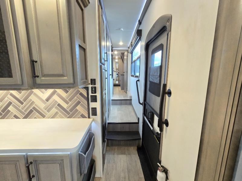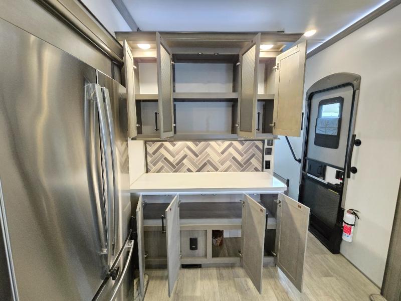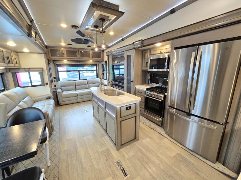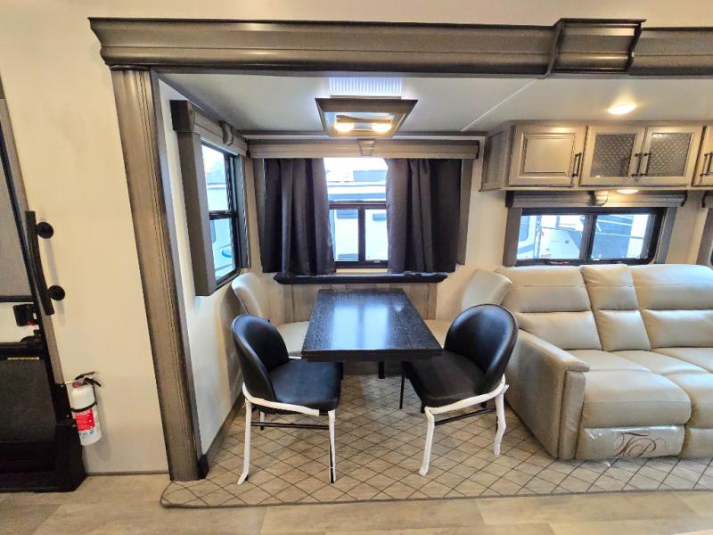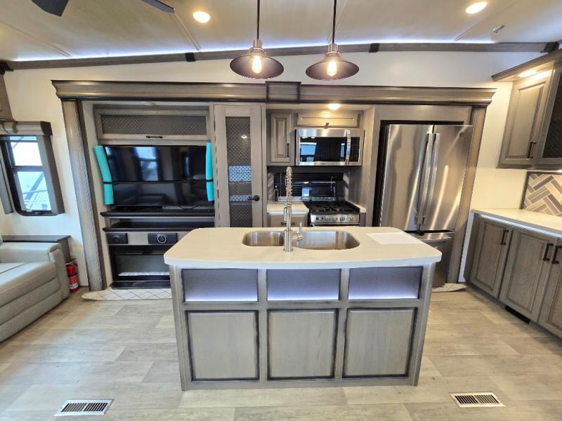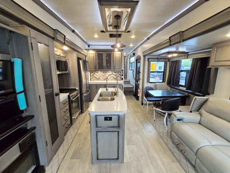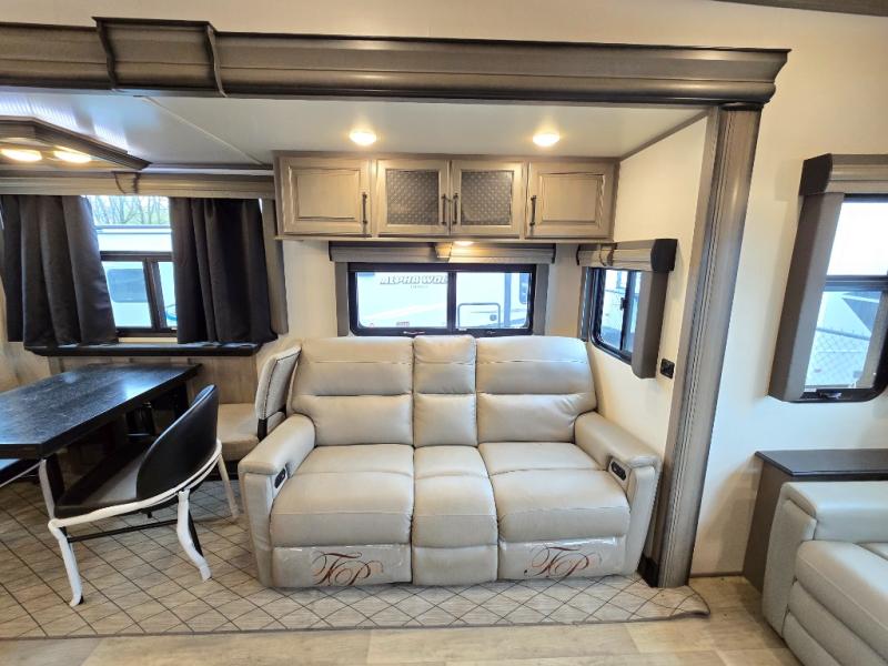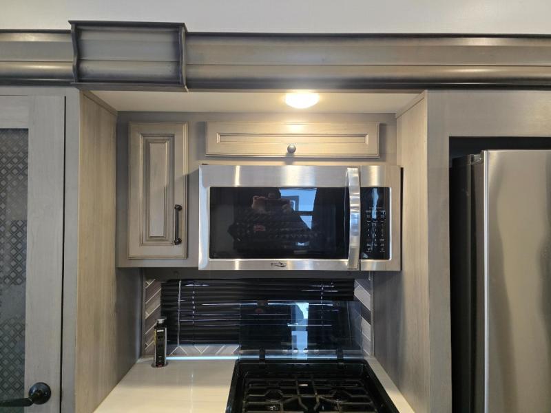 Sleep like royalty in the front master suite of this fifth wheel! It features a king bed slide with storage underneath, a front large closet, an area prepped to add an optional washer and dryer, a walk-in closet with a wardrobe, and an entrance into the dual entry bathroom. The chef can prepare their best meals with the glass top range, the pull-down spice rack, the kitchen island, and the hutch with countertop space below it. Enjoy your meals at the free standing legless dinette and then head to the rear living area for a relaxing evening watching your favorite movie on the 50" LCD HDTV while a fire goes in the 5,000 BTU decorative fireplace heater across from the power Thomas Payne theater seating and rear hide-a-bed sofa which can also transform into an extra sleeping space!