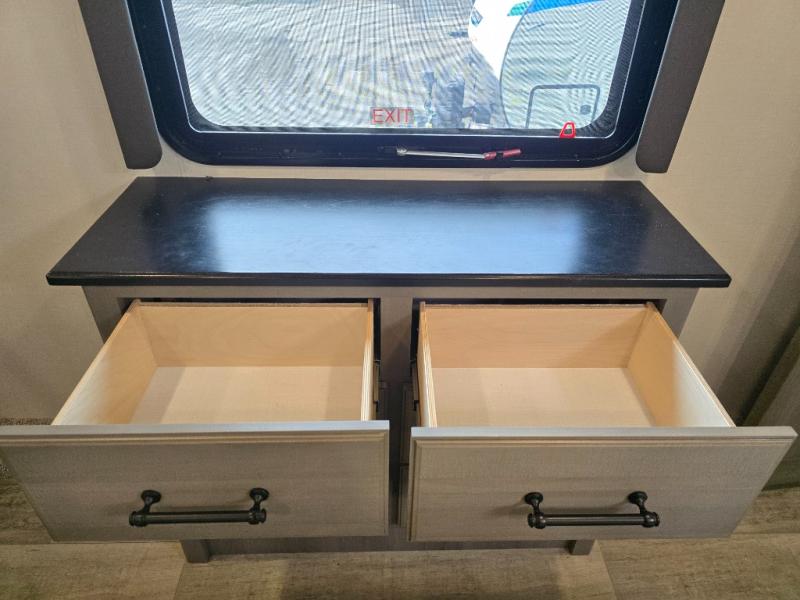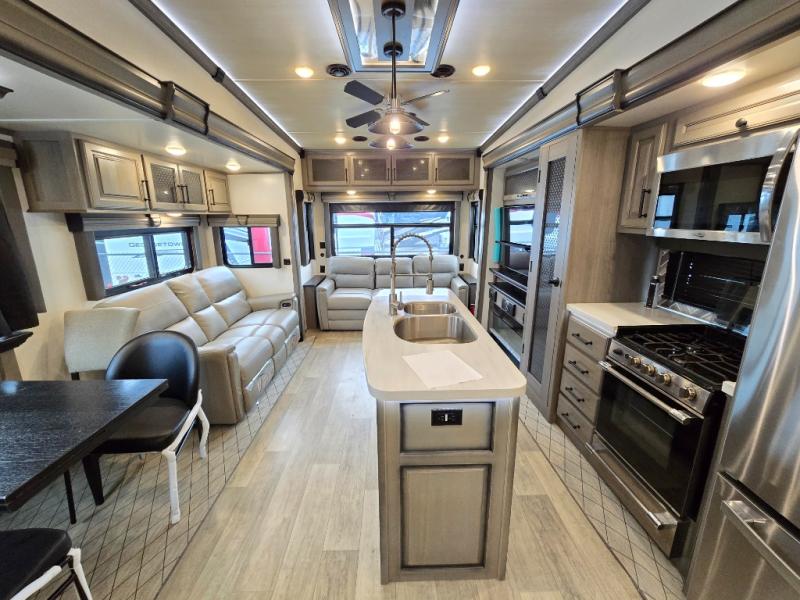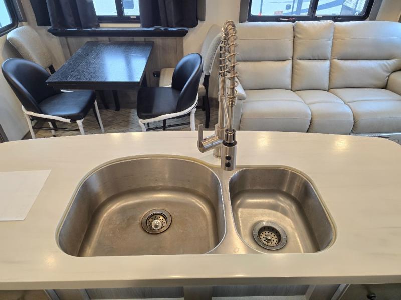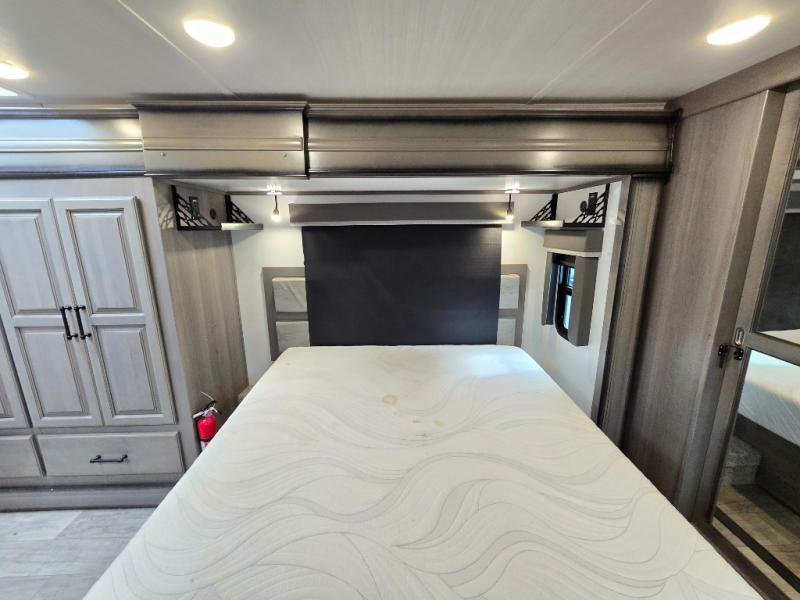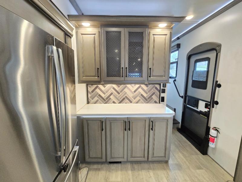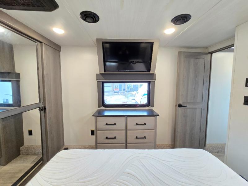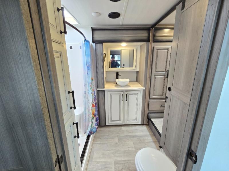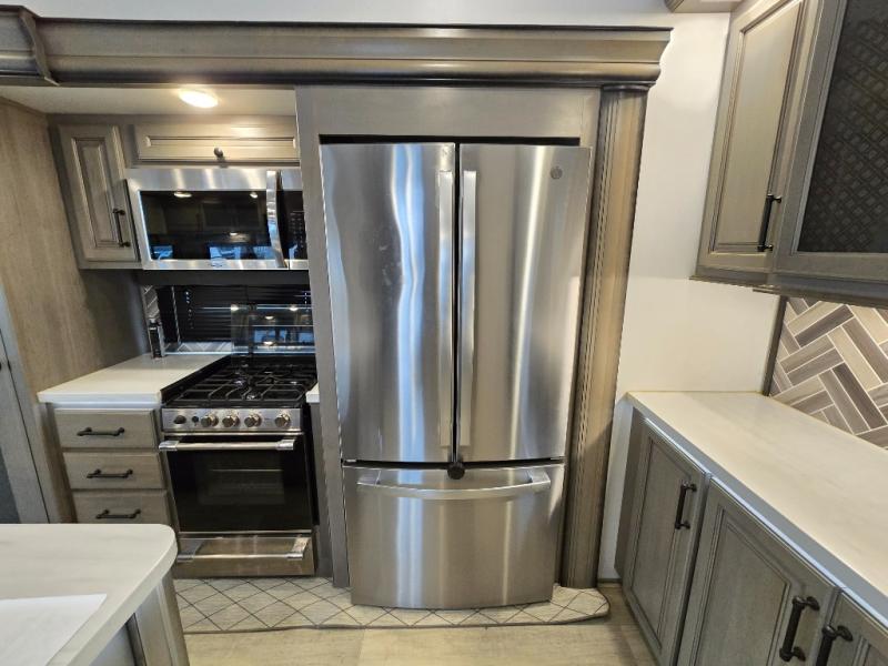 Sleep like royalty in the front master suite of this fifth wheel! It features a king bed slide with storage underneath, a front large closet, an area prepped to add an optional washer and dryer, a walk-in closet with a wardrobe, and an entrance into the dual entry bathroom. The chef can prepare their best meals with the glass top range, the pull-down spice rack, the kitchen island, and the hutch with countertop space below it. Enjoy your meals at the free standing legless dinette and then head to the rear living area for a relaxing evening watching your favorite movie on the 50" LCD HDTV while a fire goes in the 5,000 BTU decorative fireplace heater across from the power Thomas Payne theater seating and rear hide-a-bed sofa which can also transform into an extra sleeping space!