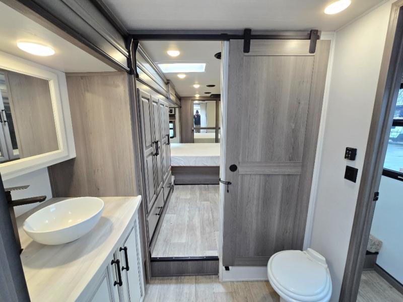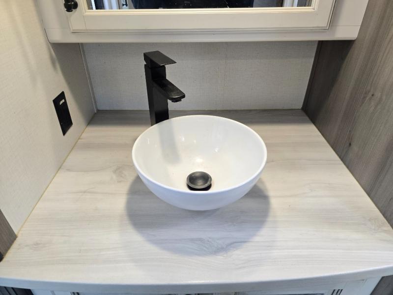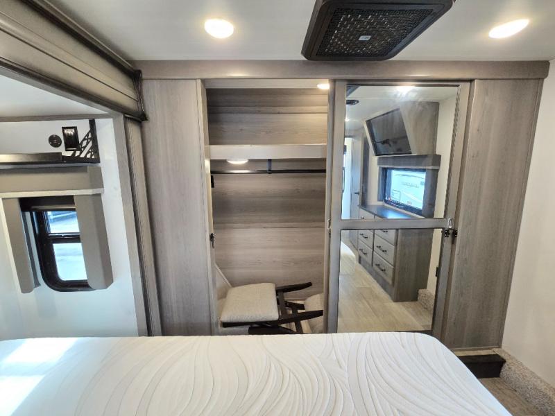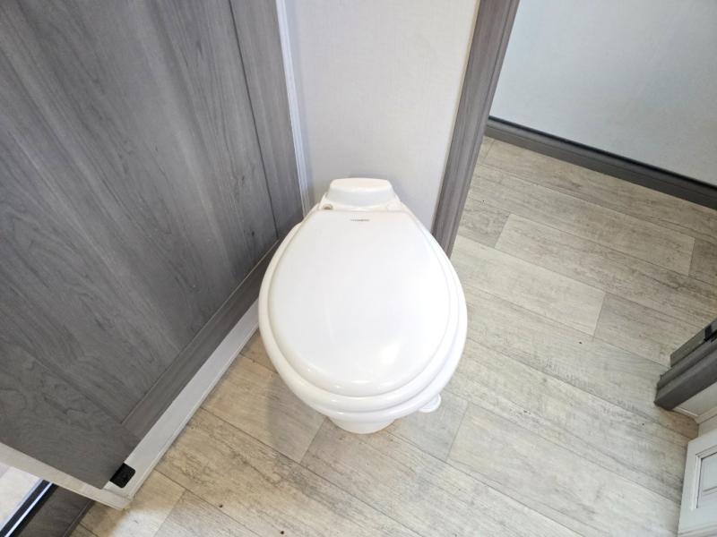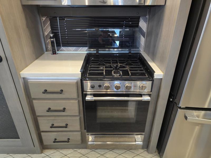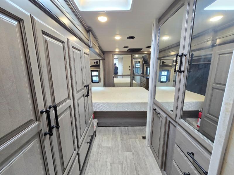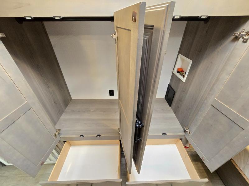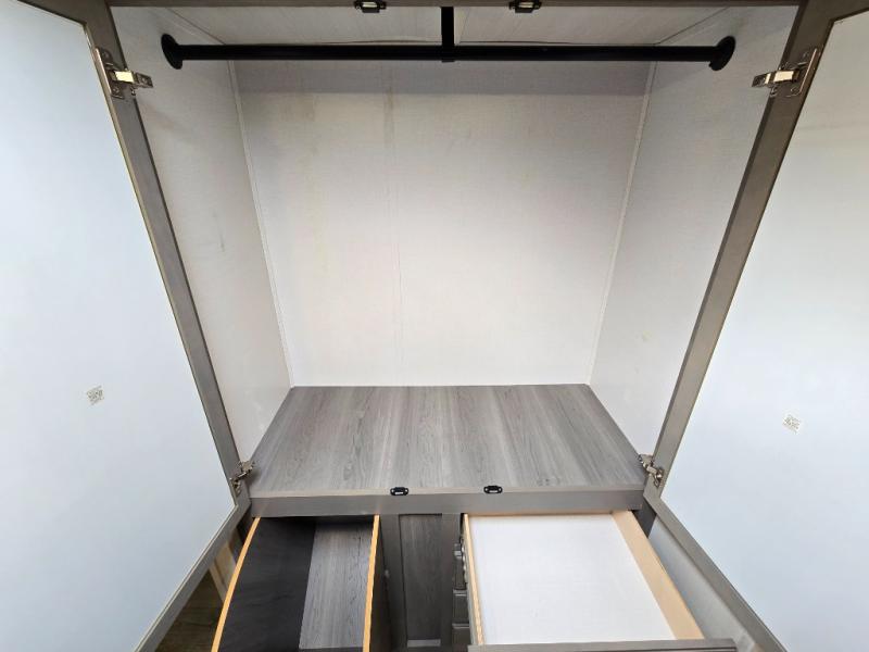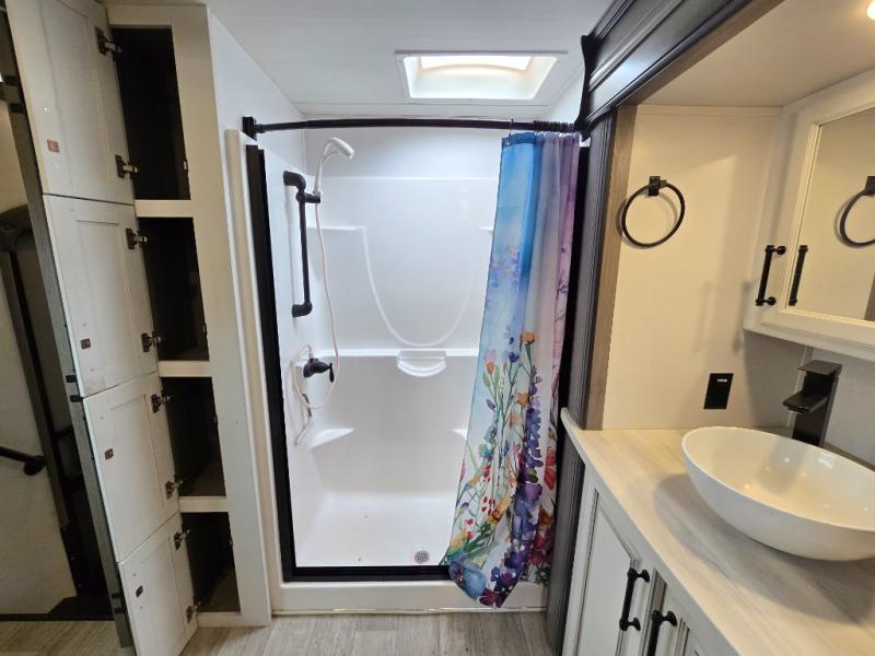 Sleep like royalty in the front master suite of this fifth wheel! It features a king bed slide with storage underneath, a front large closet, an area prepped to add an optional washer and dryer, a walk-in closet with a wardrobe, and an entrance into the dual entry bathroom. The chef can prepare their best meals with the glass top range, the pull-down spice rack, the kitchen island, and the hutch with countertop space below it. Enjoy your meals at the free standing legless dinette and then head to the rear living area for a relaxing evening watching your favorite movie on the 50" LCD HDTV while a fire goes in the 5,000 BTU decorative fireplace heater across from the power Thomas Payne theater seating and rear hide-a-bed sofa which can also transform into an extra sleeping space!