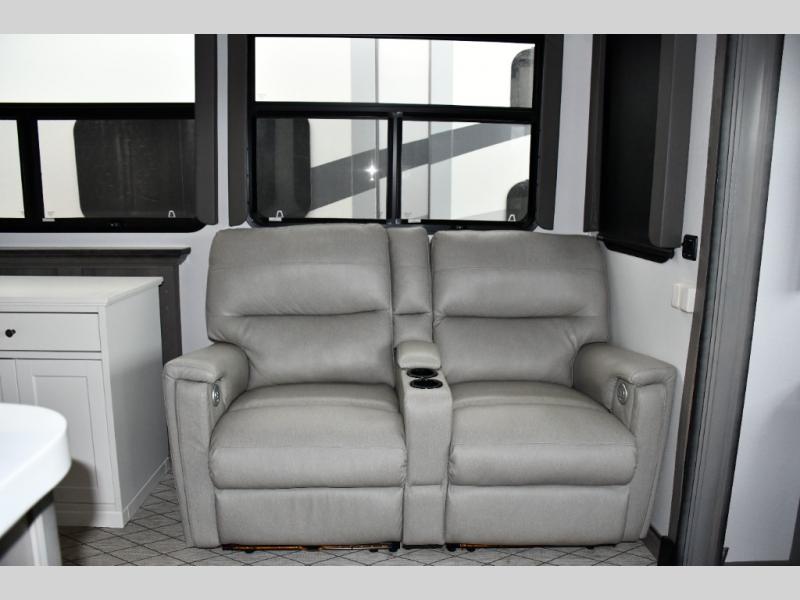 Rear Living Area – Kick back with theater seating, a sofa, and a perfect view of the entertainment center and fireplace.