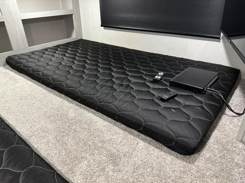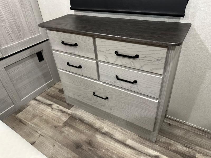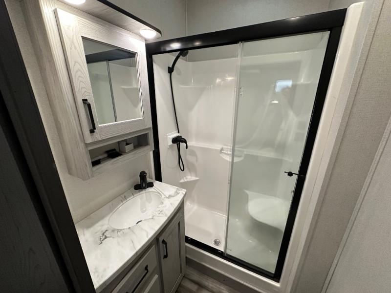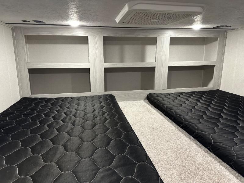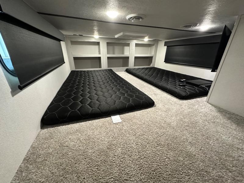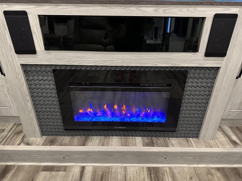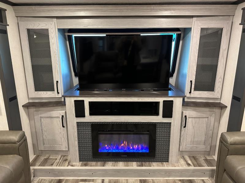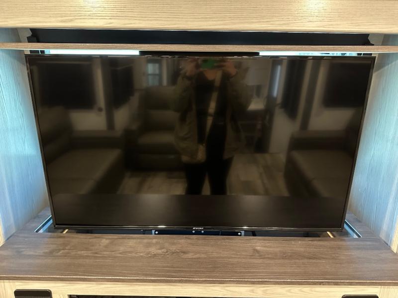 Include all of your favorite people on your next adventure in this Montana High Country fifth wheel! Not only is there a rear private bedroom with a king-size bed for you, but there is also a loft above with stairs that take you to the bunk mats. Now your kids will have their own space too. You can even host a few other travelers up front in the separate living room on the two hide-a-bed sofas. This area will be perfect for cozy sleeping because of the fireplace, and you can even watch a movie as you drift off to sleep because of the 50" LCD TV too. The full bathroom has a pivot-hinge door and a 48" x 30" shower with seat, and the kitchen has a breakfast bar that you can sit at to eat your cereal each morning