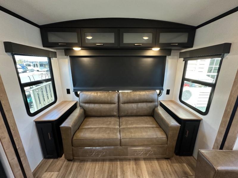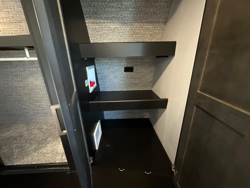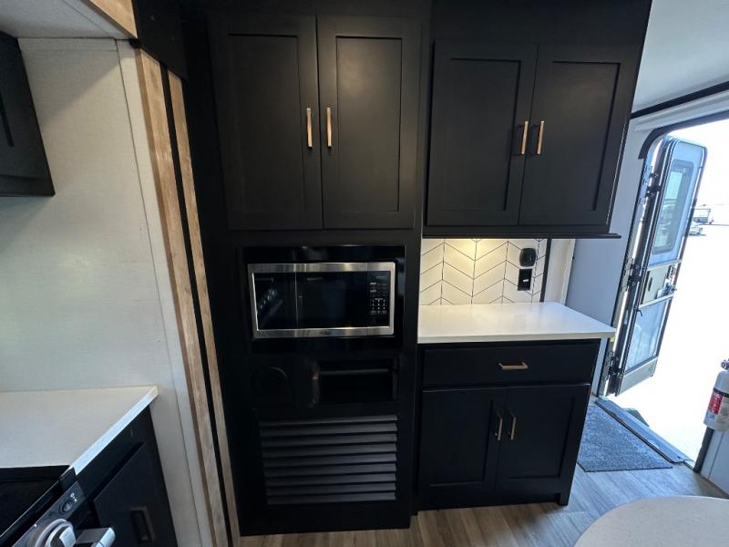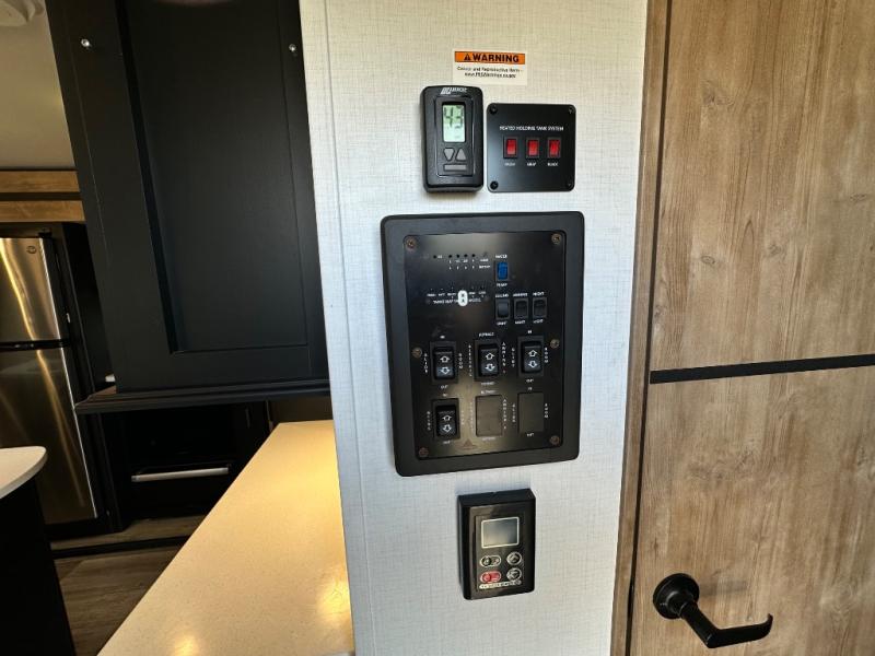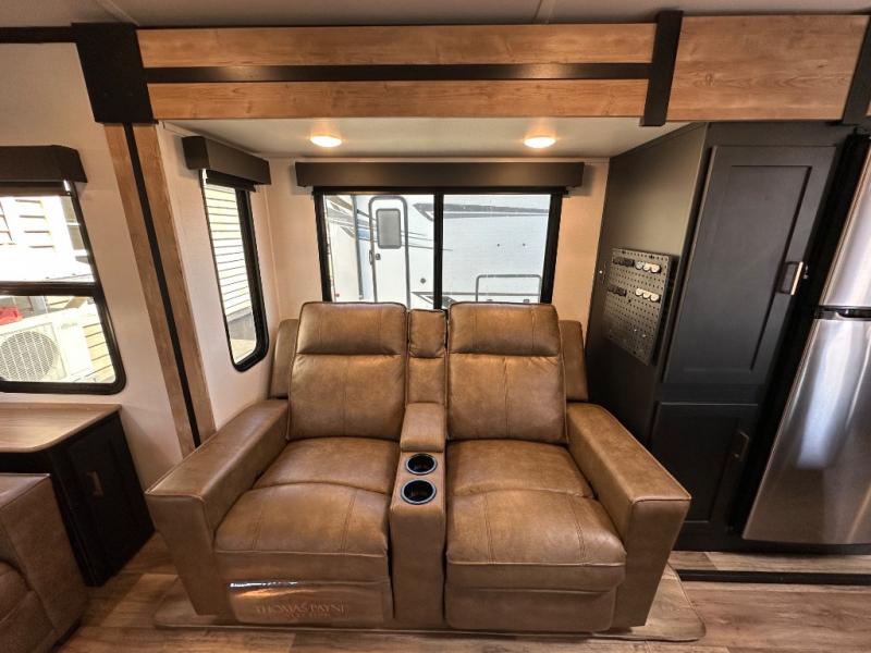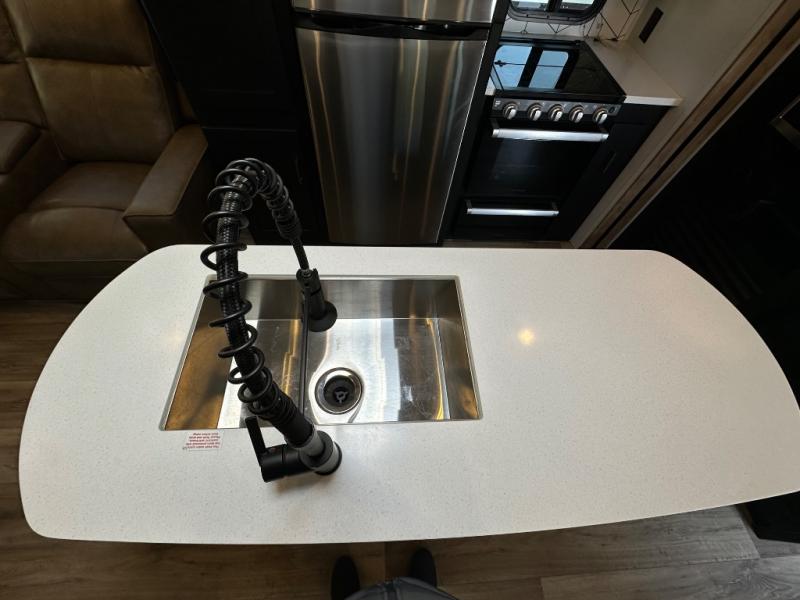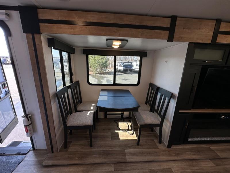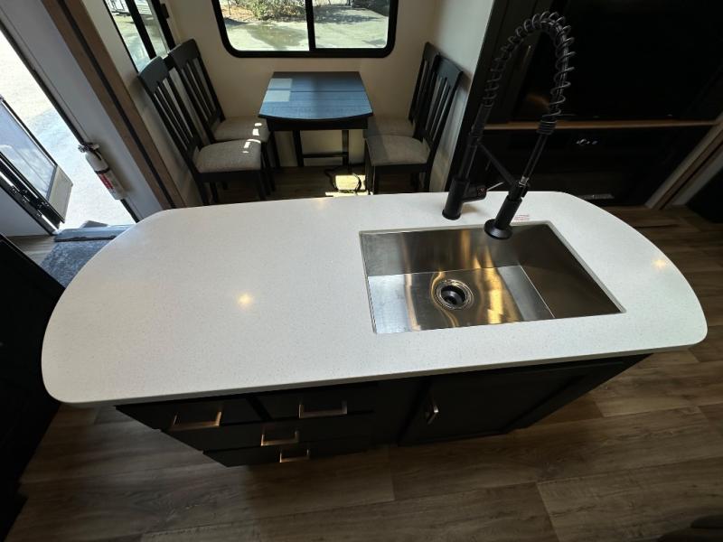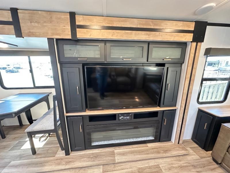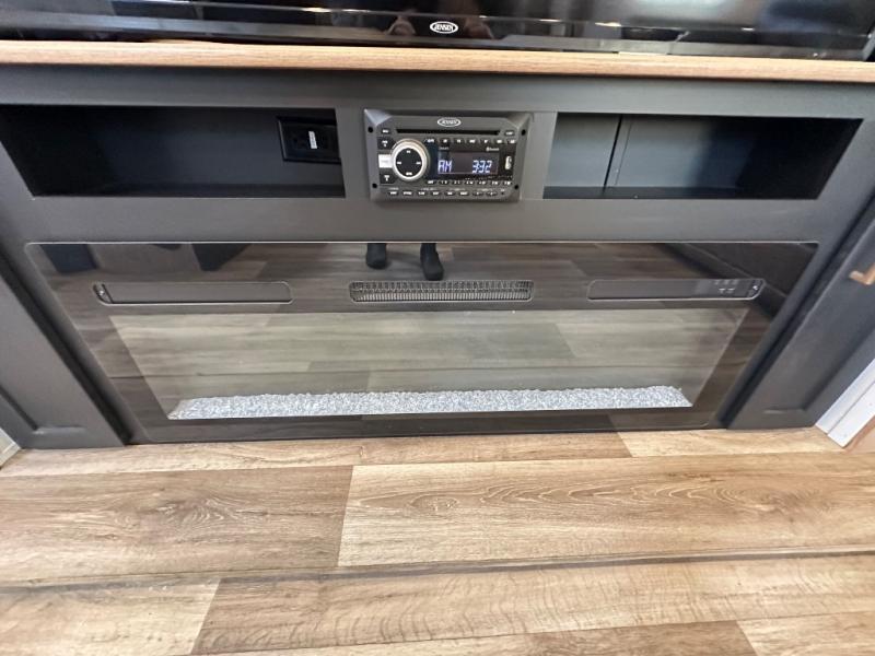 A spacious rear living area is created by two opposing slide outs giving everyone plenty of floor space to move from the sofa sleeper to the double entry bathroom and front private bedroom. You can relax on the theater seats while watching the 50" HDTV with fireplace below, and dine at the booth dinette. The kitchen island is a great place to wash the veggies and fruit, and prepare meals. The cook will have full amenities including more counter space near the microwave. And there is an outside kitchen with a flip-out stove and more. The slide out king bed gives you more space in the front bedroom, and you will find plenty of storage and a place for your best friend in the built-in pet kennel. You may choose to change the 10 cu. ft. refrigerator to an 8 cu. ft. option and/or replace the dinette that comes standard with a table and chairs option.