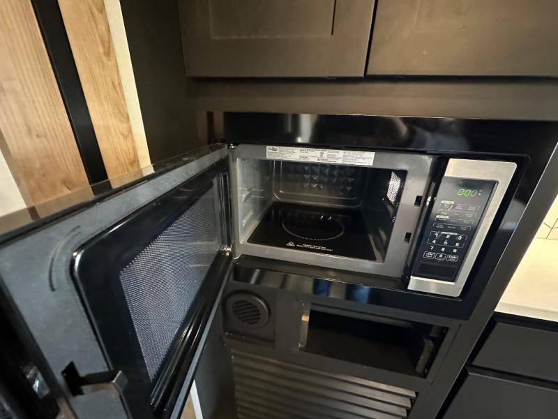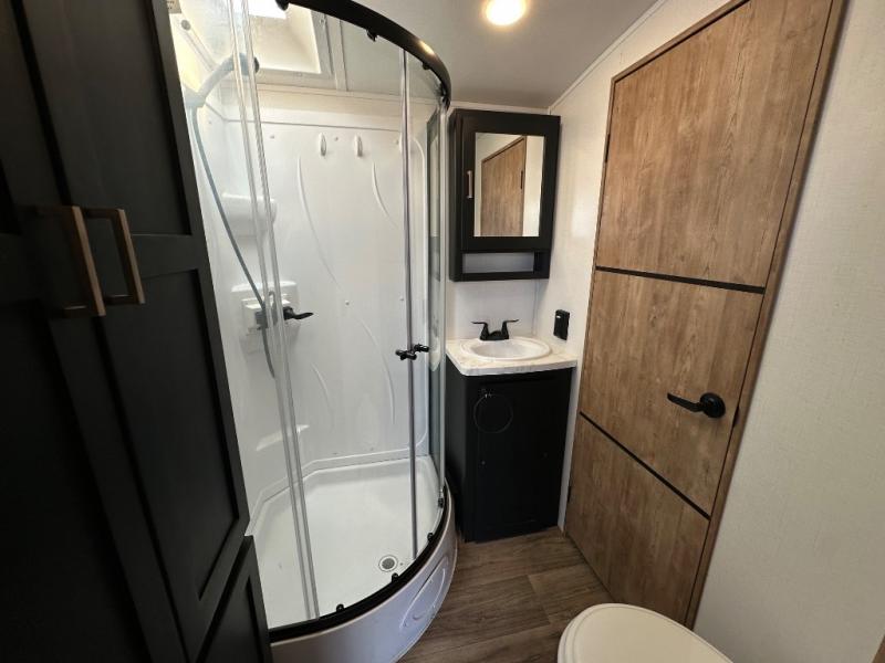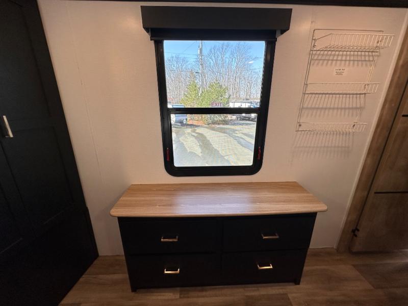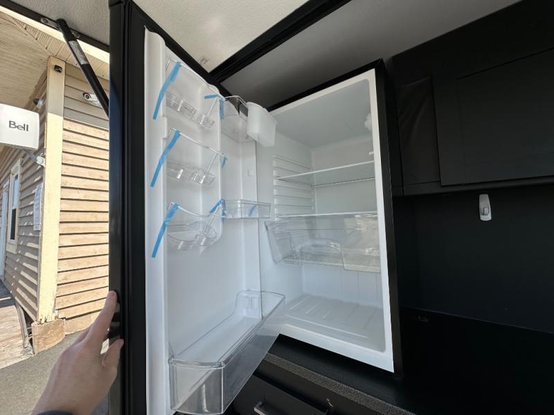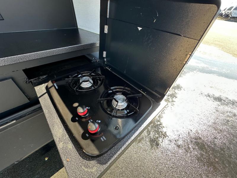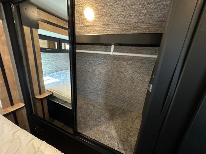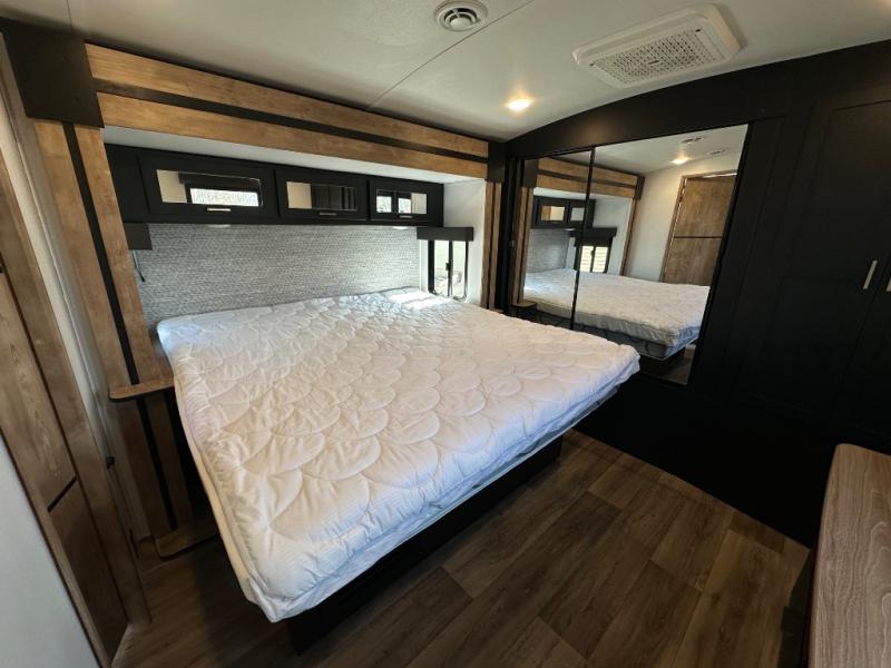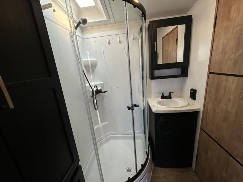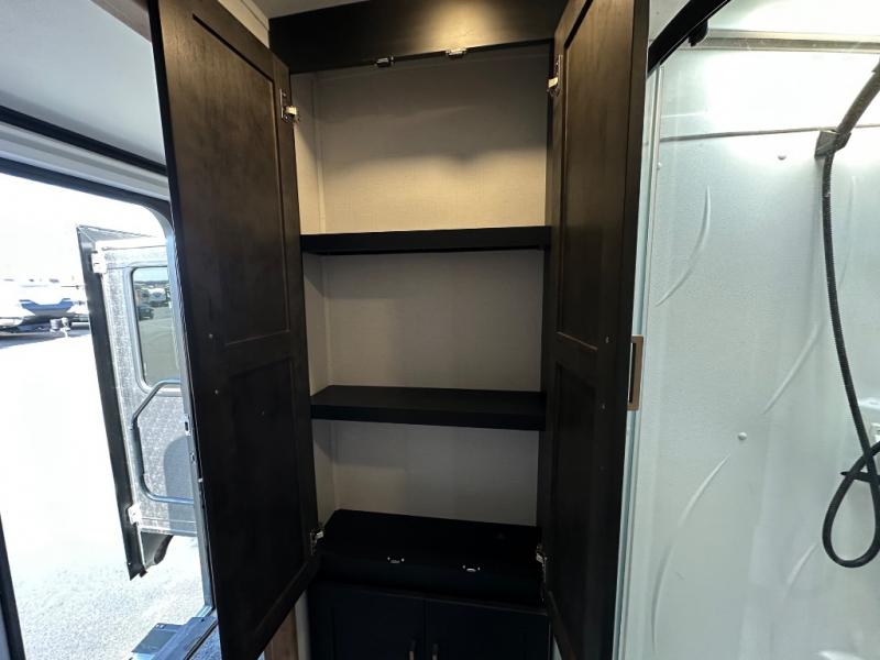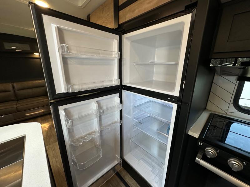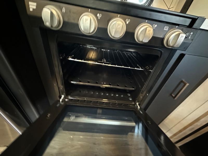 A spacious rear living area is created by two opposing slide outs giving everyone plenty of floor space to move from the sofa sleeper to the double entry bathroom and front private bedroom. You can relax on the theater seats while watching the 50" HDTV with fireplace below, and dine at the booth dinette. The kitchen island is a great place to wash the veggies and fruit, and prepare meals. The cook will have full amenities including more counter space near the microwave. And there is an outside kitchen with a flip-out stove and more. The slide out king bed gives you more space in the front bedroom, and you will find plenty of storage and a place for your best friend in the built-in pet kennel. You may choose to change the 10 cu. ft. refrigerator to an 8 cu. ft. option and/or replace the dinette that comes standard with a table and chairs option.