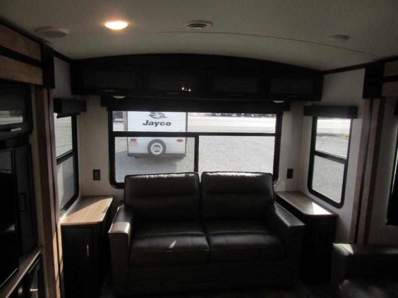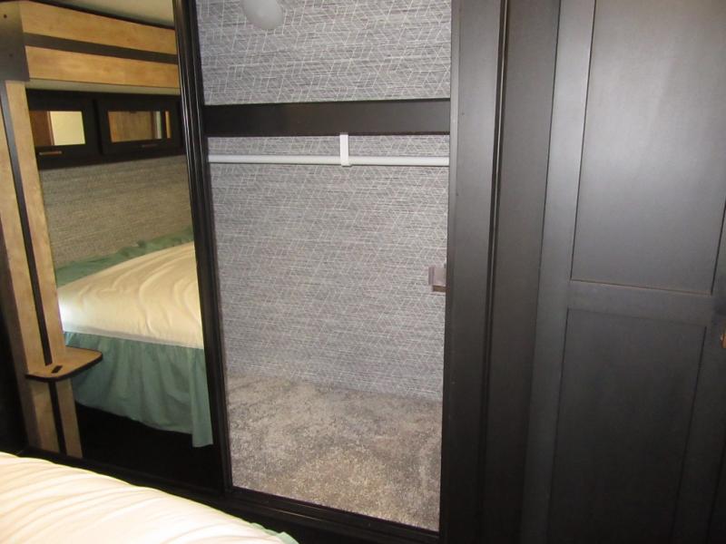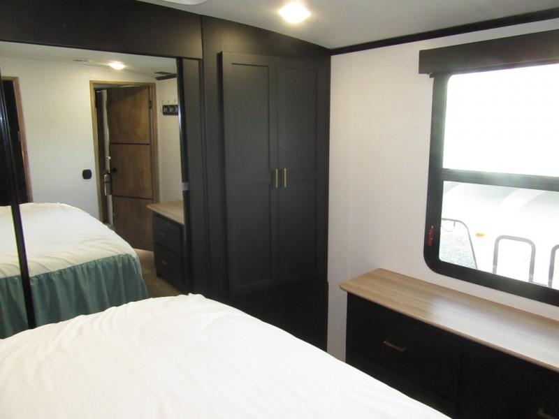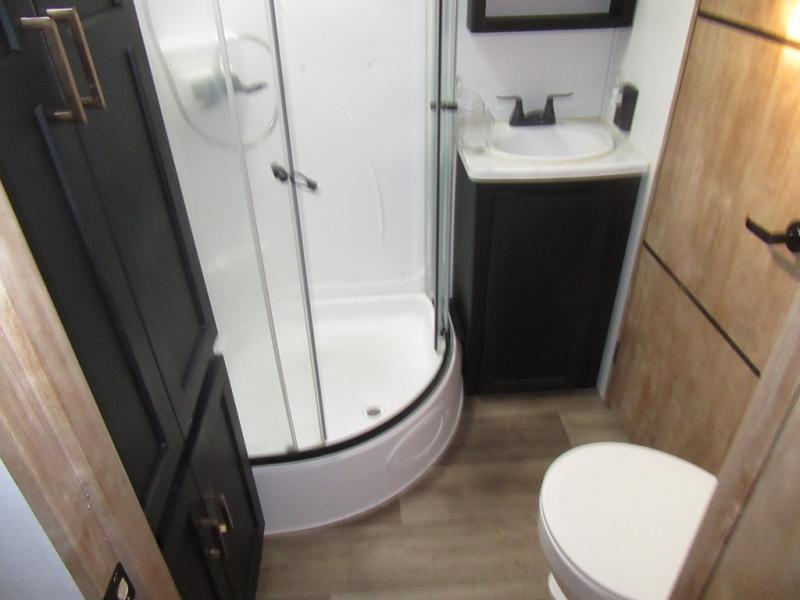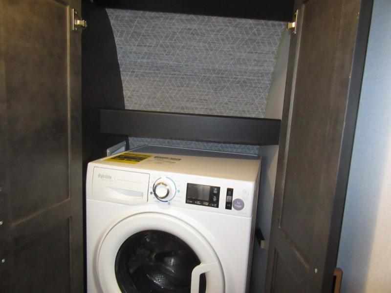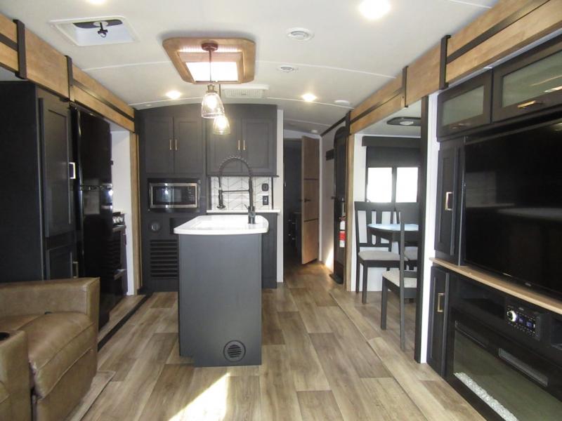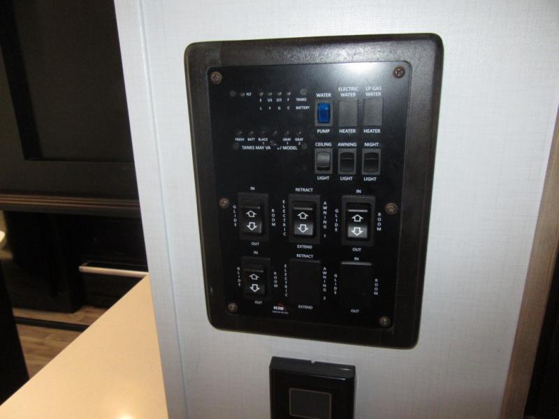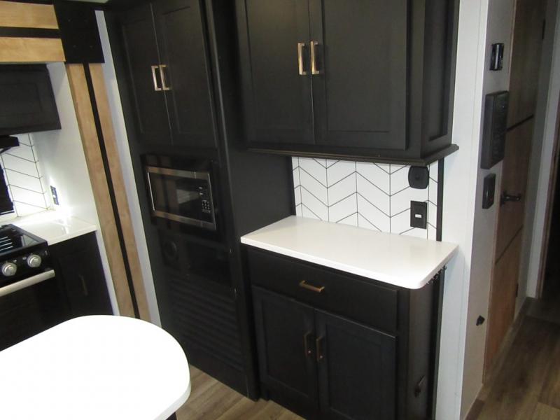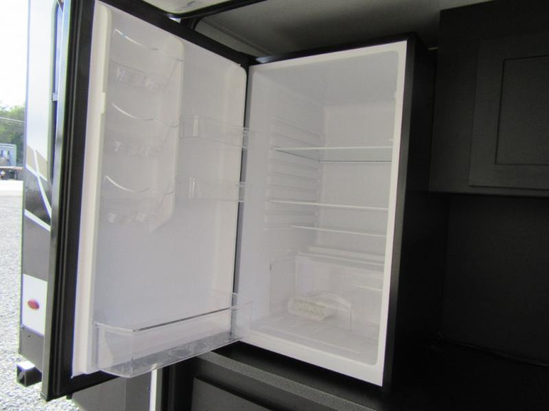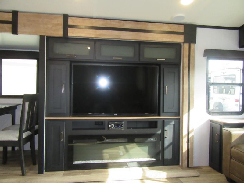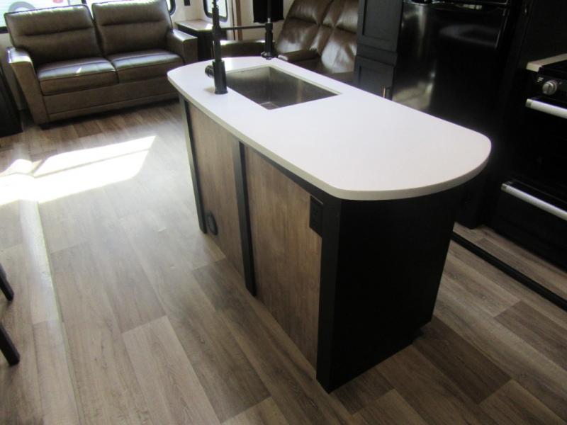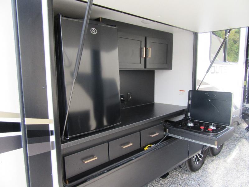 A spacious rear living area is created by two opposing slide outs giving everyone plenty of floor space to move from the sofa sleeper to the double entry bathroom and front private bedroom. You can relax on the theater seats while watching the 50" HDTV with fireplace below, and dine at the booth dinette. The kitchen island is a great place to wash the veggies and fruit, and prepare meals. The cook will have full amenities including more counter space near the microwave. And there is an outside kitchen with a flip-out stove and more. The slide out king bed gives you more space in the front bedroom, and you will find plenty of storage and a place for your best friend in the built-in pet kennel. You may choose to change the 10 cu. ft. refrigerator to an 8 cu. ft. option and/or replace the dinette that comes standard with a table and chairs option.