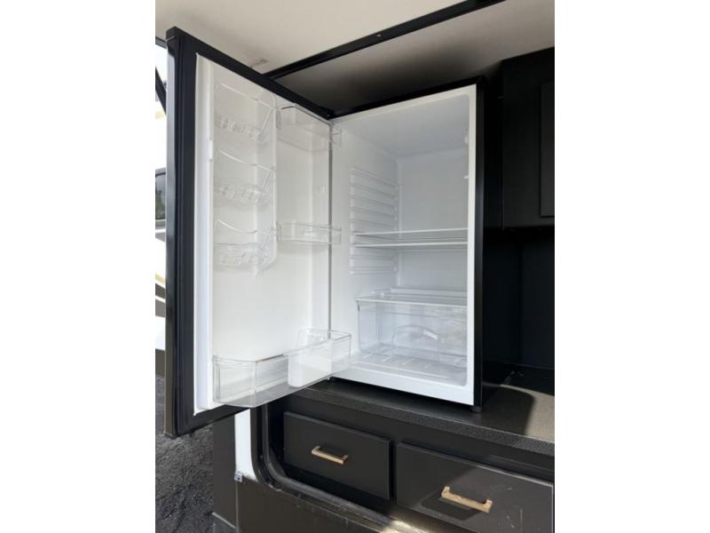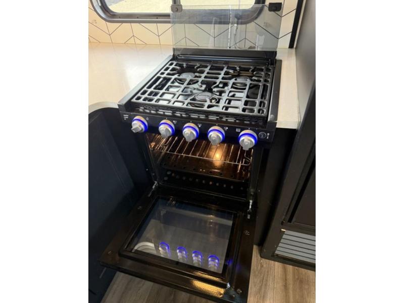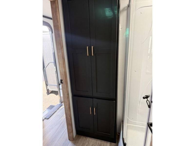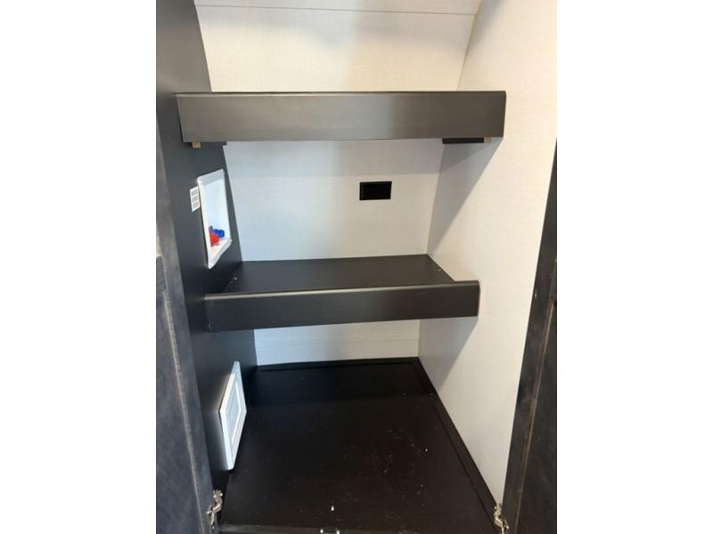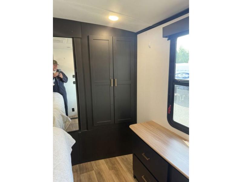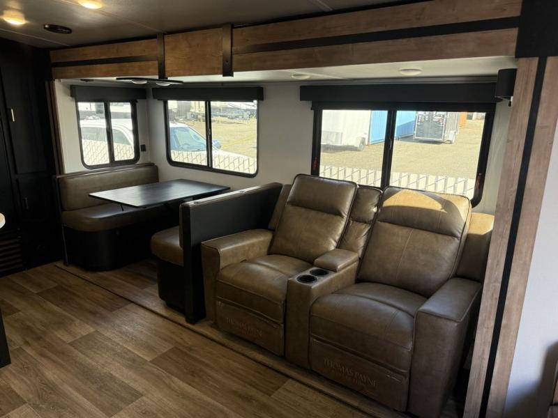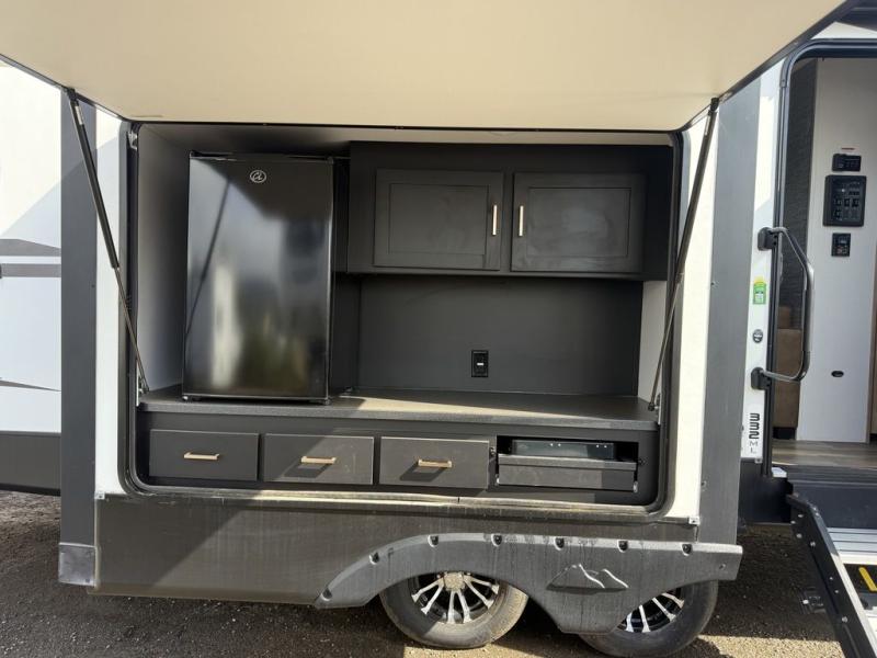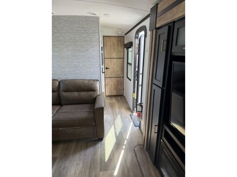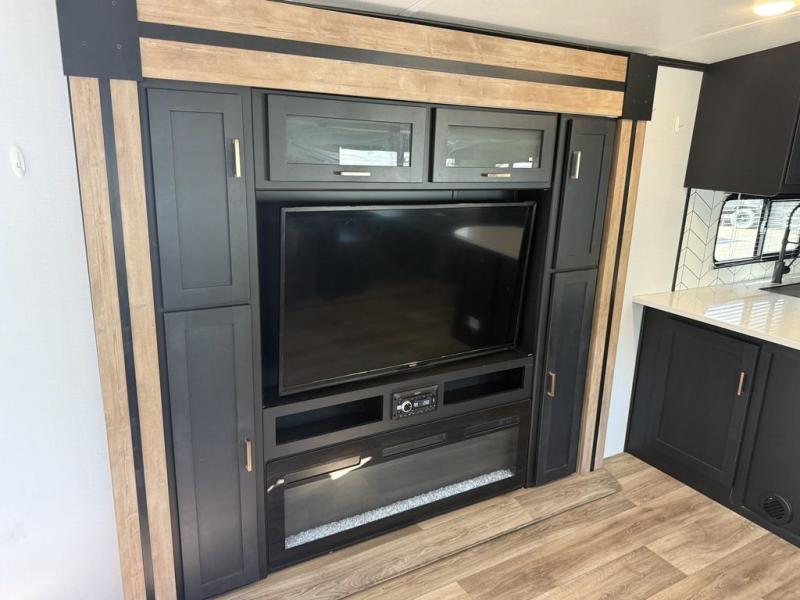 Get ready for fun in the great outdoors with this travel trailer at your favorite campsite! You can hike, visit with other RVers, and enjoy a spacious middle living area and rear kitchen to relax in after making a meal. There is a sleeper sofa and theater seating as well as a booth dinette or choose the table and chairs option if you prefer that type of seating. The 50" TV provides inside entertainment and the fireplace is cozy and inviting. The kitchen offers a U-shaped counter for more prep space, full kitchen amenities including a 10 cu. ft. refrigerator and pantry for all your food. The cook will have the choice of making meals using the outside kitchen that offers a flip-out stove and outside refrigerator to hold more beverages. There is a double entry bathroom for convenience, a king bed slide for extra floor space in the front bedroom, and lots of clothing storage. You might even like to add the washer/dryer option if you plan to stay awhile.