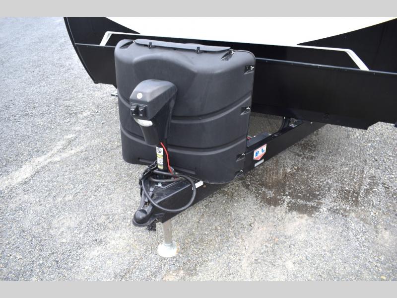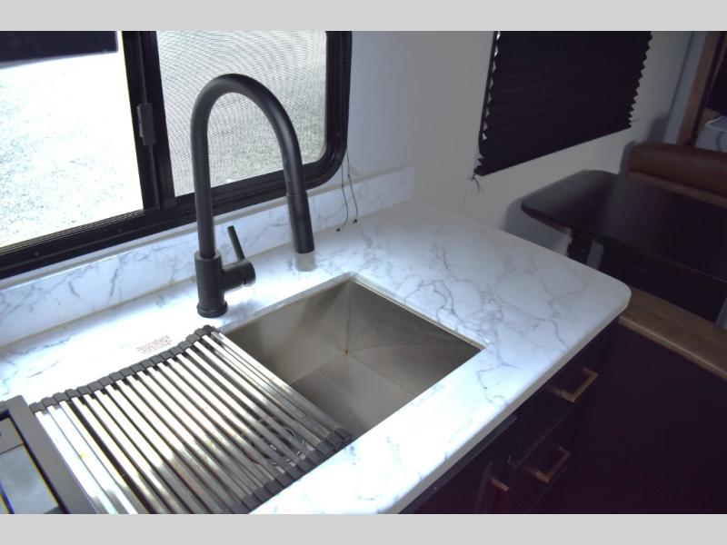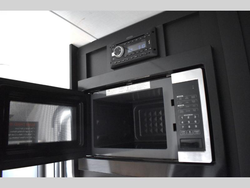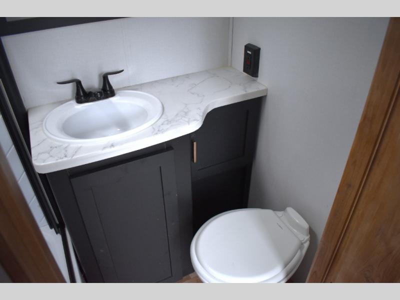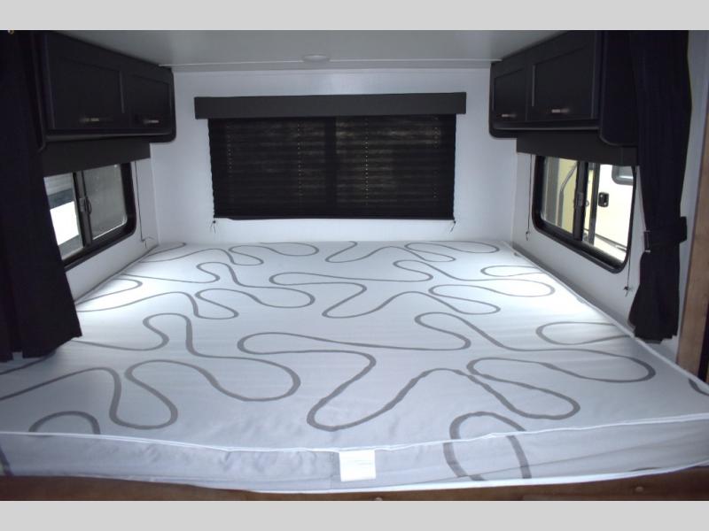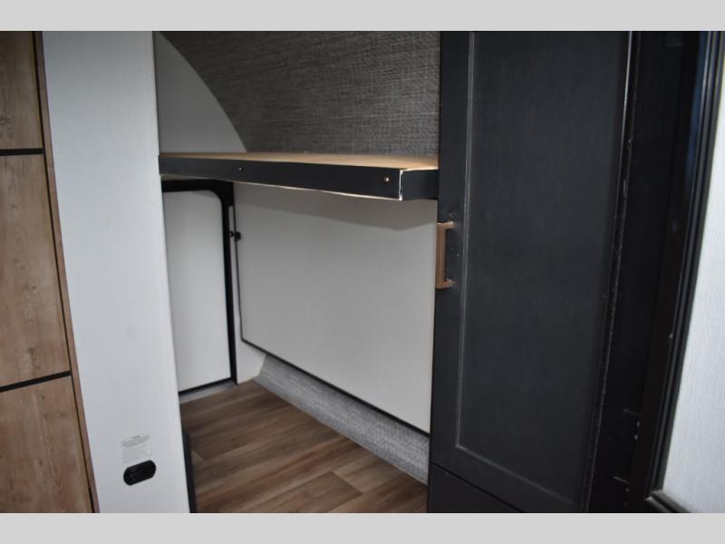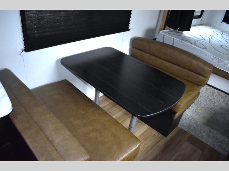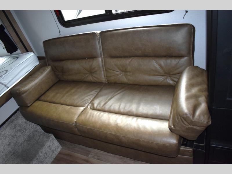 Looking to sleep like a king after hiking, biking or relaxing around the campsite? This trailer provides a rear slide king bed giving you more interior floor space and a comfortable place to sleep each night. Your friends can sleep on the front flip-down bunk beds and/or the sofa sleeper and booth dinette. The cook will have full kitchen amenities to whip up meals including a 10 cu. ft. refrigerator unless you would prefer the 8 cu. ft. option. There is an LCD TV to watch while sitting on the furniture while you take turns getting cleaned up in the full bathroom which also includes linen storage.