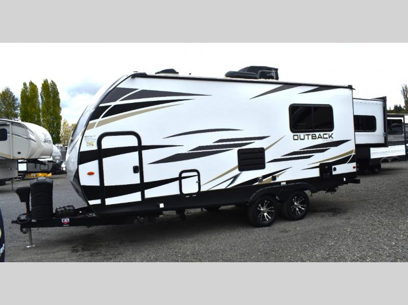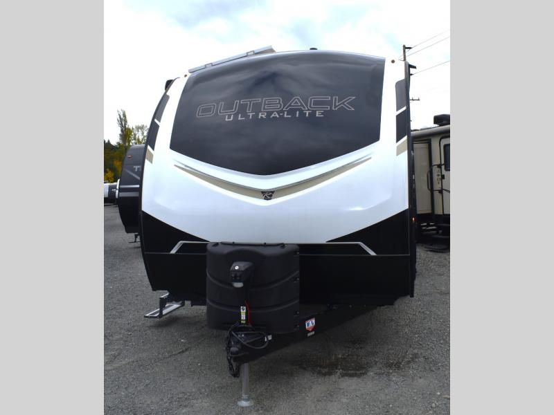 With any Outback Ultra Lite travel trailer or toy hauler by Keystone, you begin with a BAL Norco huck bolted "Z" channel frame, and there is a pinch rolled laminated gel-coated fiberglass exterior, a leaf spring suspension system, large panoramic black framed tinted safety glass windows, plus a power tongue jack and LCI power stabilizing jacks for easy setup. The interior offers pre-drilled and screwed hand-glazed modern cabinetry, extra tall slide height for maximum space, in-floor heating ducts, a Dream dinette with max-store for more storage space, and an On Demand hot water heater to mention a few highlights. Make your lightweight towing decision today, choose a comfortable and stylish Outback Ultra Lite today!