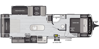 With any Outback Ultra Lite travel trailer or toy hauler by Keystone, you begin with a BAL Norco huck bolted "Z" channel frame, and there is a pinch rolled laminated gel-coated fiberglass exterior, a leaf spring suspension system, large panoramic black framed tinted safety glass windows, plus a power tongue jack and LCI power stabilizing jacks for easy setup. The interior offers pre-drilled and screwed hand-glazed modern cabinetry, extra tall slide height for maximum space, in-floor heating ducts, a Dream dinette with max-store for more storage space, and an On Demand hot water heater to mention a few highlights. Make your lightweight towing decision today, choose a comfortable and stylish Outback Ultra Lite today!