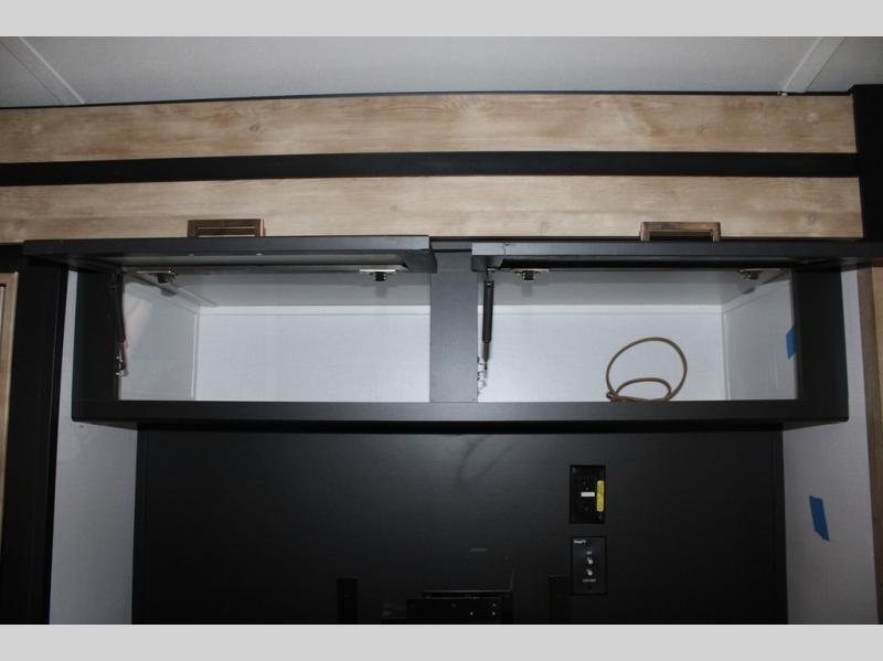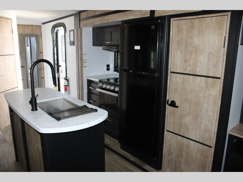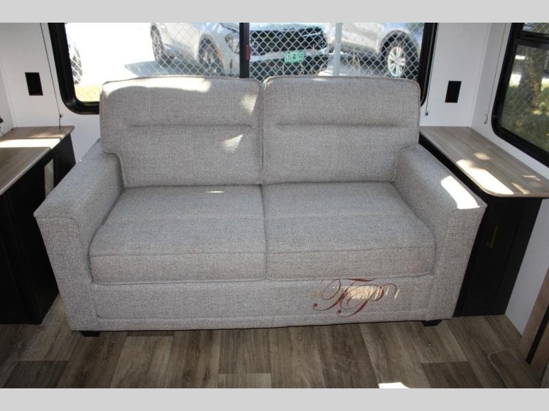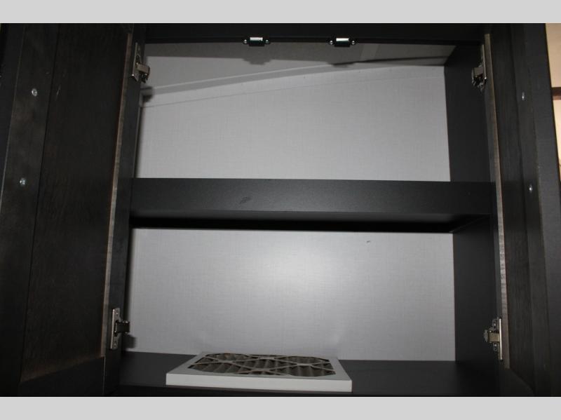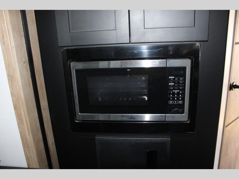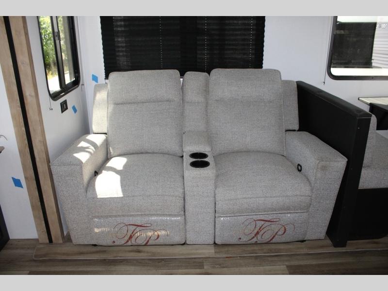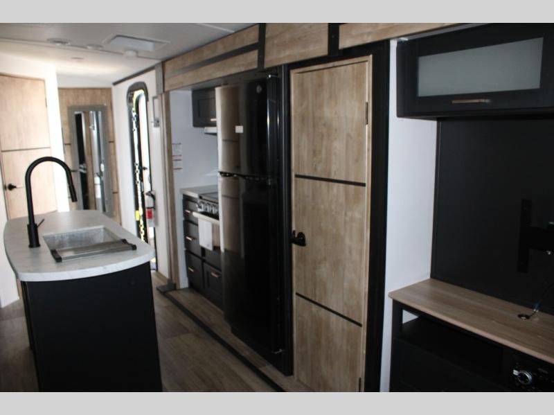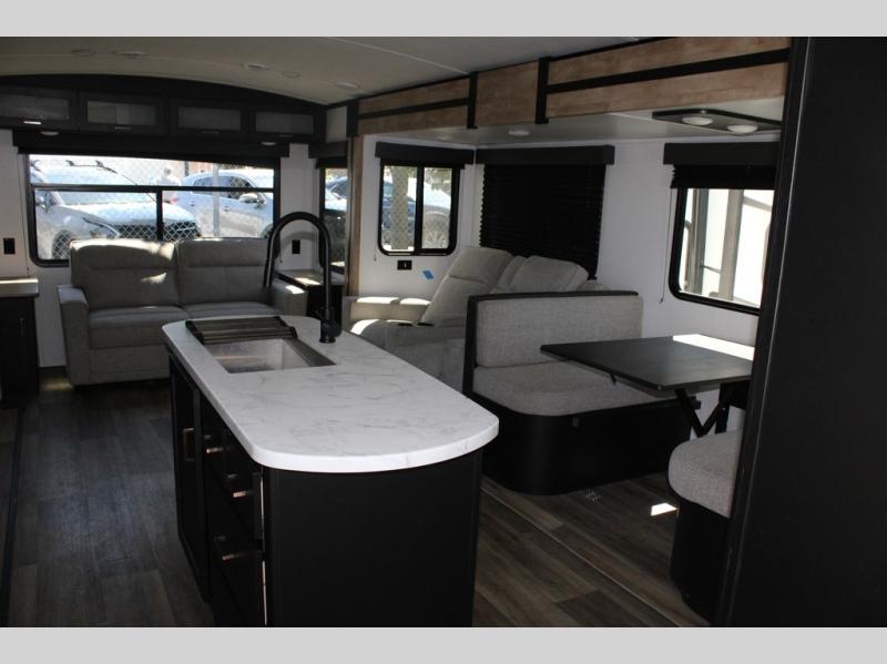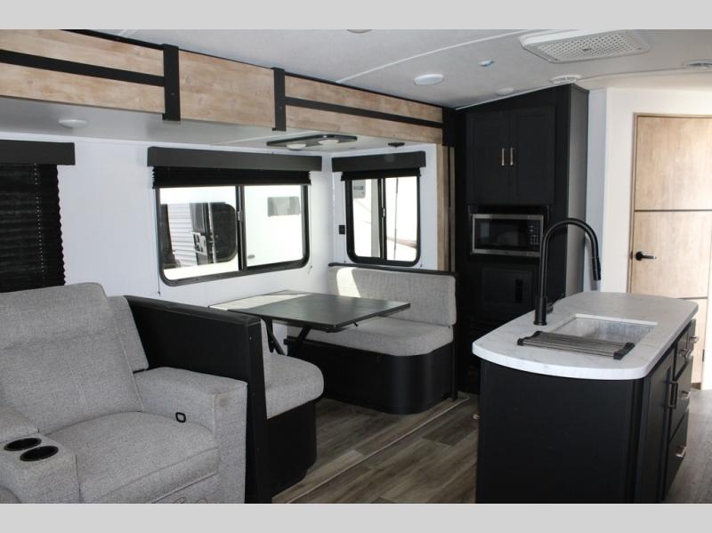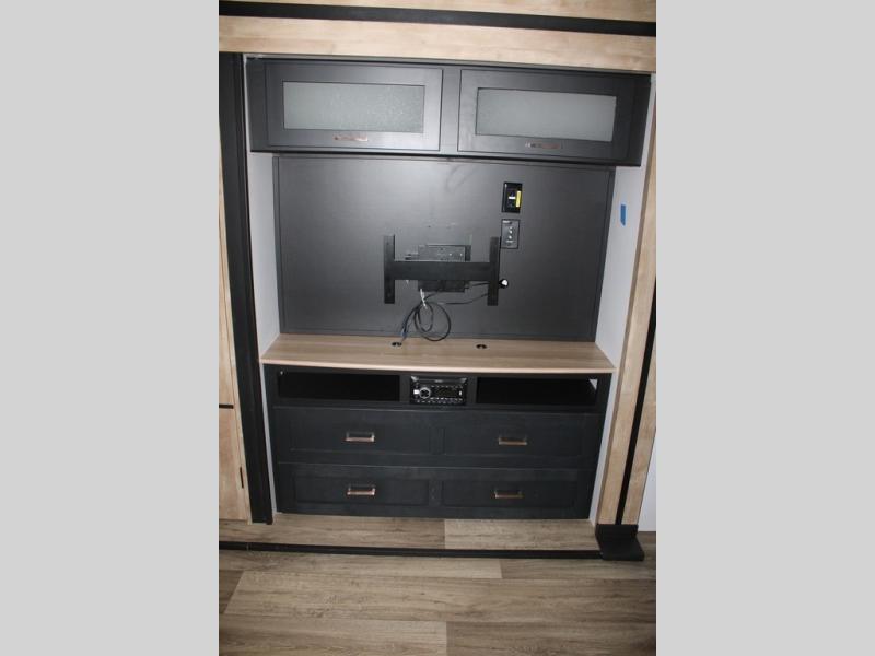 Spacious, inviting and comfortable is what everyone will be saying when they visit you at the campsite! Your friends can relax and visit inside on the sofa sleeper, the theater seats and/or the booth dinette. Yet you can choose a table and chairs option in place of the dinette if you prefer that type of seating. The dual opposing slides in the main living and kitchen area allow plenty of floor space to move around the kitchen island to get to the curio, the dinette and all the appliances and amenities including the 10 cu. ft. refrigerator, the pull-out trash can, the large pantry, and the 50" TV with entertainment center and storage. The double entry bath allows access near the exterior entry and in the front bedroom which is complete with a queen bed and a space for your pet.