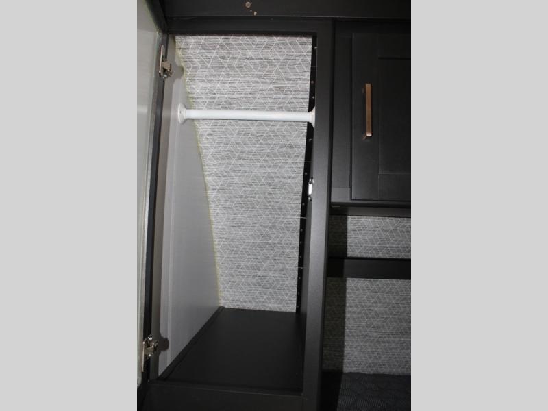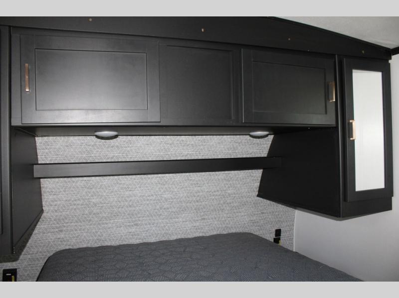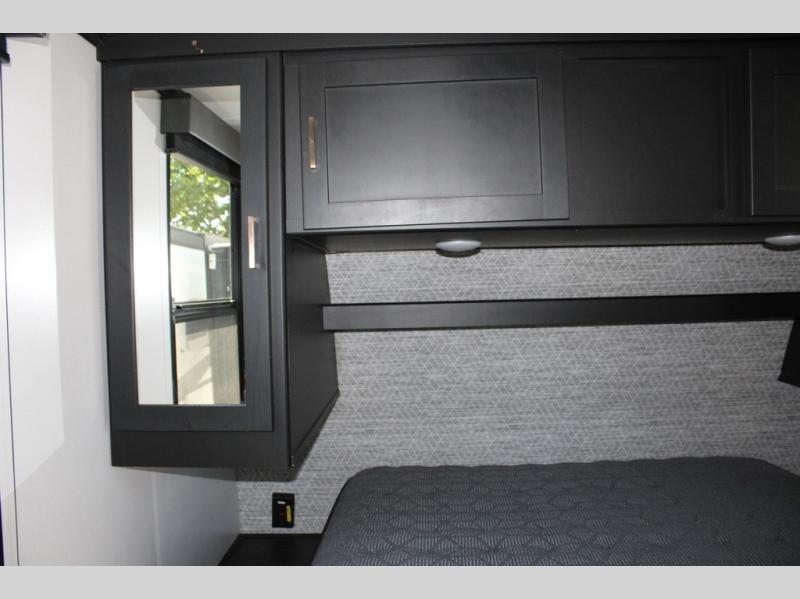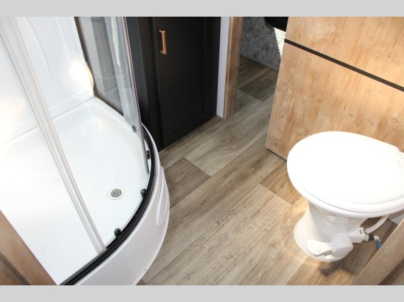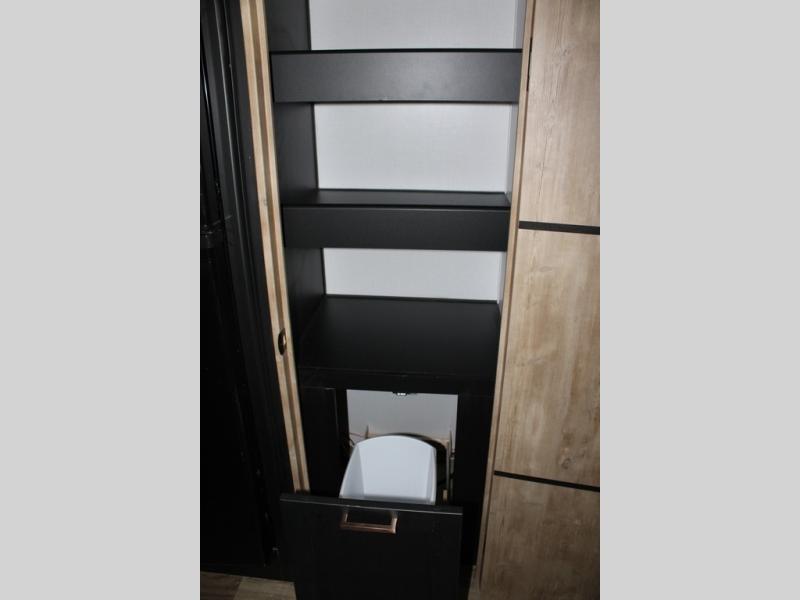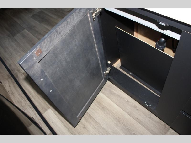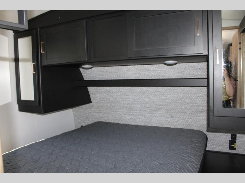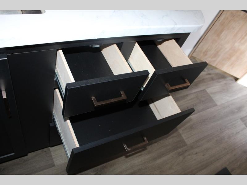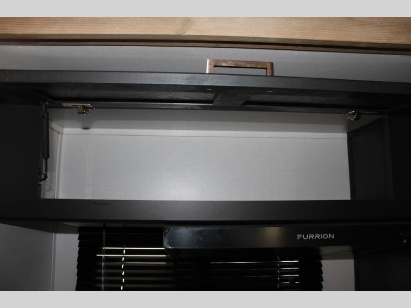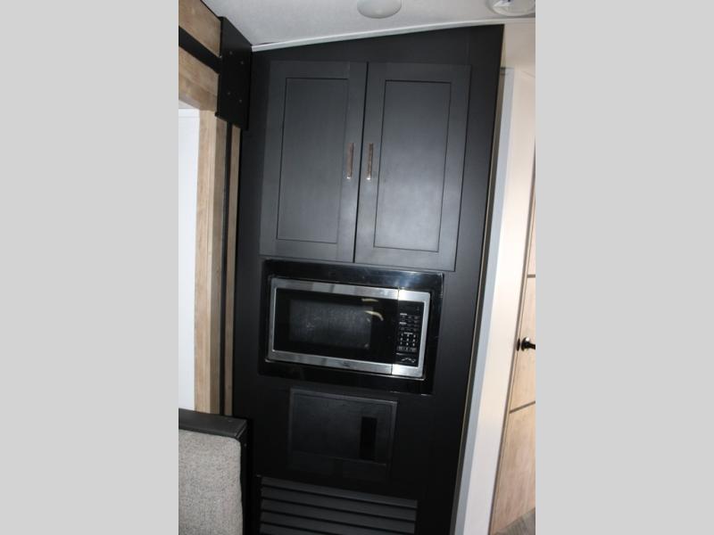 Spacious, inviting and comfortable is what everyone will be saying when they visit you at the campsite! Your friends can relax and visit inside on the sofa sleeper, the theater seats and/or the booth dinette. Yet you can choose a table and chairs option in place of the dinette if you prefer that type of seating. The dual opposing slides in the main living and kitchen area allow plenty of floor space to move around the kitchen island to get to the curio, the dinette and all the appliances and amenities including the 10 cu. ft. refrigerator, the pull-out trash can, the large pantry, and the 50" TV with entertainment center and storage. The double entry bath allows access near the exterior entry and in the front bedroom which is complete with a queen bed and a space for your pet.