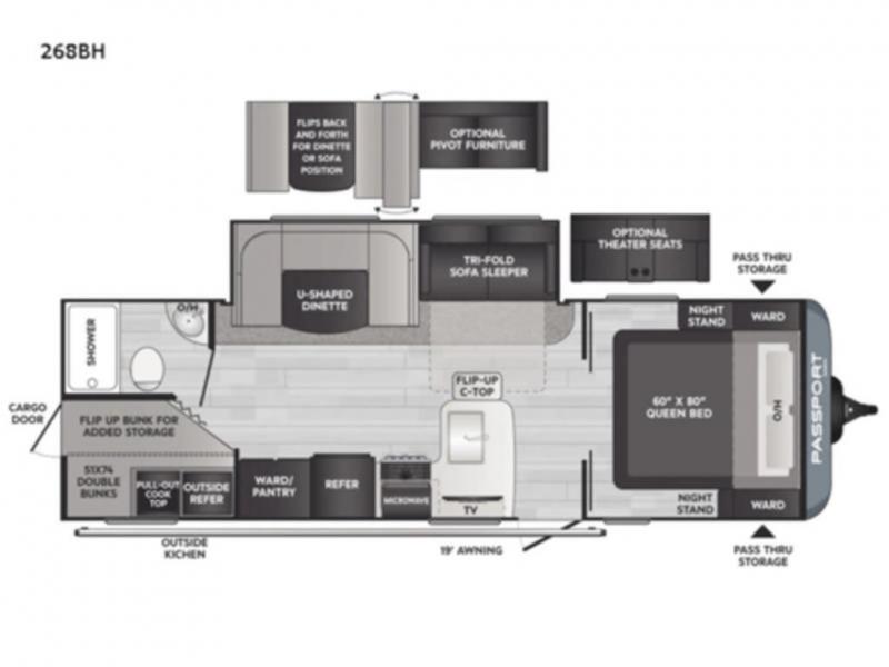 Let your days turn into weeks and your weeks turn into months with this Passport SL travel trailer! You can keep all of your gear stored effortlessly in the rear cargo door and the front pass-through storage compartment, and the interior also offers some storage space with the bedside wardrobes and large kitchen pantry or utilize this space as a wardrobe. You also have plenty of space to keep your perishable foods from spoiling with the interior 8-cubic foot refrigerator and in the exterior refrigerator in the outside kitchen. The tri-fold sofa sleeper and U-shaped dinette will provide you with some extra sleeping space so that you can invite friends or family to join you, and the full bathroom is going to keep everyone clean. You can also choose to add the optional Pivot furniture in place of the dinette and sofa or optional theater seats.