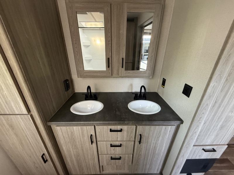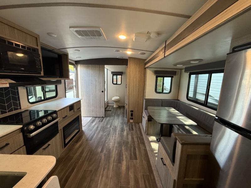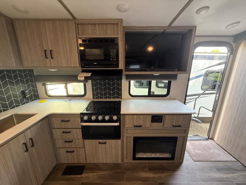 You won't even feel like you're camping in the woods with this travel trailer! It features a front private bedroom with a queen bed to lay your head on at night and wardrobes/nightstands on either side of it for your items. Prepare your best home cooked meals with the three burner cooktop and flip-up countertop then enjoy them at the U-shaped dinette with the refrigerator right next to it so you don't have to go far for a drink refill. The dinette is also across from the entertainment center with a fireplace for a cozy evening indoors, plus you can switch out the dinette for an optional theater dinette. The full rear bathroom has a dual sink vanity for two to get ready at once and an area prepped to add an optional washer and dryer for clean clothes the whole trip!