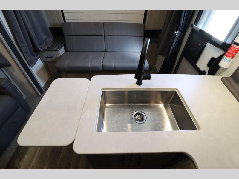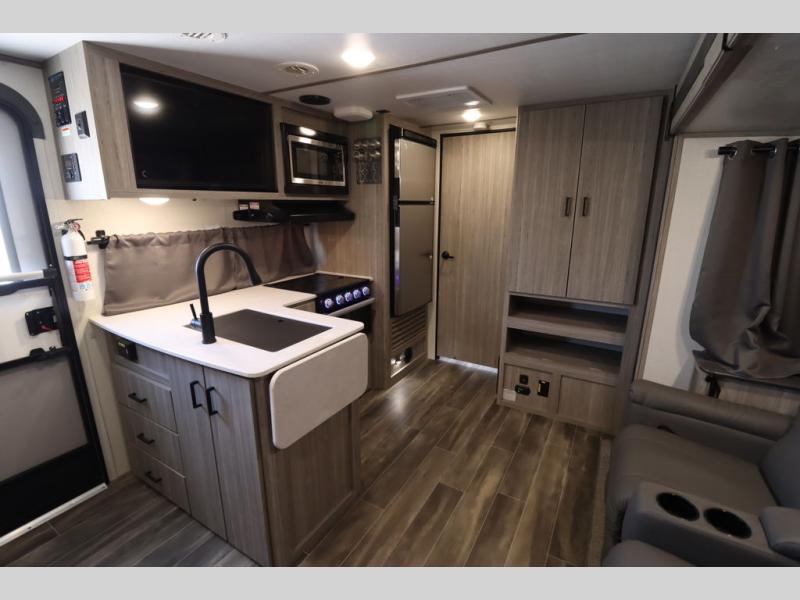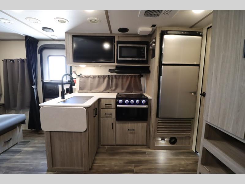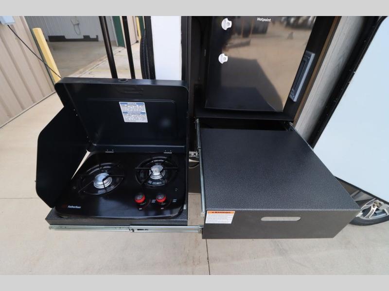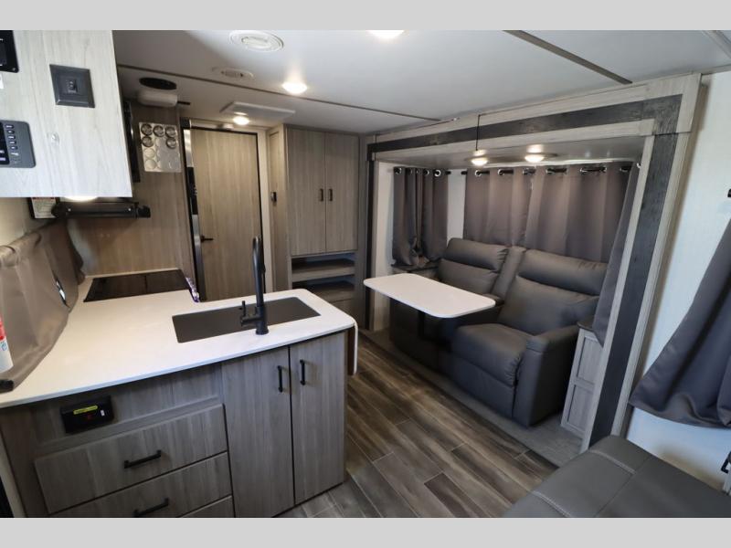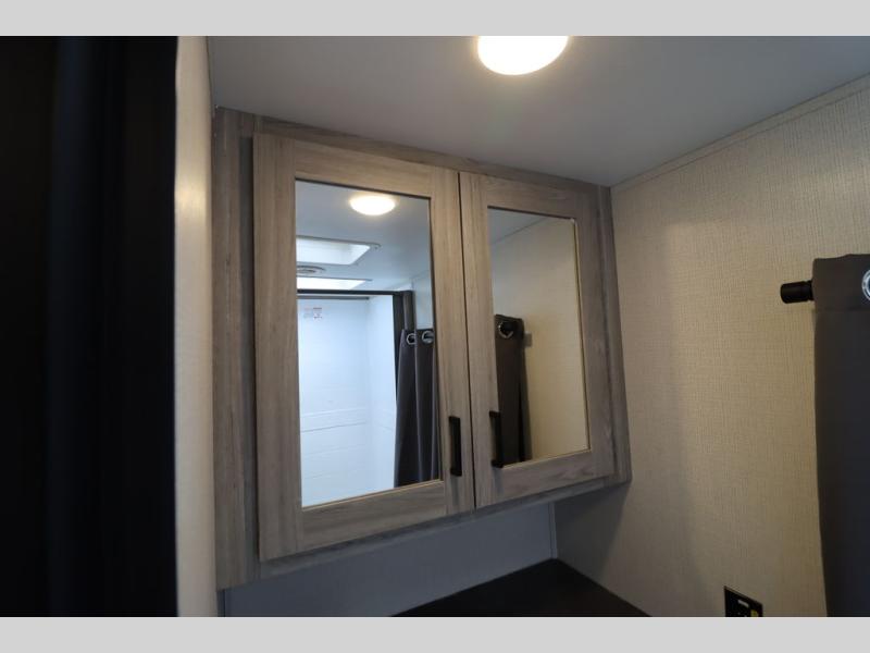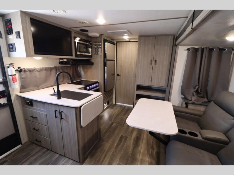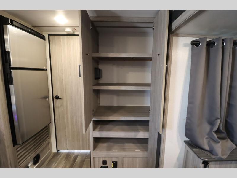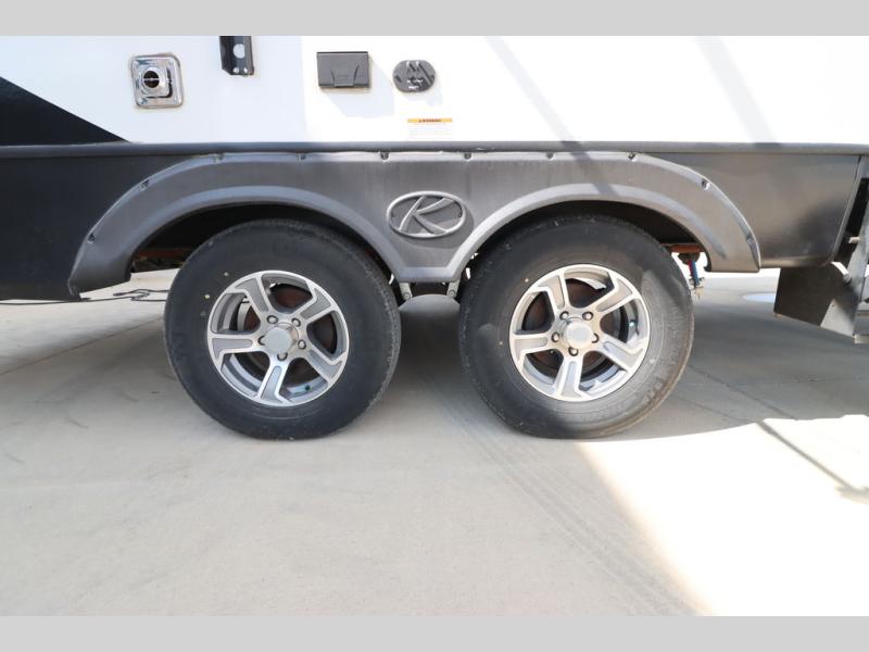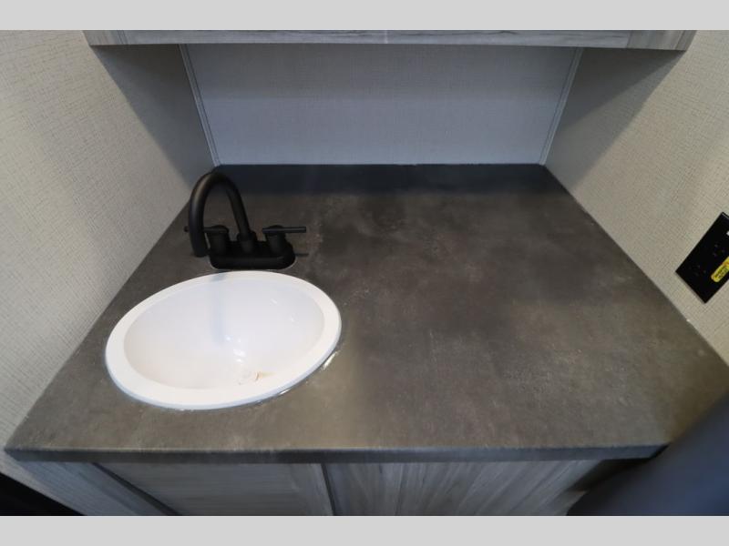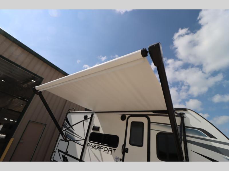 The Passport SL travel trailers by Keystone RV come in a compact design with travel-friendly lengths that are lightweight and easy to tow behind many smaller crossover SUVs. You will find several residential-style features such as durable Armstrong vinyl flooring, upgraded window treatments and valances, and bathroom countertops. The exterior shower with hot and cold water is very useful as you get cleaned up before entering the RV, wash your pets, or even rinse a few dishes outside. The Passport also now contains a HyperDeck flooring system which is a high-performance, water-resistant RV floor that comes as a breakthrough design from the Keystone Innovation Lab. This flooring is more resilient, stronger, and lighter than traditional laminated wood construction.