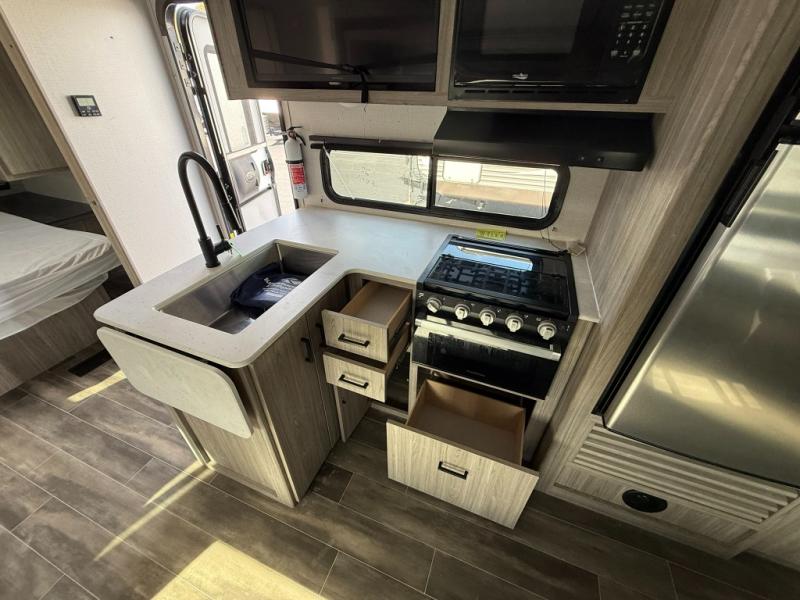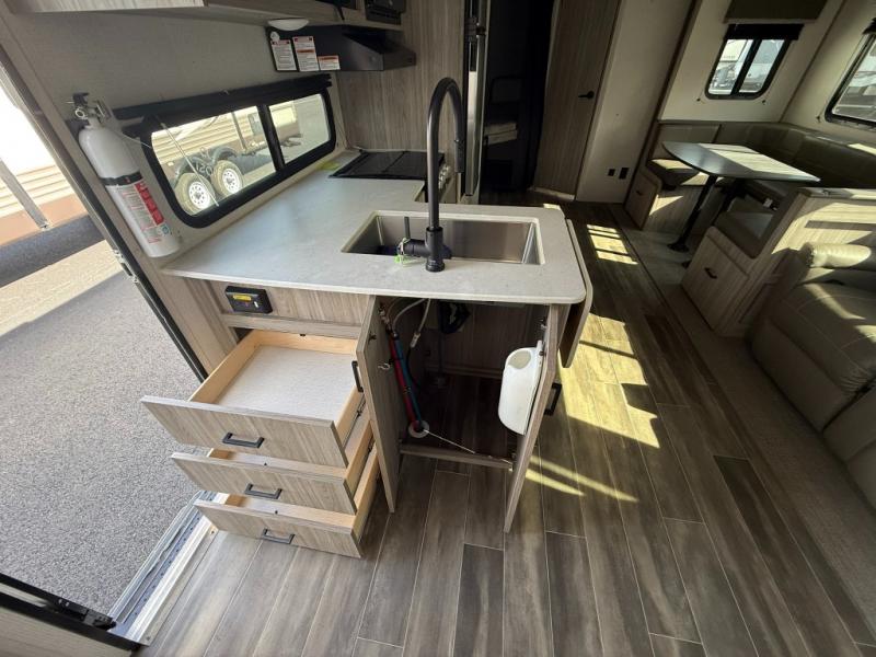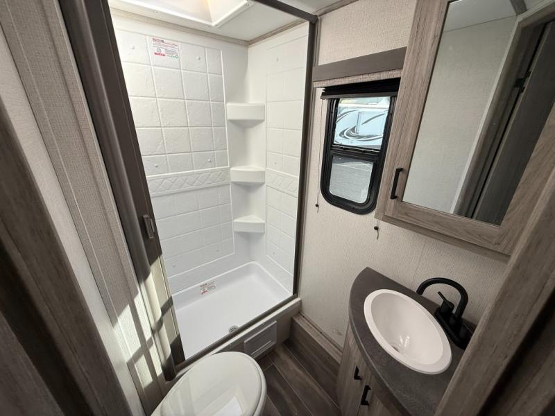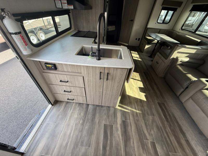 The Passport SL travel trailers by Keystone RV come in a compact design with travel-friendly lengths that are lightweight and easy to tow behind many smaller crossover SUVs. You will find several residential-style features such as durable Armstrong vinyl flooring, upgraded window treatments and valances, and bathroom countertops. The exterior shower with hot and cold water is very useful as you get cleaned up before entering the RV, wash your pets, or even rinse a few dishes outside. The Passport also now contains a HyperDeck flooring system which is a high-performance, water-resistant RV floor that comes as a breakthrough design from the Keystone Innovation Lab. This flooring is more resilient, stronger, and lighter than traditional laminated wood construction.