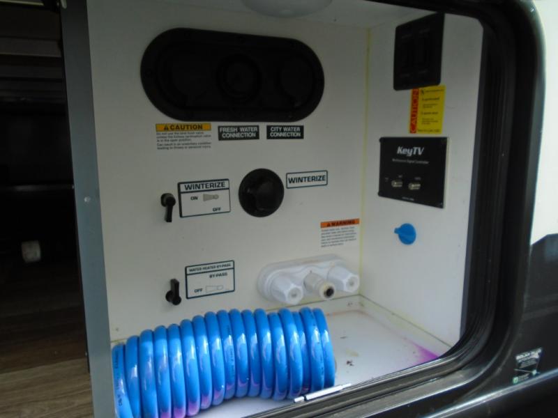 This travel trailer will be your home away from home! It features a front private bedroom with a queen bed that has wardrobes on either side and a laundry chute that leads directly to the exterior pass-through storage area. Take an afternoon nap on the 68" tri-fold sofa or enjoy a fire in the electric fireplace and watch a movie with the LCD TV at the entertainment center. Grab a snack from one of the two pantries and play some card games at the dream dinette. The kitchen island will make meal prepping easier and you can even cook dinner while breathing in some fresh air while you cook at the outside kitchen. There is also a full rear bathroom with a radius shower to rinse the sand out of your hair!
