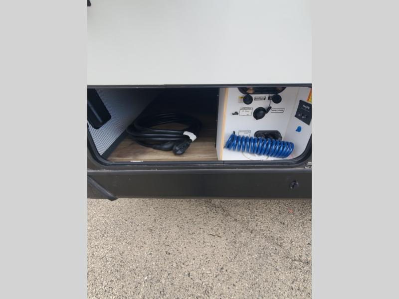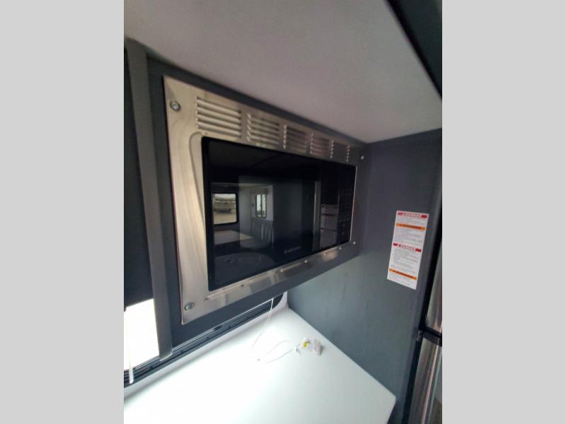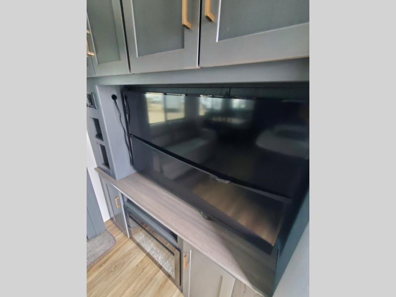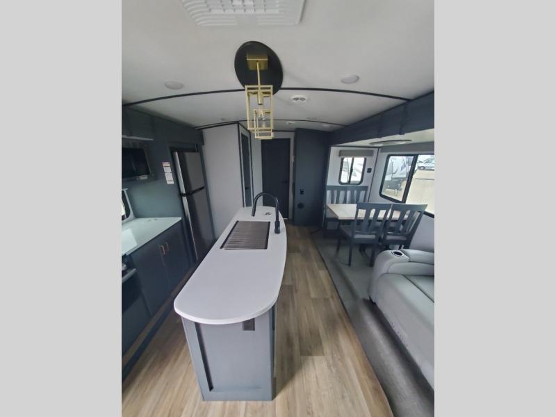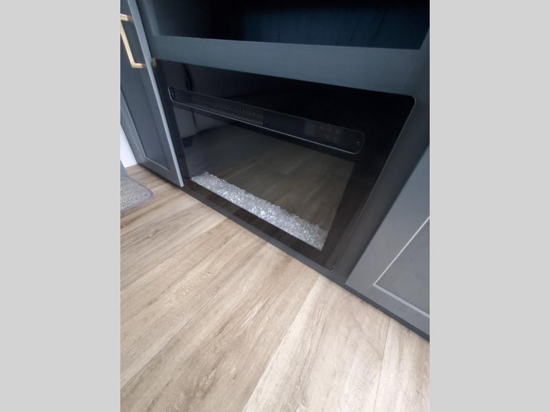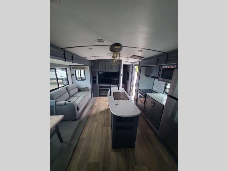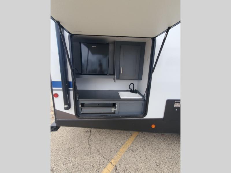This travel trailer will be your home away from home! It features a front private bedroom with a queen bed that has wardrobes on either side and a laundry chute that leads directly to the exterior pass-through storage area. Take an afternoon nap on the 68" tri-fold sofa or enjoy a fire in the electric fireplace and watch a movie with the LCD TV at the entertainment center. Grab a snack from one of the two pantries and play some card games at the dream dinette. The kitchen island will make meal prepping easier and you can even cook dinner while breathing in some fresh air while you cook at the outside kitchen. There is also a full rear bathroom with a radius shower to rinse the sand out of your hair!