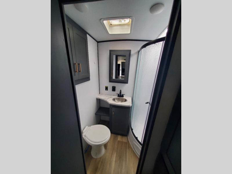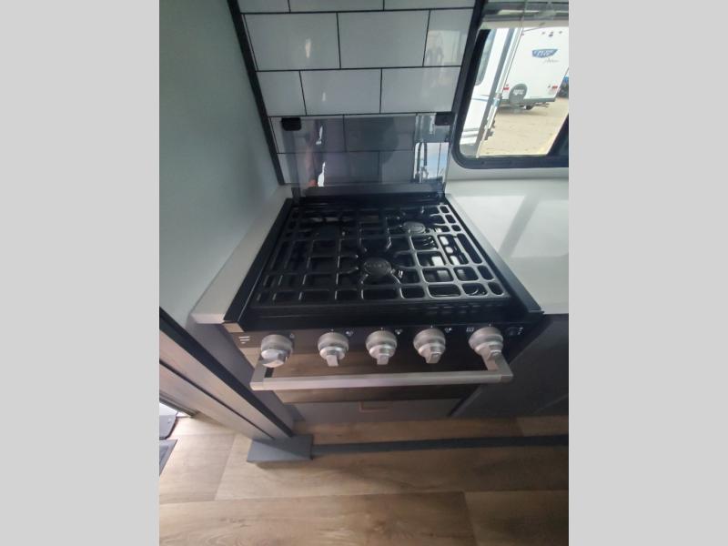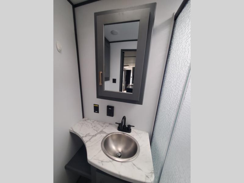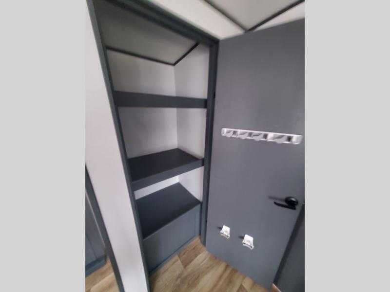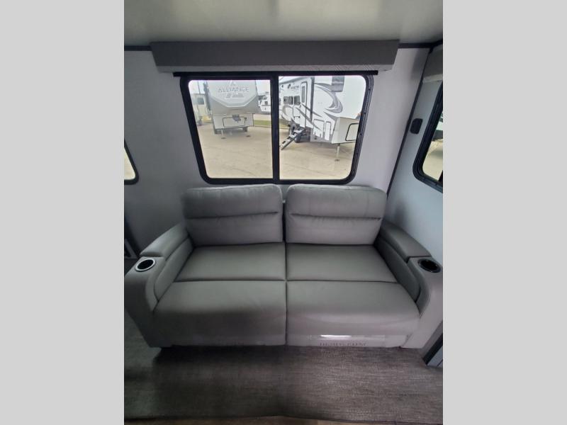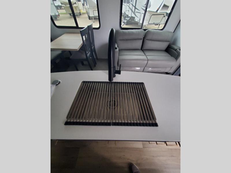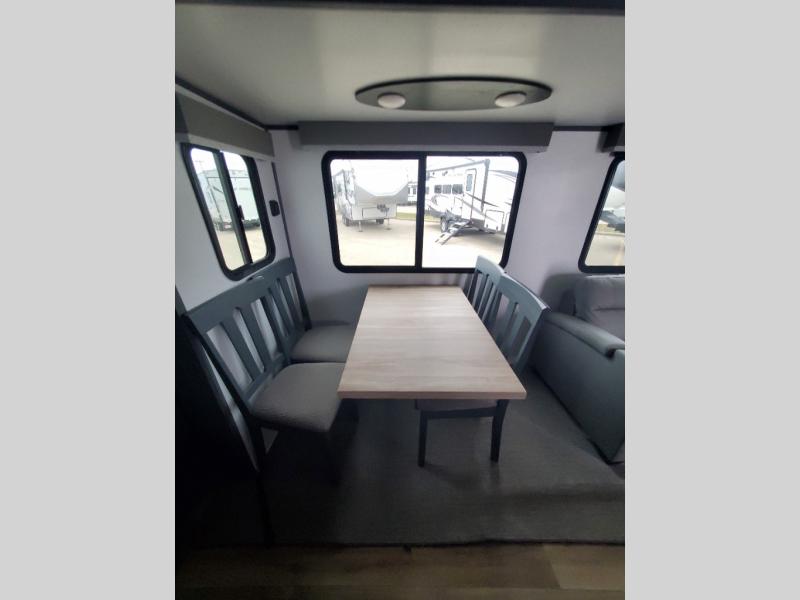 This travel trailer will be your home away from home! It features a front private bedroom with a queen bed that has wardrobes on either side and a laundry chute that leads directly to the exterior pass-through storage area. Take an afternoon nap on the 68" tri-fold sofa or enjoy a fire in the electric fireplace and watch a movie with the LCD TV at the entertainment center. Grab a snack from one of the two pantries and play some card games at the dream dinette. The kitchen island will make meal prepping easier and you can even cook dinner while breathing in some fresh air while you cook at the outside kitchen. There is also a full rear bathroom with a radius shower to rinse the sand out of your hair!
