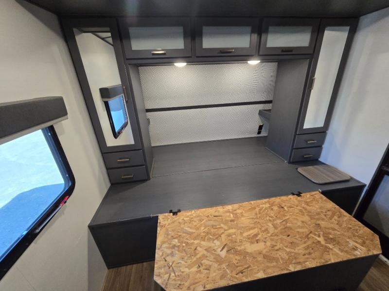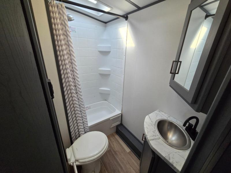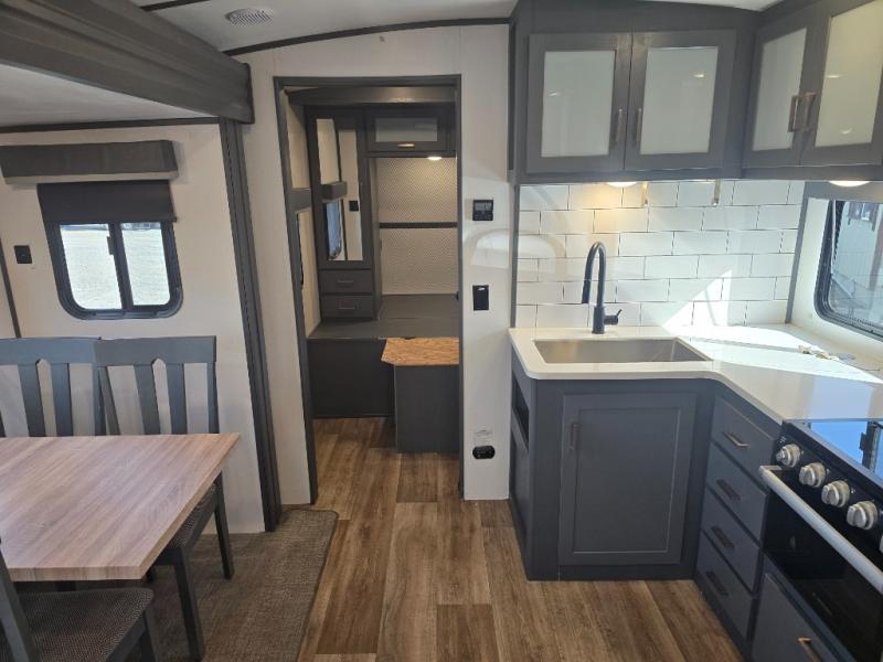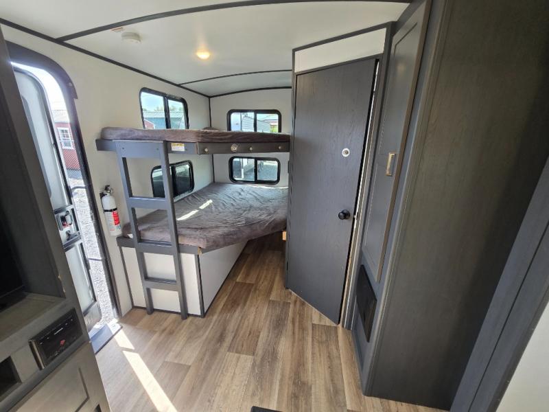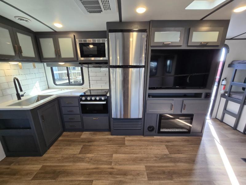 The whole family will have a fun time camping in this travel trailer! The kiddos or guests can sleep on the set of double bunk beds with a flip up bunk for added storage and you can sleep on the queen bed inside the front private bedroom. The dream dinette and 68" tri-fold sofa can also transform into extra sleeping spaces. If you don't like those two features then you can easily switch them out for the optional luxury cinema recliners and optional free standing dinette. Prepare your meals either indoors with the three burner Furrion gas range or outdoors with the outside kitchen that has a two burner cooktop, a sink, a mini refrigerator, and an overhead cabinet. After a fun day of playing outside, wash off in the rear corner bathroom with the full tub/shower with built-in shelves for your shampoo and a skylight above for natural lighting!