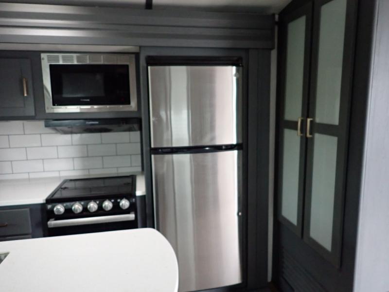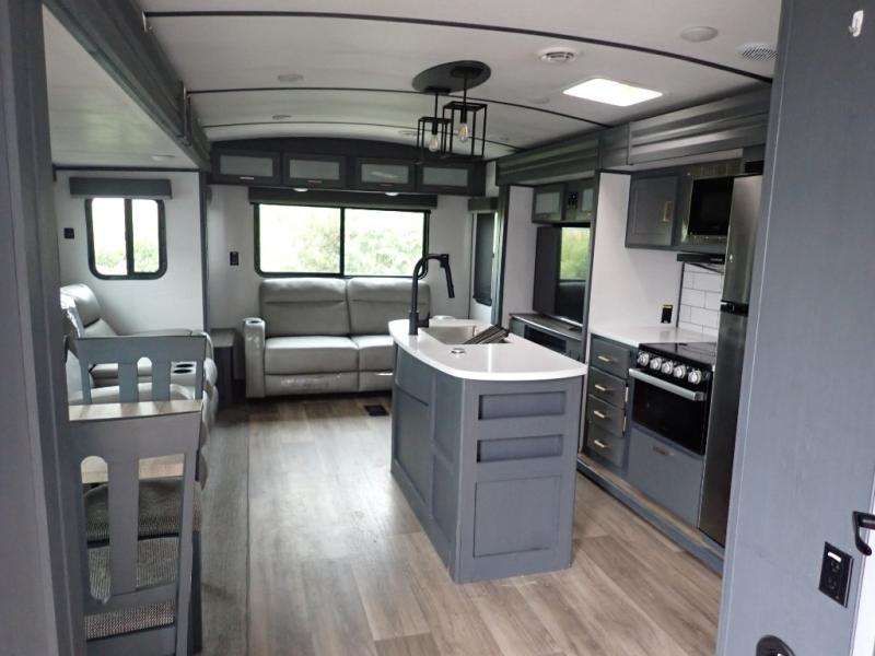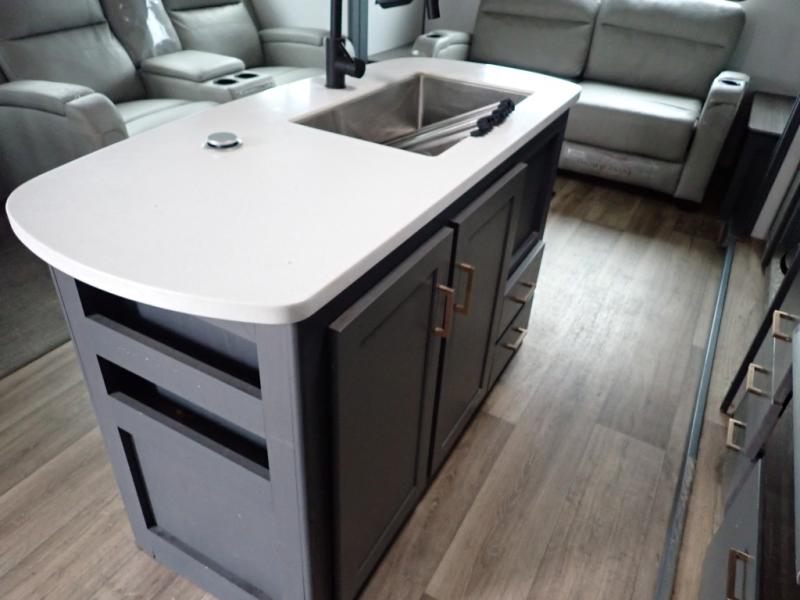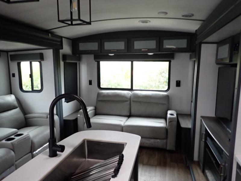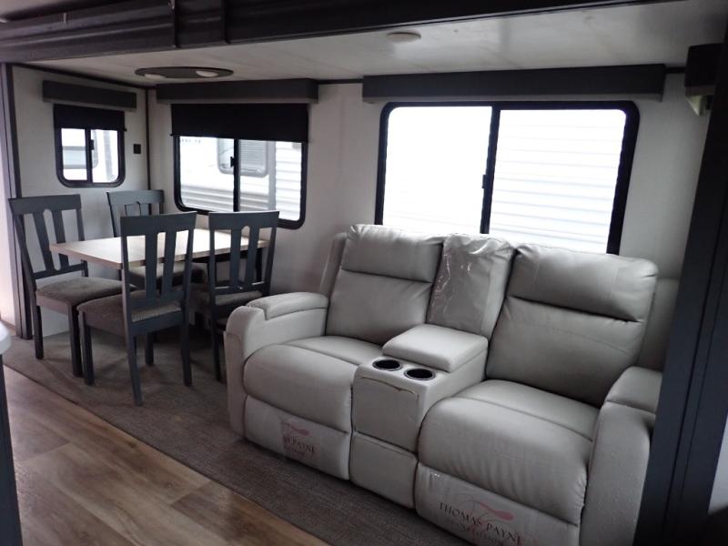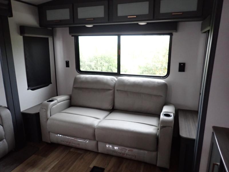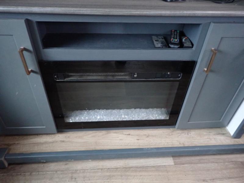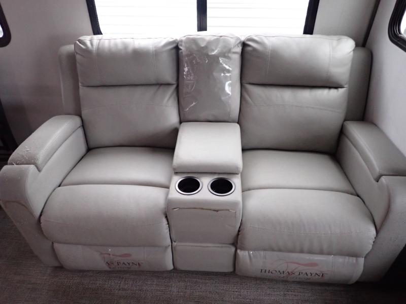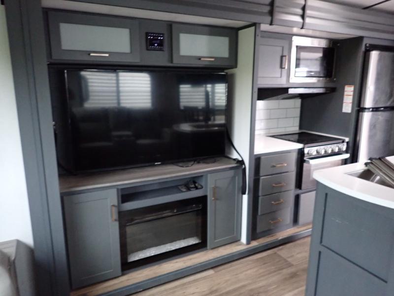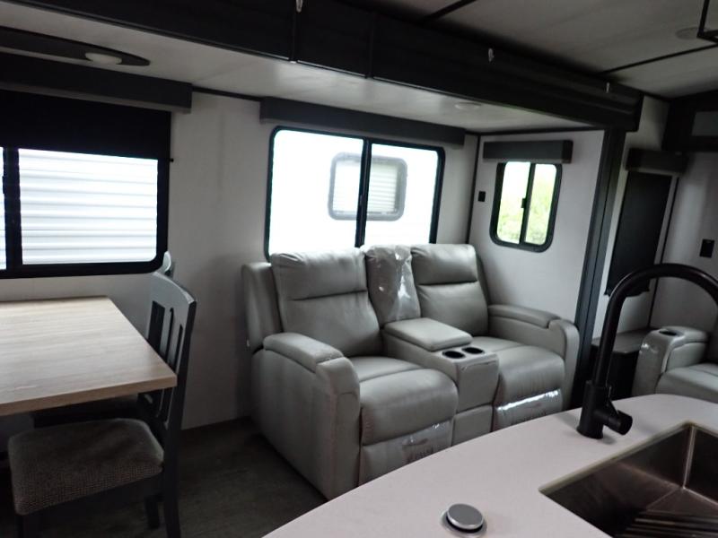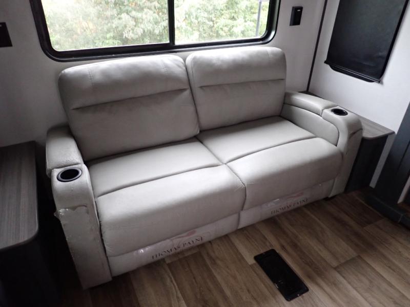 Start camping in true luxury with this travel trailer! You will feel right at home in the private bedroom with the queen bed slide across from the dresser and a front walk-in closet to keep your clothes looking their best, plus an entrance into the dual entry bathroom which has a radius shower to freshen up in each morning. There is a kitchen island to make meal prepping easy and a three burner Furrion gas range to fry up some bacon in the mornings. Enjoy your meals at the dream dinette and even transform it into an extra sleeping space. The rear living area is the perfect place to wind down your nights by relaxing on the 68" tri-fold sofa and the luxury cinema recliners across from the entertainment center with a fireplace and a LCD TV to watch your favorite movies!