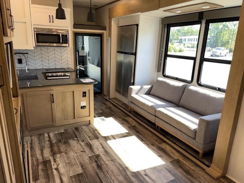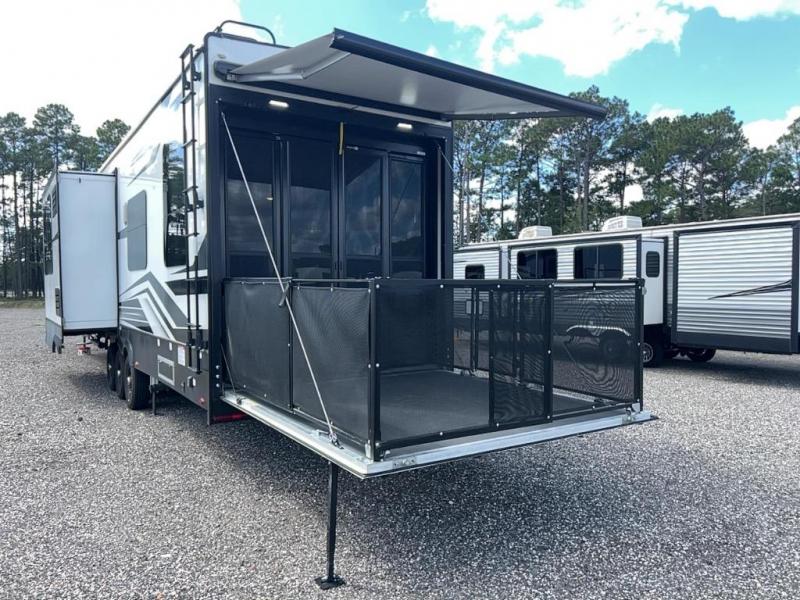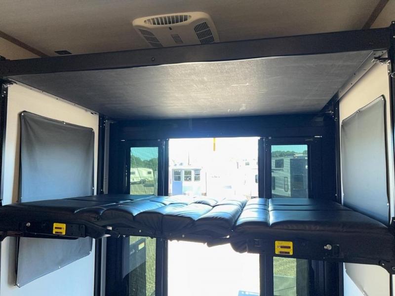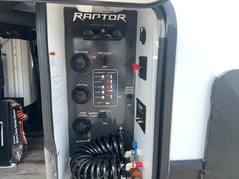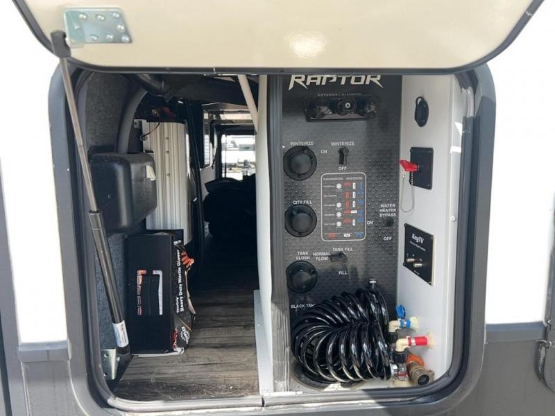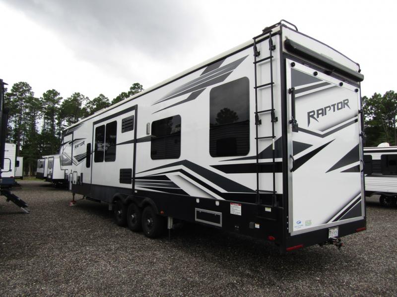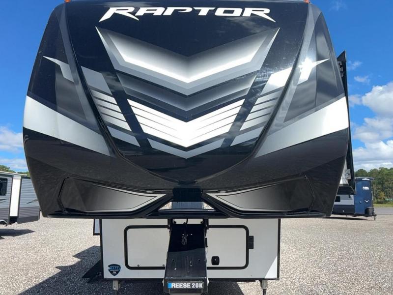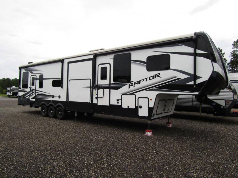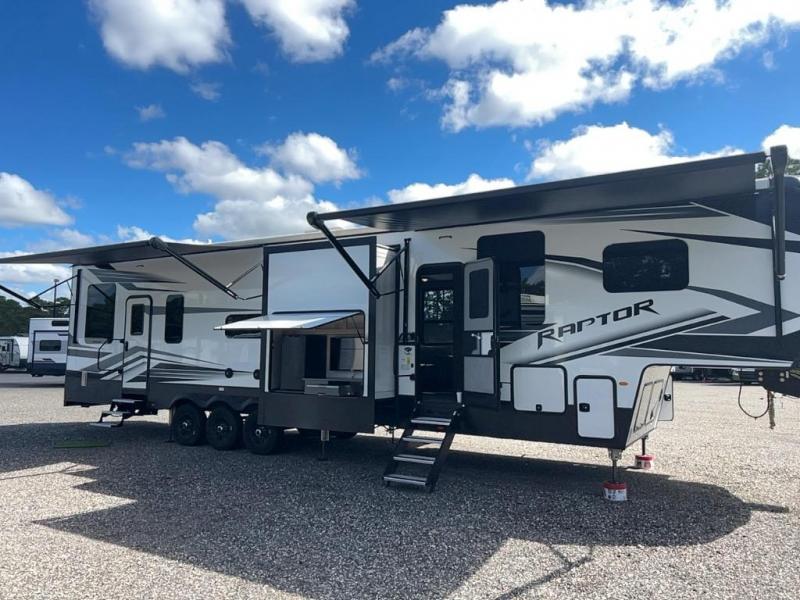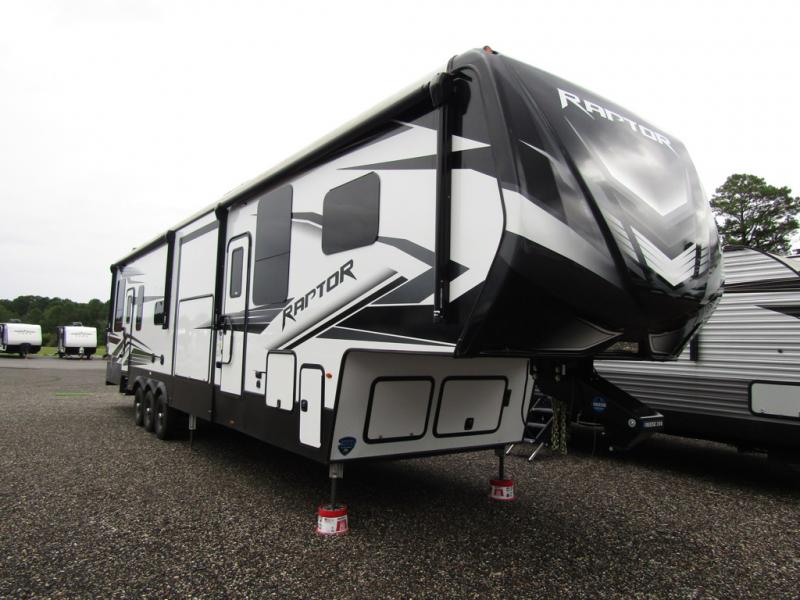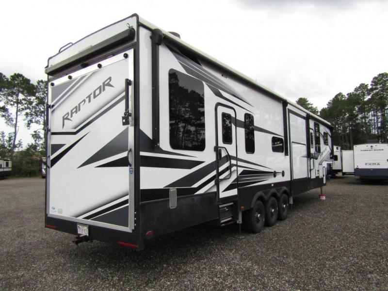 Experience a breath of fresh air with one of these Keystone RV Raptor fifth wheel toy haulers! Their rugged construction consists of a walkable one-piece Alpha Super Flex TPO roof with aluminum flashing, G-rated tires, Dyna Span floor decking, and frame-welded tie downs to keep your toys in place as you travel. With an on-demand water heater, you can have an endless amount of hot water when you need it. Some unexpected conveniences you will appreciate include an Omni-Chill A/C system to keep you cool on those hot summer days, a Furrion backup camera and HitchVision to prevent damages, and a Generation 3 iN-Command smart automation system with Global Command to make life easier. Soft-close hardwood cabinetry makes for a quiet closure to enjoy undetected late night snacking, and the MORryde zero-gravity ramp door makes it easy to load an unload your toys. Come find the right one for you today!