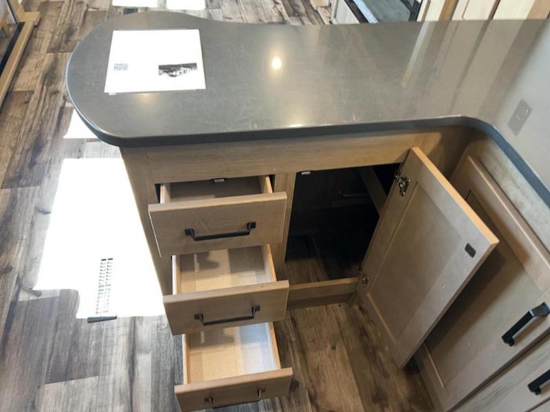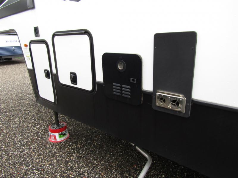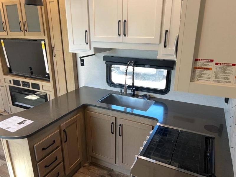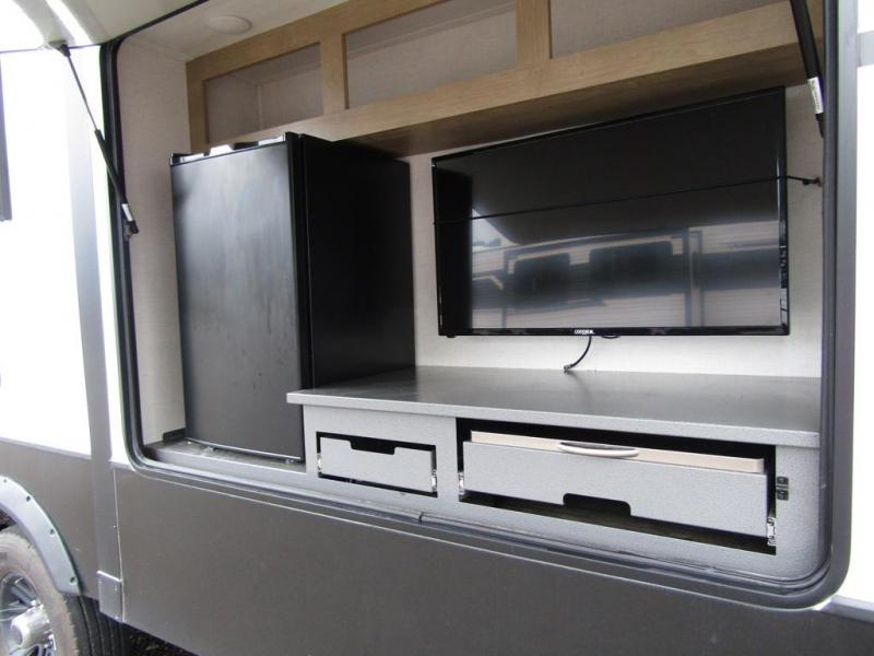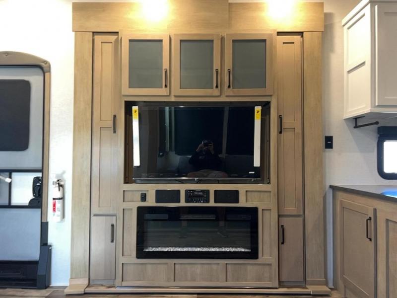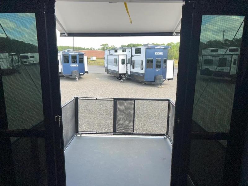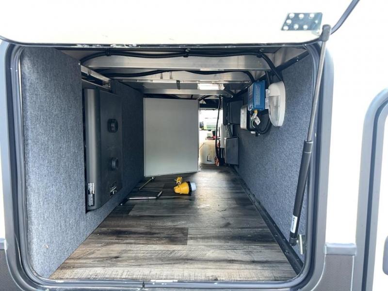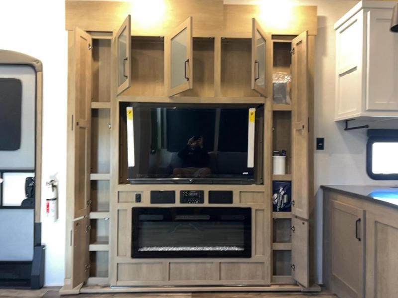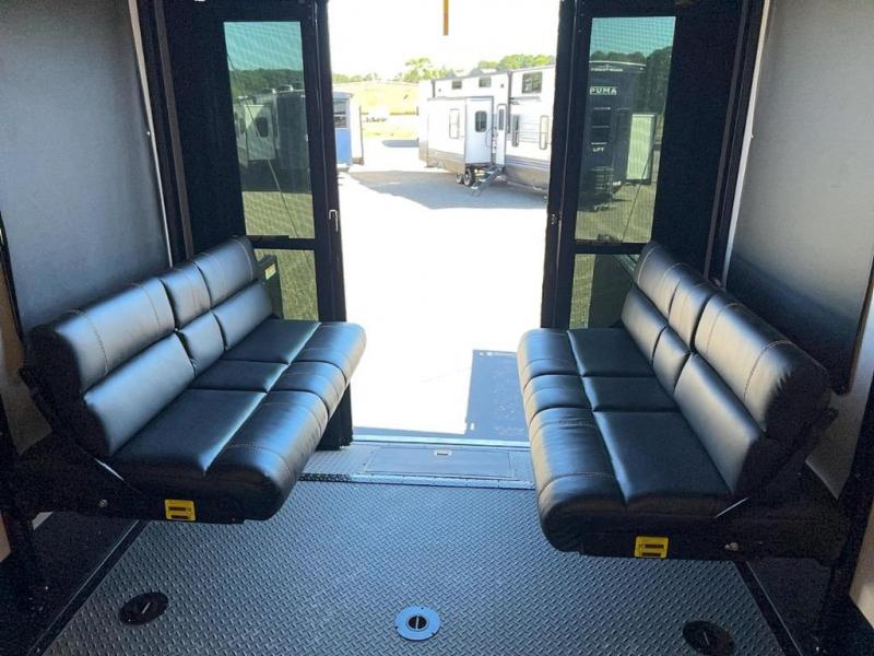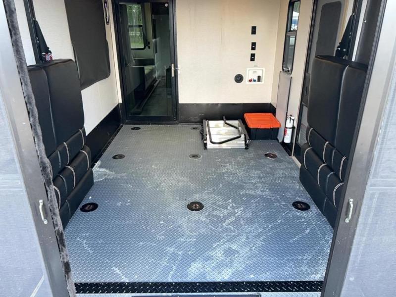 Don't pass up your chance to camp in true luxury with this toy hauler! You can bring your toys along with a 13' garage area and once you arrive you can set up the electric bed above dual opposing sofas with a table in between for meal times and the loft with twin bed, plus there is one of the dual entry doors to the unit and an area prepped to add an optional washer and dryer. Prepare your meals either indoors at the U-shaped kitchen with a three burner cooktop or head outdoors to use the exterior pull-out kitchen while watching the big game on the outside TV. When mother nature rains on your parade, relax on either the connected two recliners or the 3-seat recliner across from the entertainment center with a fireplace and 50" LED TV. Easily access the shower in the dual entry bathroom and enjoy the convenience of it leading directly into the front private bedroom which has a residential queen bed to lay your head on at night and a wardrobe slide!