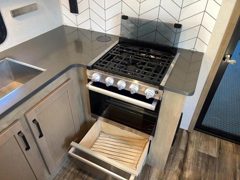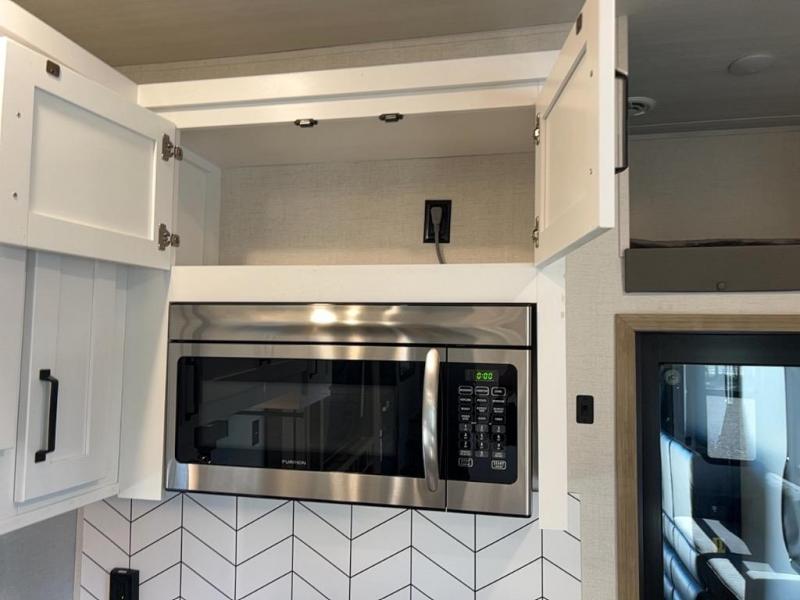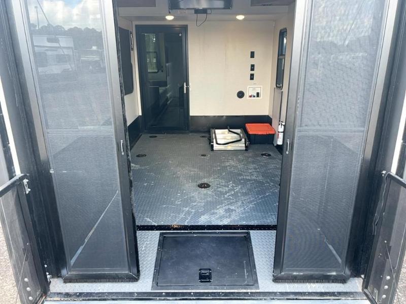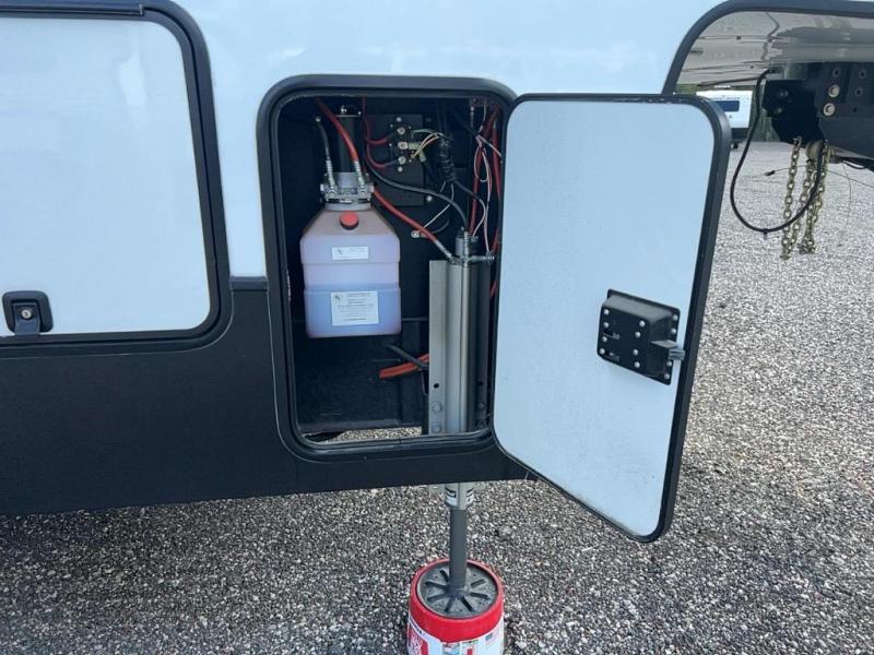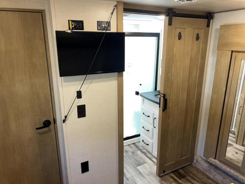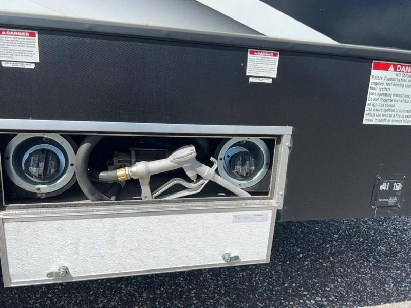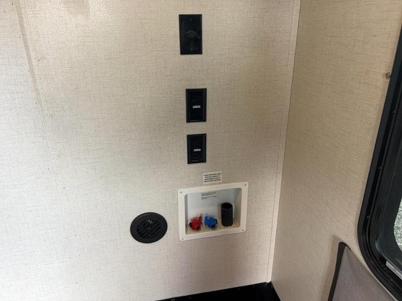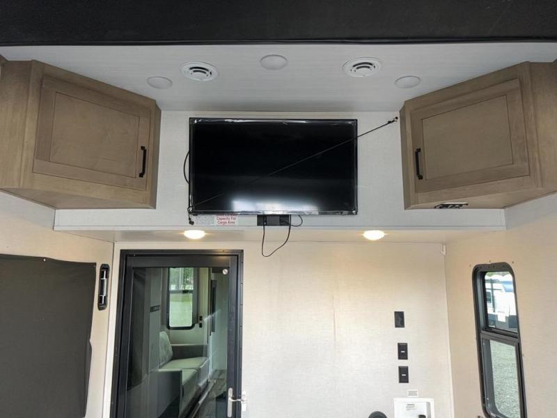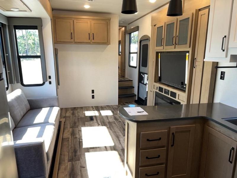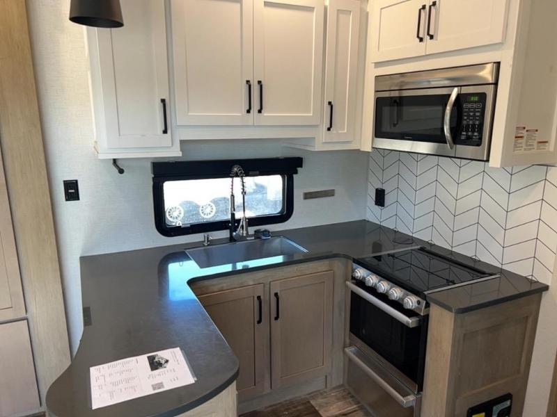 Don't pass up your chance to camp in true luxury with this toy hauler! You can bring your toys along with a 13' garage area and once you arrive you can set up the electric bed above dual opposing sofas with a table in between for meal times and the loft with twin bed, plus there is one of the dual entry doors to the unit and an area prepped to add an optional washer and dryer. Prepare your meals either indoors at the U-shaped kitchen with a three burner cooktop or head outdoors to use the exterior pull-out kitchen while watching the big game on the outside TV. When mother nature rains on your parade, relax on either the connected two recliners or the 3-seat recliner across from the entertainment center with a fireplace and 50" LED TV. Easily access the shower in the dual entry bathroom and enjoy the convenience of it leading directly into the front private bedroom which has a residential queen bed to lay your head on at night and a wardrobe slide!