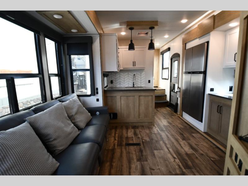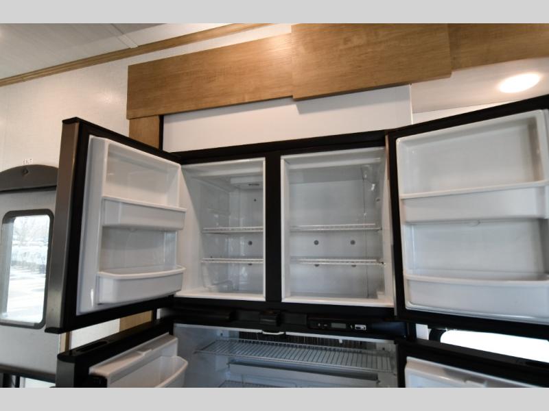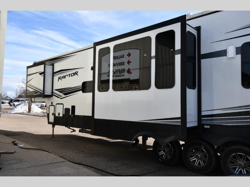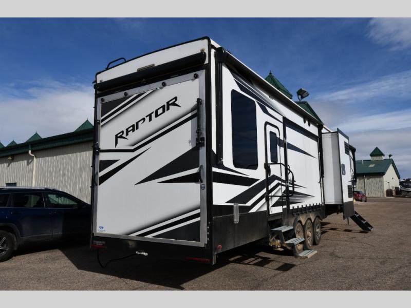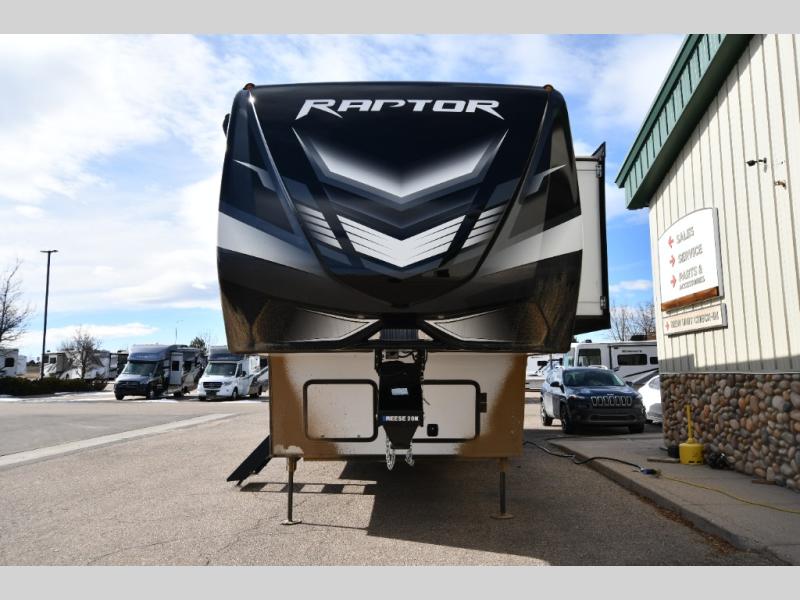 Experience a breath of fresh air with one of these Keystone RV Raptor fifth wheel toy haulers! Their rugged construction consists of a walkable one-piece Alpha Super Flex TPO roof with aluminum flashing, G-rated tires, Dyna Span floor decking, and frame-welded tie downs to keep your toys in place as you travel. With an on-demand water heater, you can have an endless amount of hot water when you need it. Some unexpected conveniences you will appreciate include an Omni-Chill A/C system to keep you cool on those hot summer days, a Furrion backup camera and HitchVision to prevent damages, and a Generation 3 iN-Command smart automation system with Global Command to make life easier. Soft-close hardwood cabinetry makes for a quiet closure to enjoy undetected late night snacking, and the MORryde zero-gravity ramp door makes it easy to load an unload your toys. Come find the right one for you today!