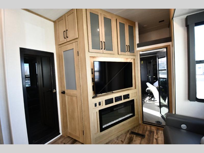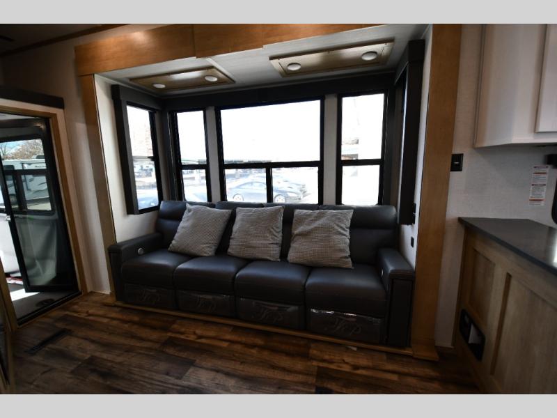 You will be the talk of the campground with a 118" side patio and outside TV on this toy hauler! As you enter the 13' garage area, you will notice an electric bed above dual opposing sofas with a table in between for meals or games, a loft with twin bed, a half bathroom, and even an area prepped to add an optional washer and dryer. The 4-seat recliner slide is across from the entertainment center with a 50" LED TV and fireplace for a cozy evening indoors. Prepare your best meals with the three burner cooktop in the U-shaped kitchen and freshen up each morning in the dual entry bathroom with the shower. The bathroom also leads directly into the front private bedroom which has a residential queen bed that can be switched out for an optional Raptor king bed, wireless phone chargers on either side of it, and a wardrobe slide to keep your clothes looking their best!